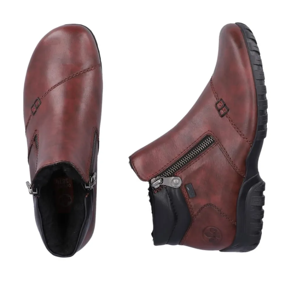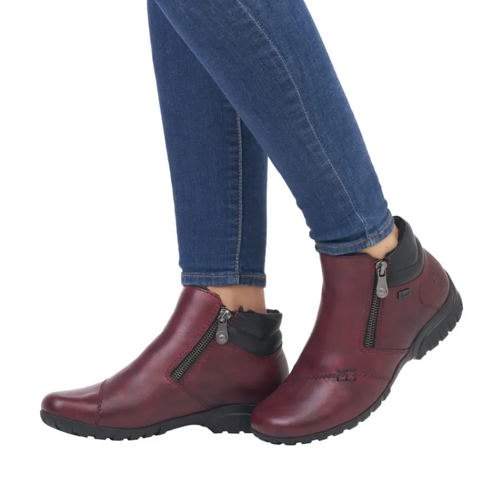 Rieker støvle til dame i bordeaux. Flot støvle i bordeaux skind med fine detaljer, der giver et stilfuldt udtryk. Modellen har to funktionelle lynlåse, som gør den nem at tage af og på. Indvendigt finder du en varm foring samt en blød udtagelig sål, der giver høj komfort hele dagen. Mens Rieker-Tex gør støvlen kraftig vandafvisende, og den mønstrede ydersål øger både stødabsorbering og skridsikkerhed.