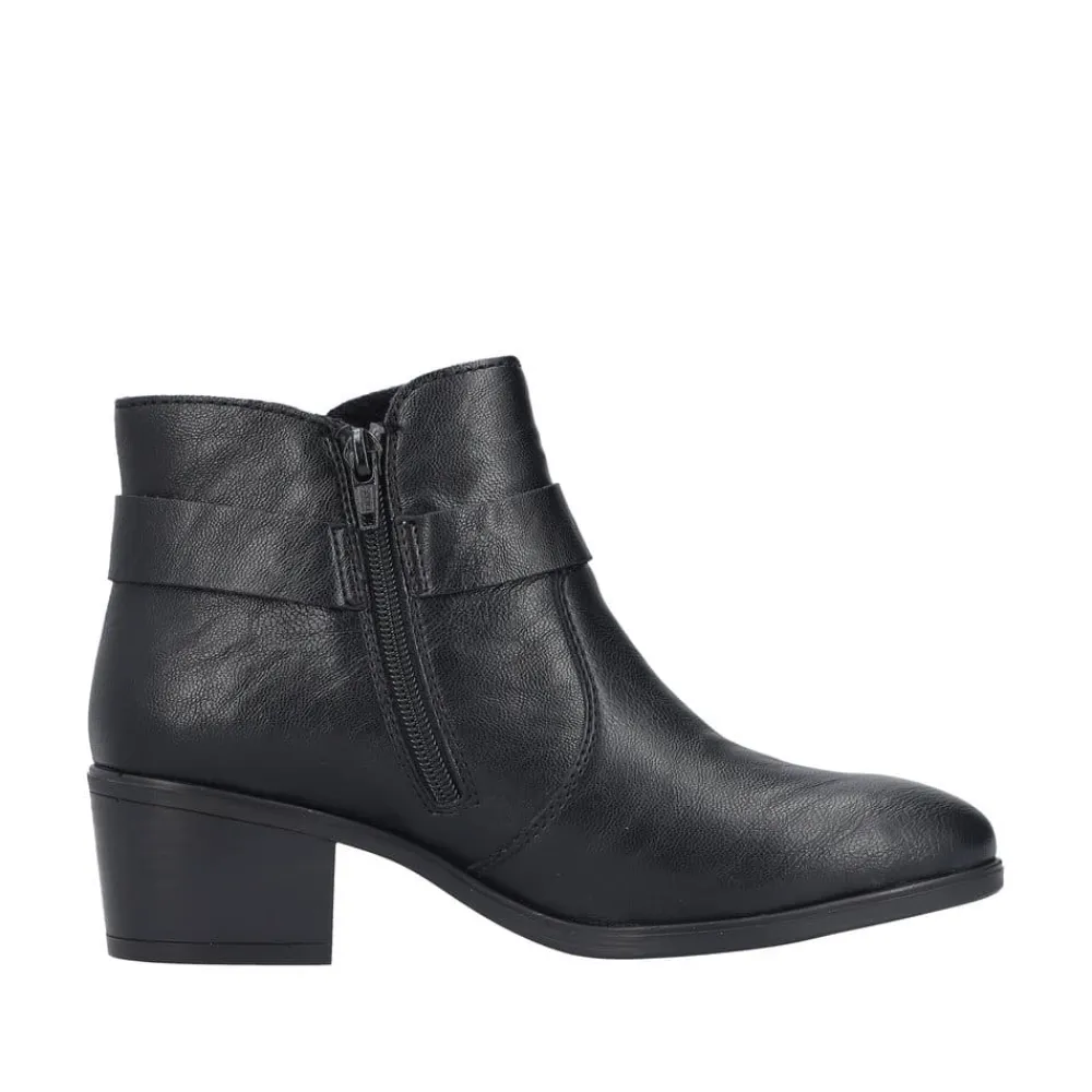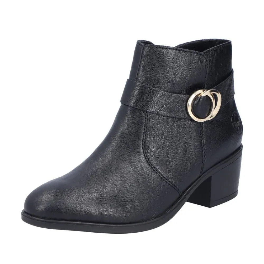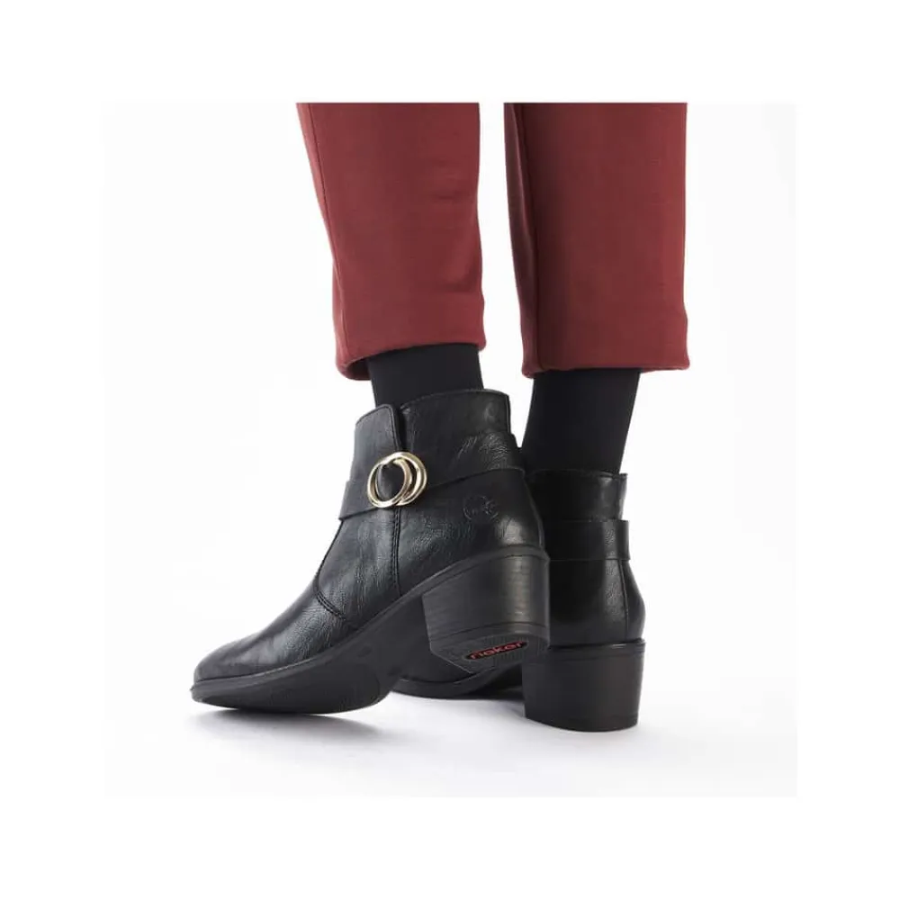 Rieker støvle til dame i sort. Oplev en elegant ankelstøvle, der kombinerer stil og komfort til perfektion. Modellen har en sort overdel med dekorative syninger og et smukt spænde omkring anklen, som tilføjer et stilfuldt udtryk. Indvendigt sikrer en blød indersål og en let foring, at støvlen føles behagelig hele dagen. Med Rieker Antistress er den både let, fleksibel og udstyret med effektiv stødabsorbering, så hvert skridt føles ekstra behageligt. Den 5 cm høje blokhæl giver et elegant løft uden at gå på kompromis med komforten.