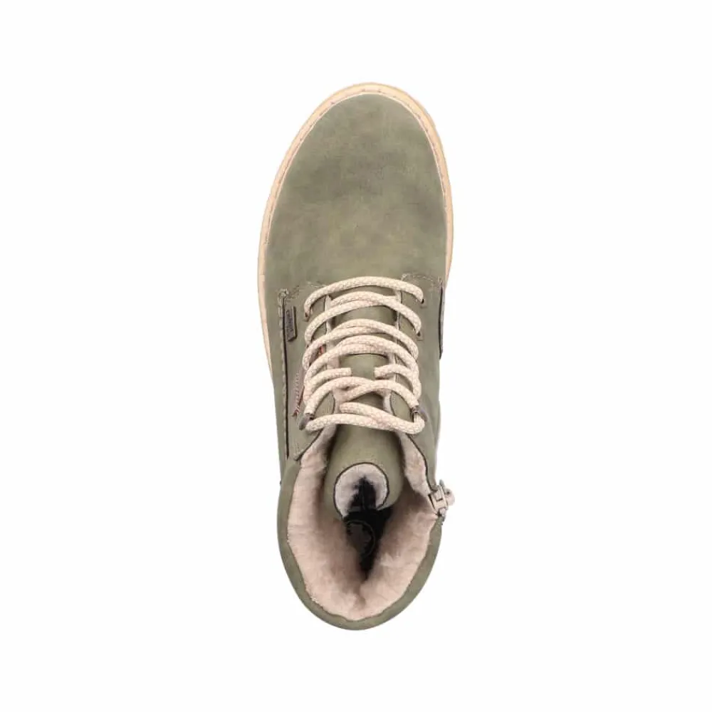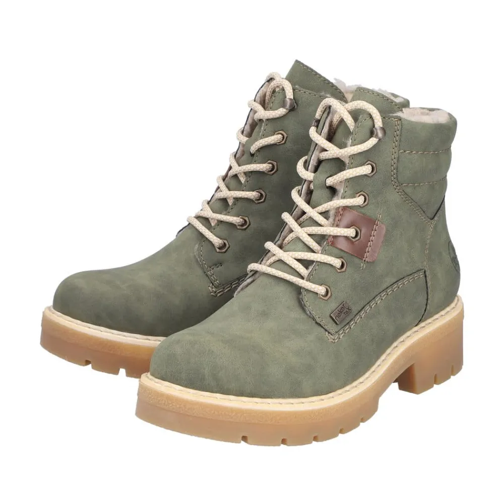 Rieker støvle til dame i grøn. Smart støvle i en moderne grøn farve med fine detaljer, der giver et stilfuldt look. Støvlen har snørebånd foran, så pasformen nemt kan justeres, og en funktionel lynlås på indersiden, der gør den let at komme i og af. Indvendigt mødes du af en varm foring samt en blød og udtagelig indersål, som giver optimal komfort dagen lang. Støvlen er udstyret med Rieker-Tex, der giver kraftig vandafvisning, mens Rieker Antistress sikrer en let og fleksibel pasform. Ydersålen har stødabsorbering og et godt mønster for god skridsikkerhed, og blokhælen på ca. 4,5 cm giver både støtte og et elegant løft.