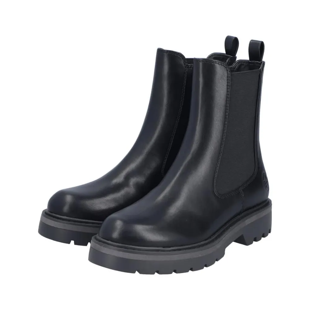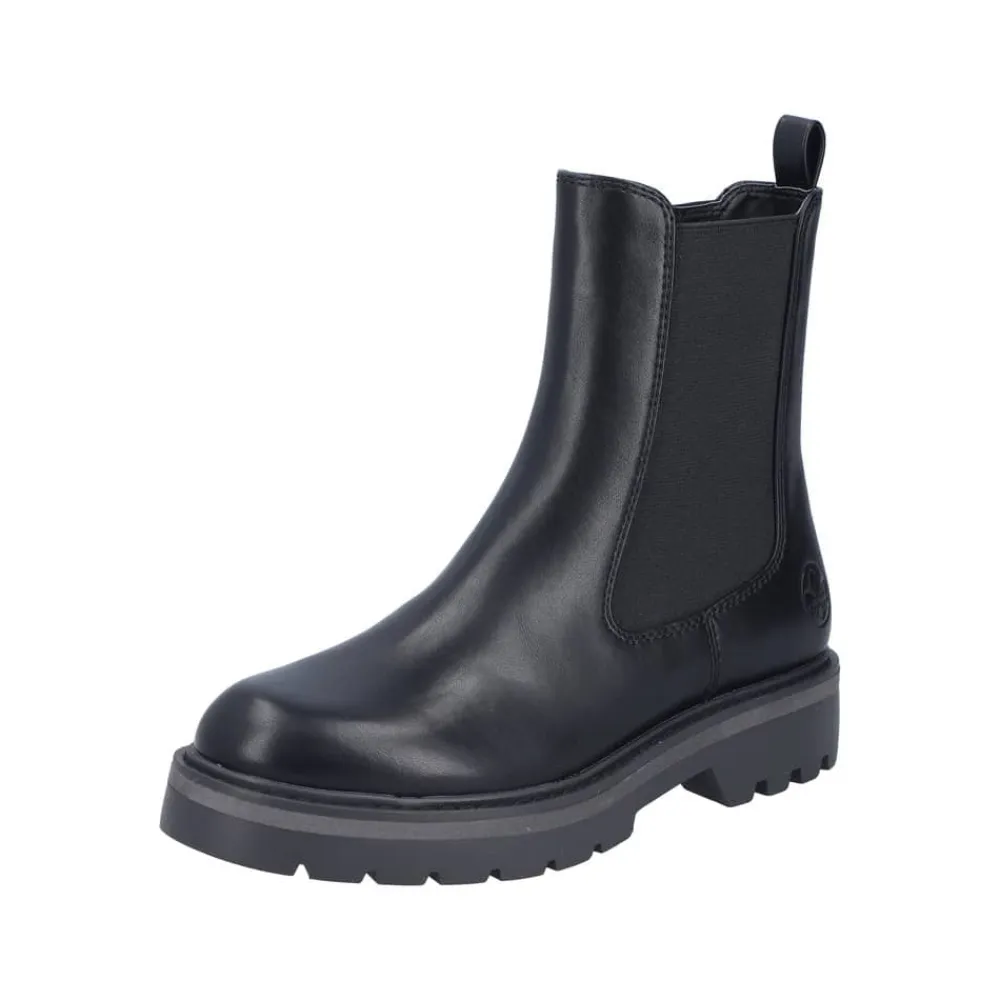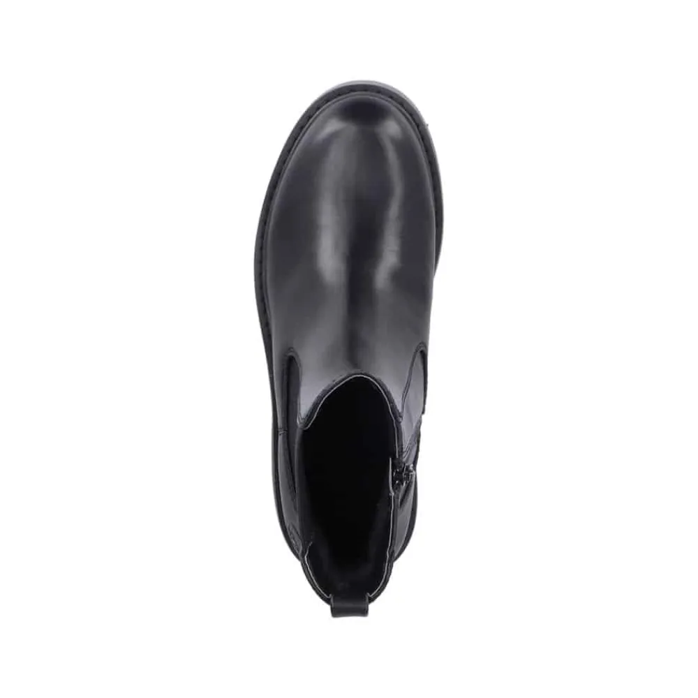 Rieker støvle til dame i sort. Smart vinterstøvle i sort med klassiske detaljer, der giver et stilfuldt look. Støvlen har en funktionel lynlås på indersiden, som gør den nem at tage af og på, samt en elastik på ydersiden, der sikrer en god og fleksibel pasform. Indvendigt finder du en varm foring og en blød indersål, som giver optimal komfort dagen igennem. Den chunky ydersål med mønster og stødabsorbering giver god støtte og øget skridsikkerhed.