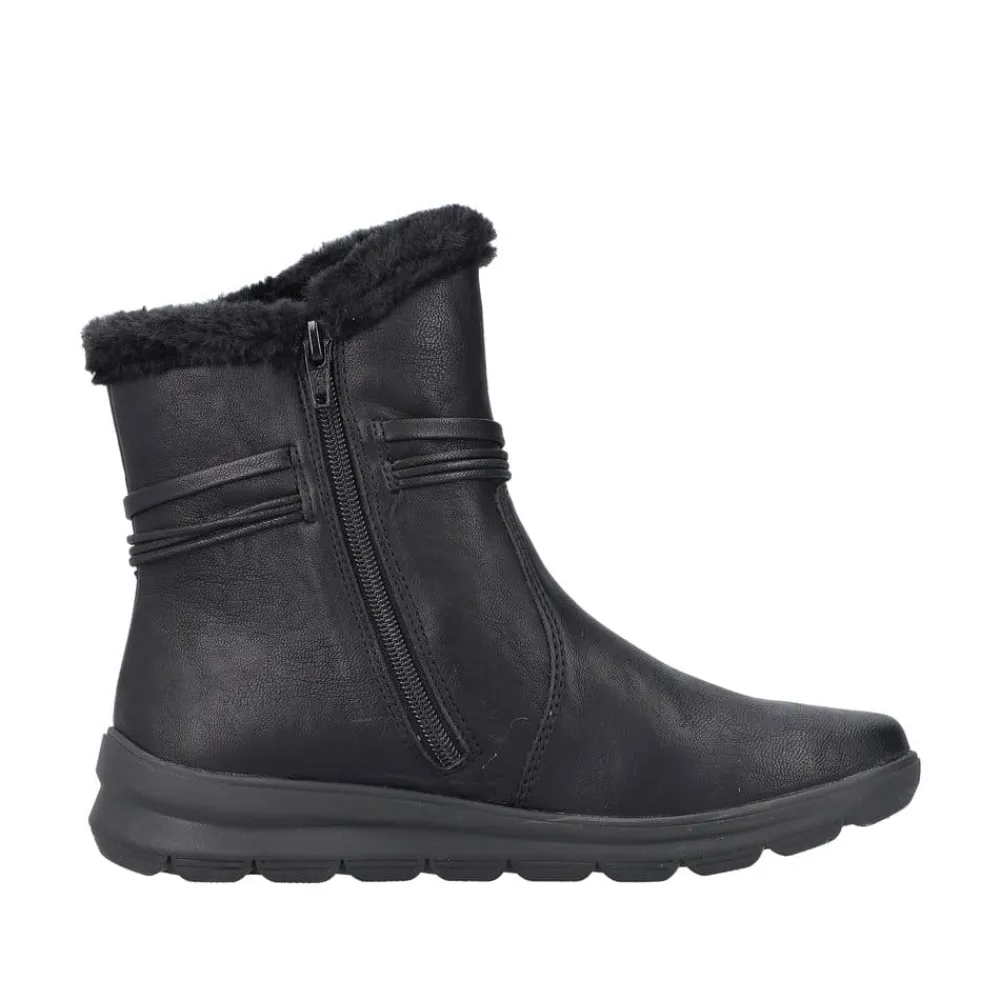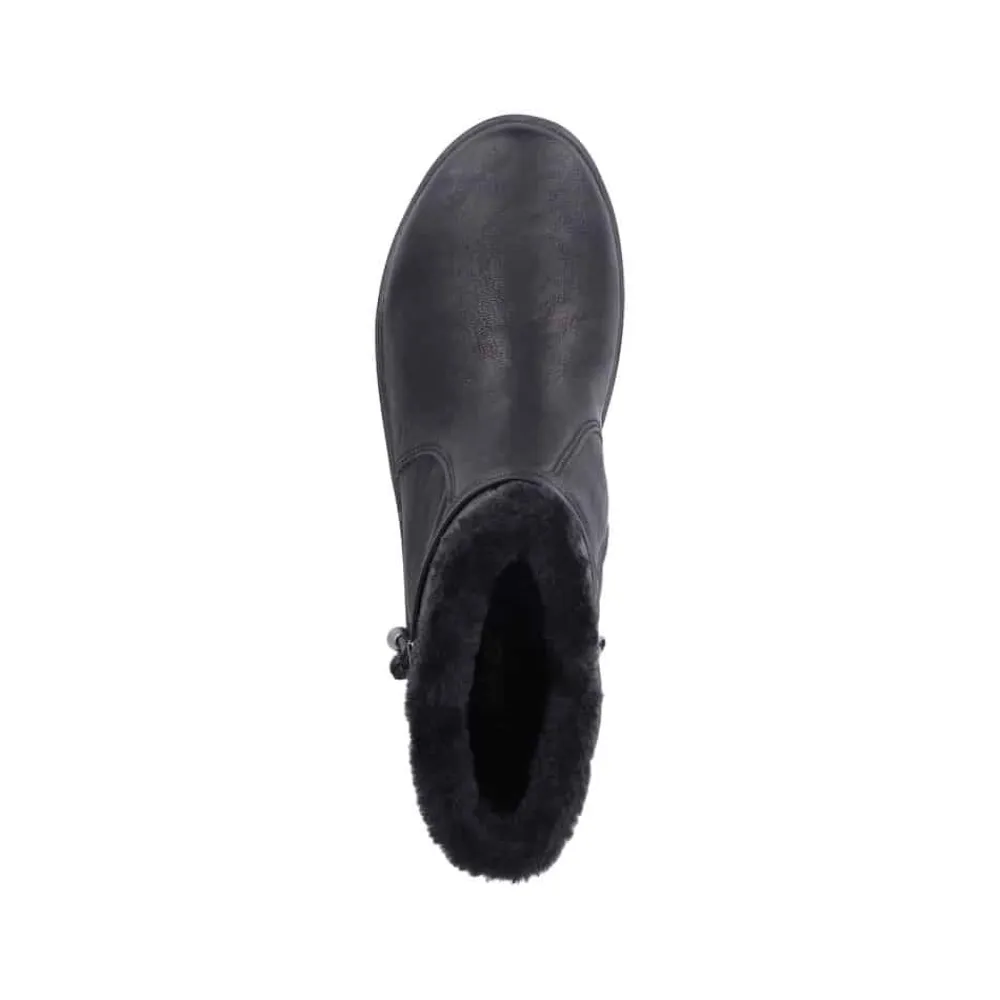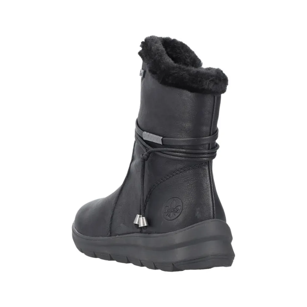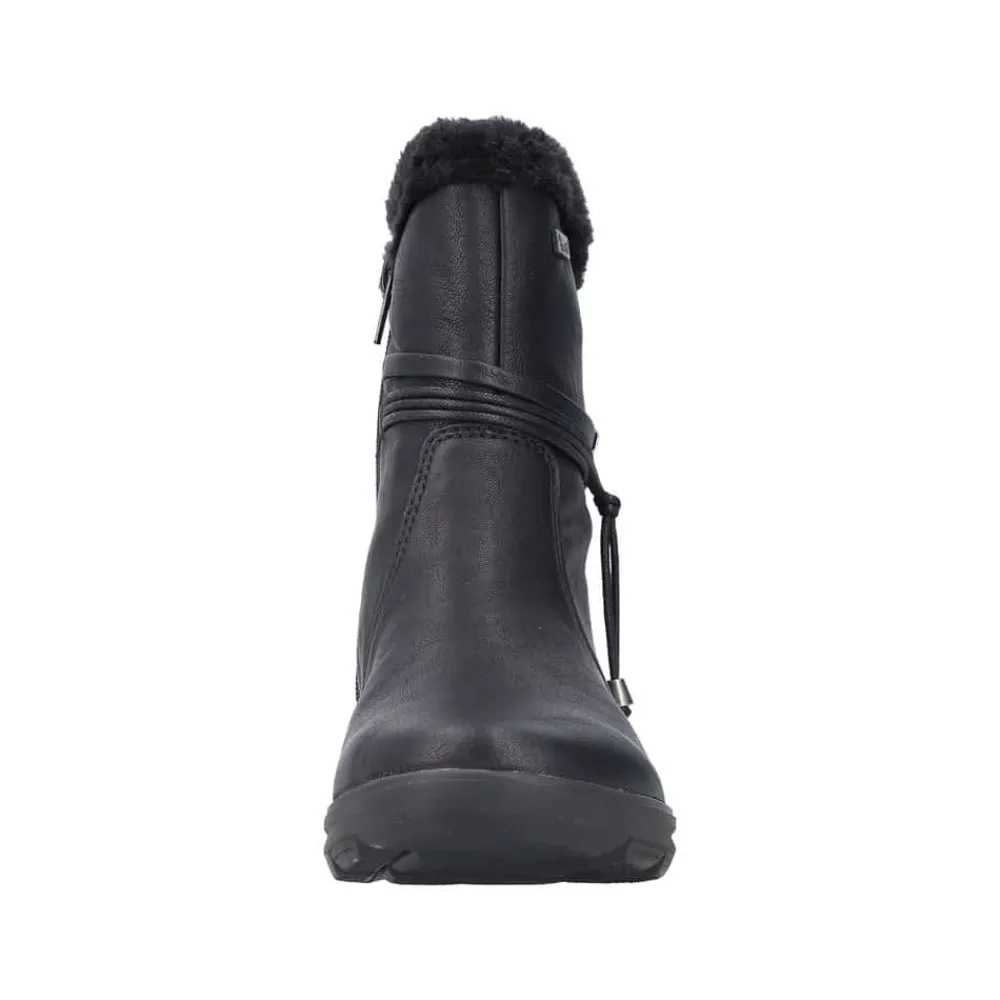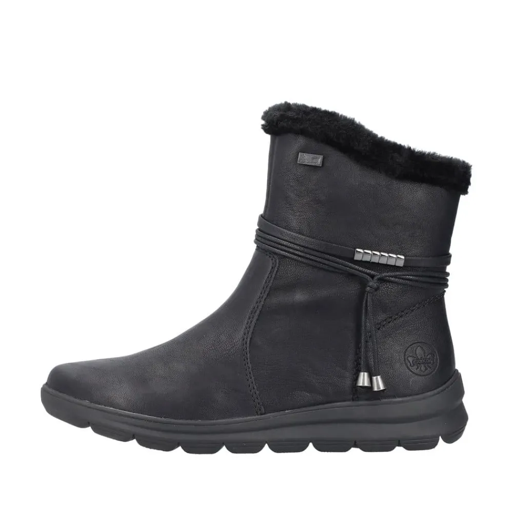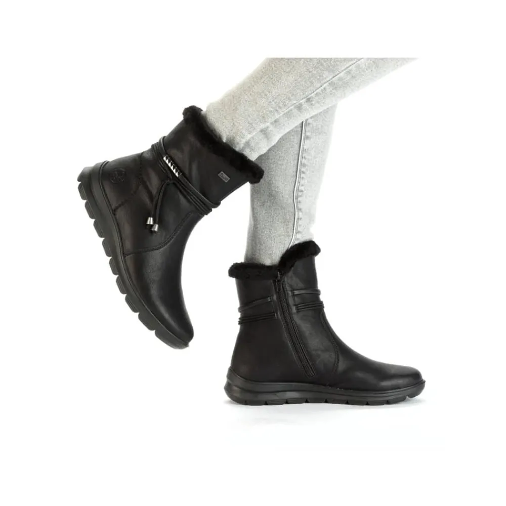 Rieker støvle til dame i sort. Stil og komfort mødes i disse sorte ankelstøvler til kvinder. Lynlåsen gør det nemt og hurtigt at tage støvlerne af og på, mens den pelsbeklædte kant giver et elegant touch. Indvendigt finder du en blød og udtagelig indersål samt en varm foring, der holder fødderne behageligt lune. Med Rieker Tex får du kraftig vandafvisning, og den stødabsorberende ydersål med et godt mønster giver øget støtte og skridsikkerhed.