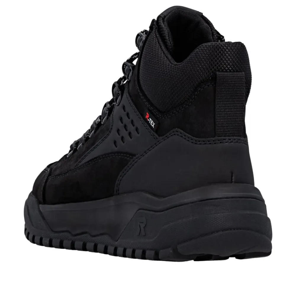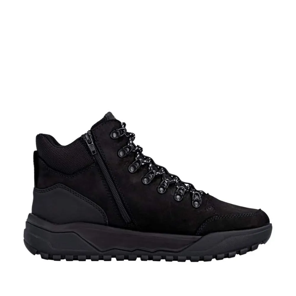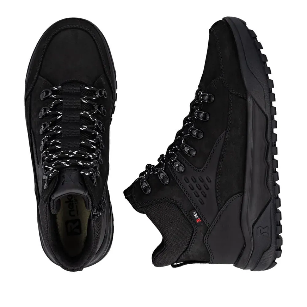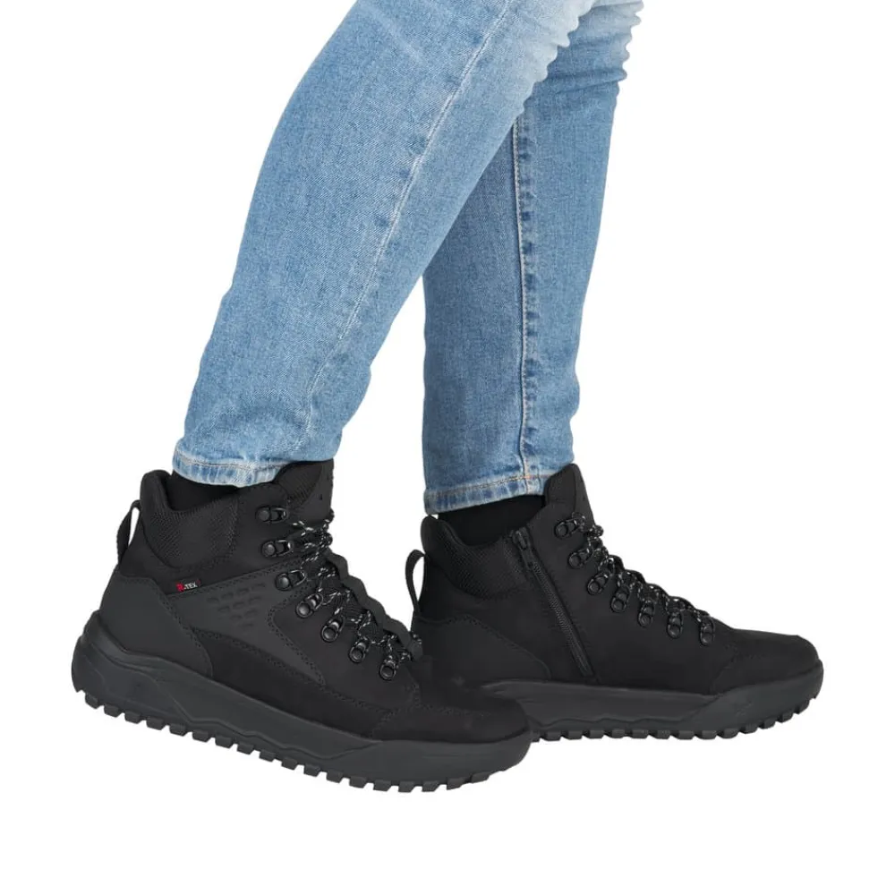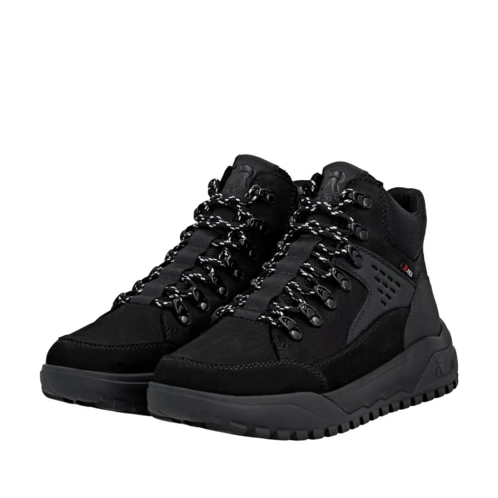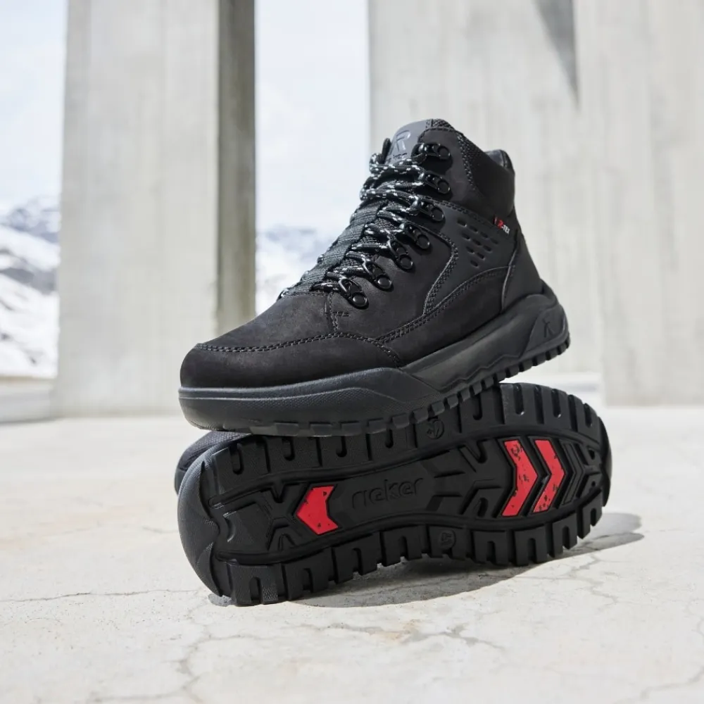 Rieker støvle til herre i sort. Denne støvle kombinerer design og komfort på bedste vis. Den har snørebånd og en funktionel lynlås, så du nemt kan tilpasse pasformen til din fod. Indvendigt finder du en blød Rieker-soft sål og en varm foring, der sikrer behagelig komfort hele dagen. Den ekstra bredde (G) giver mere rummelighed, mens Rieker-Tex gør støvlen kraftigt vandafvisende. Ydersålen med mønster giver øget stødabsorbering og god skridsikkerhed.
