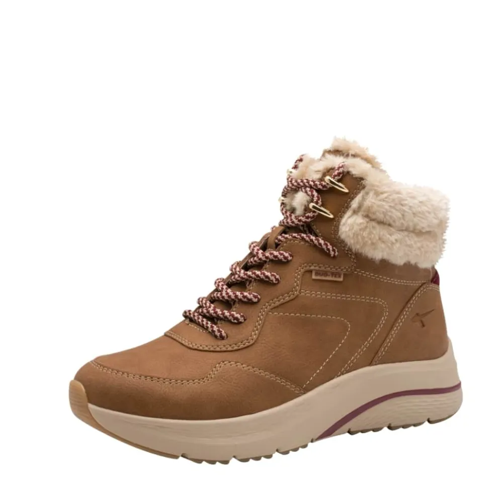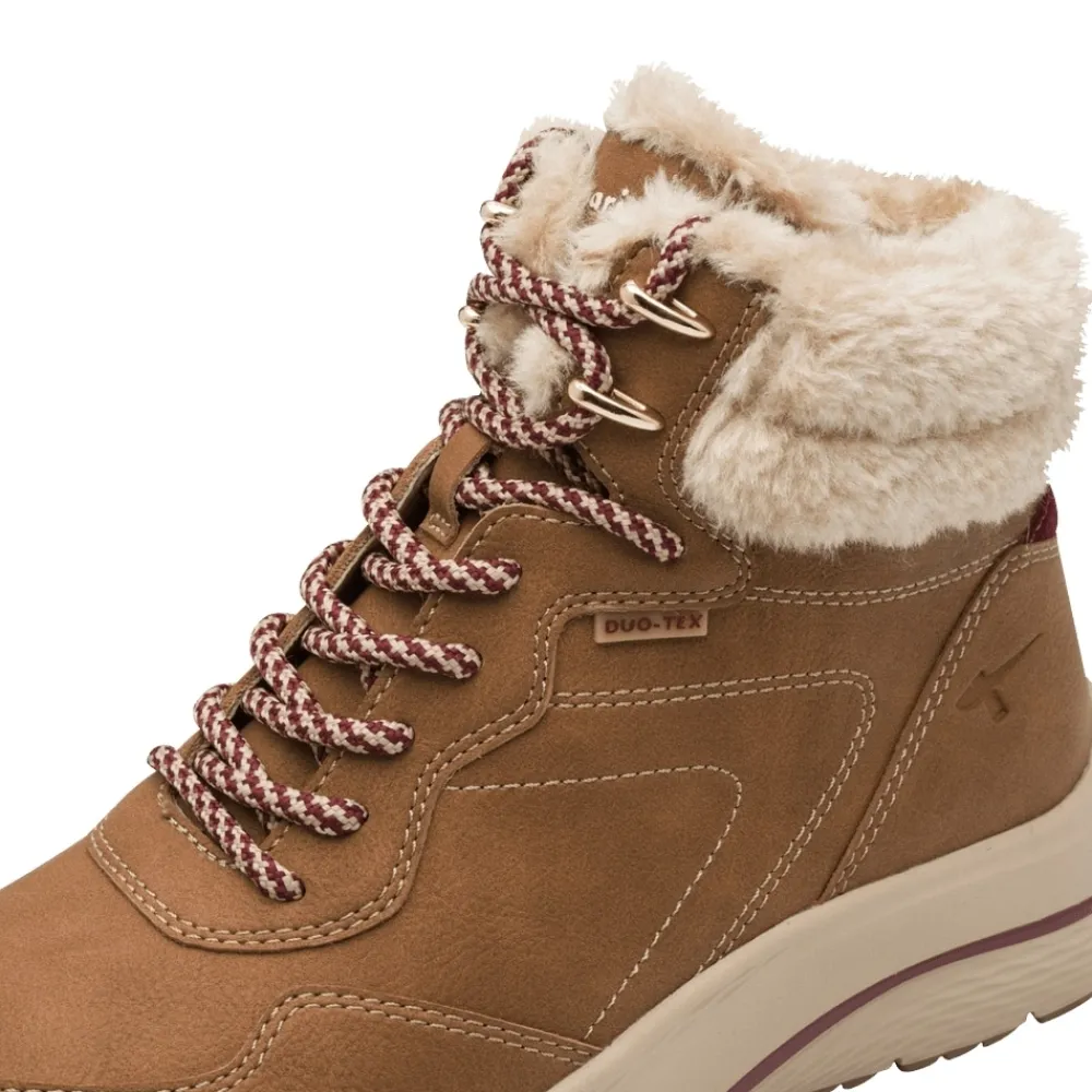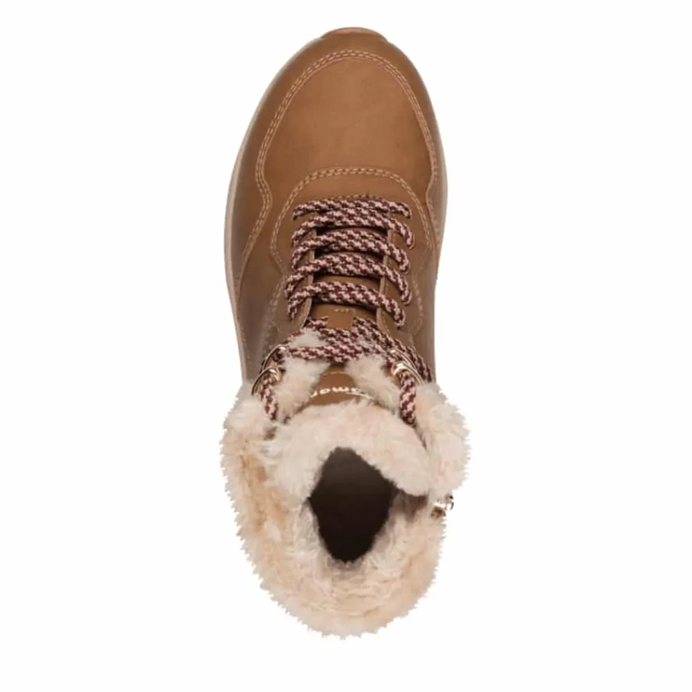 Tamaris støvle til dame i brun. Moderne vinterstøvle til dame i brun med smarte detaljer, der giver et stilfuldt look. Med snørebånd foran får du mulighed for en justerbar pasform, mens lynlåsen på indersiden gør det nemt at tage støvlen af og på. Indvendigt sørger den varme foring og den bløde udtagelige thermo-indersål for at holde fødderne varme og komfortable hele dagen. Støvlen er udstyret med DUO-Tex, som gør den kraftigt vandafvisende. Den chunky ydersål med et godt mønster giver både øget støtte og skridsikkerhed.