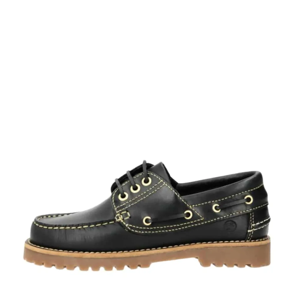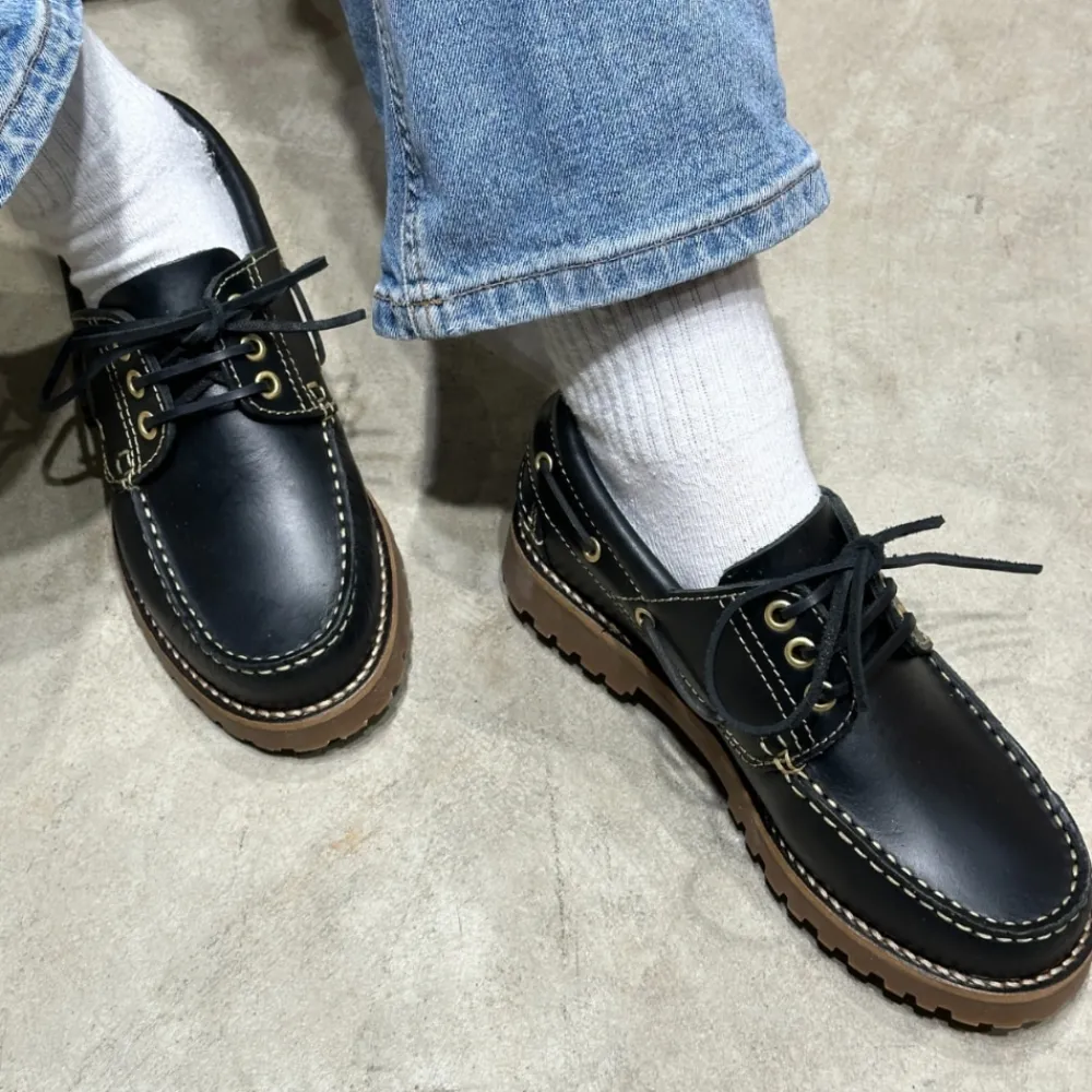 Phenumb Copenhagen Rudder X sejlersko til dame i sort. Stilet sko i klassisk sort skind, der kombinerer modernitet og komfort. De smarte lædersnørebånd på siderne og foran giver et unikt touch. En blød indersål sikrer behagelig komfort hele dagen, mens den chunky ydersål tilføjer et moderne touch og giver god stabilitet.