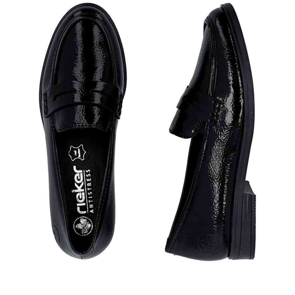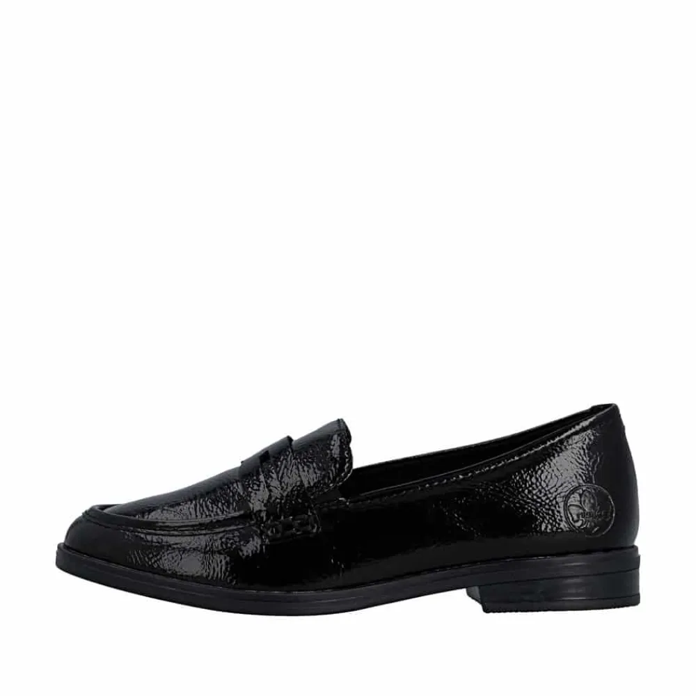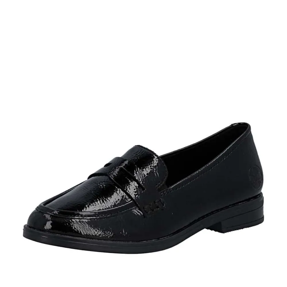 Rieker loafers til dame i sort lak. Denne elegante loafers har en flot lakoverdel og enkle detaljer som giver et pænt og moderne udtryk. Skoen er nem at tage på, da de to elastikker ved åbningen gør det let at komme i skoen og samtidig sikrer en god pasform. Indvendigt er skoen udstyret med en blød skindsål, og sammen med den stødabsorberende ydersål giver det god komfort hele dagen. Ydersålen har et tydeligt mønster som bidrager til stabilitet og øget skridsikkerhed.