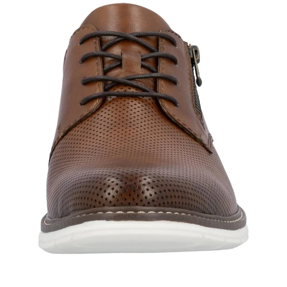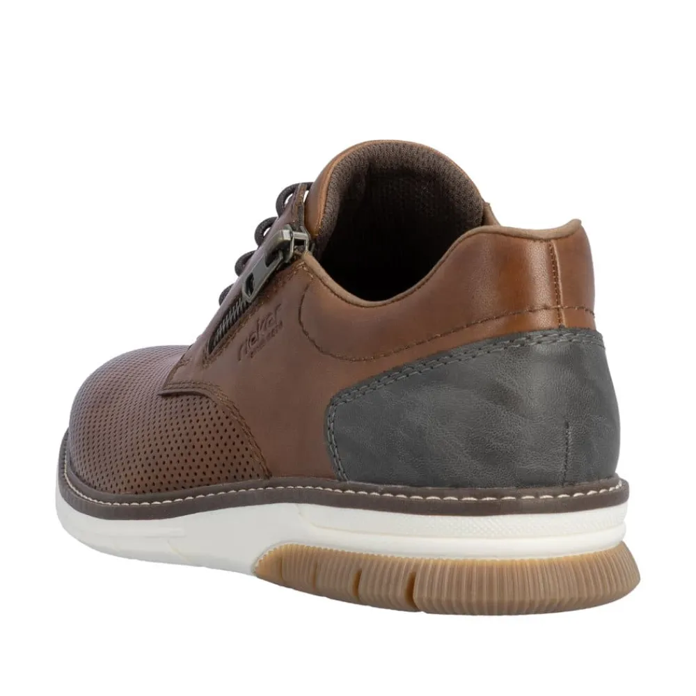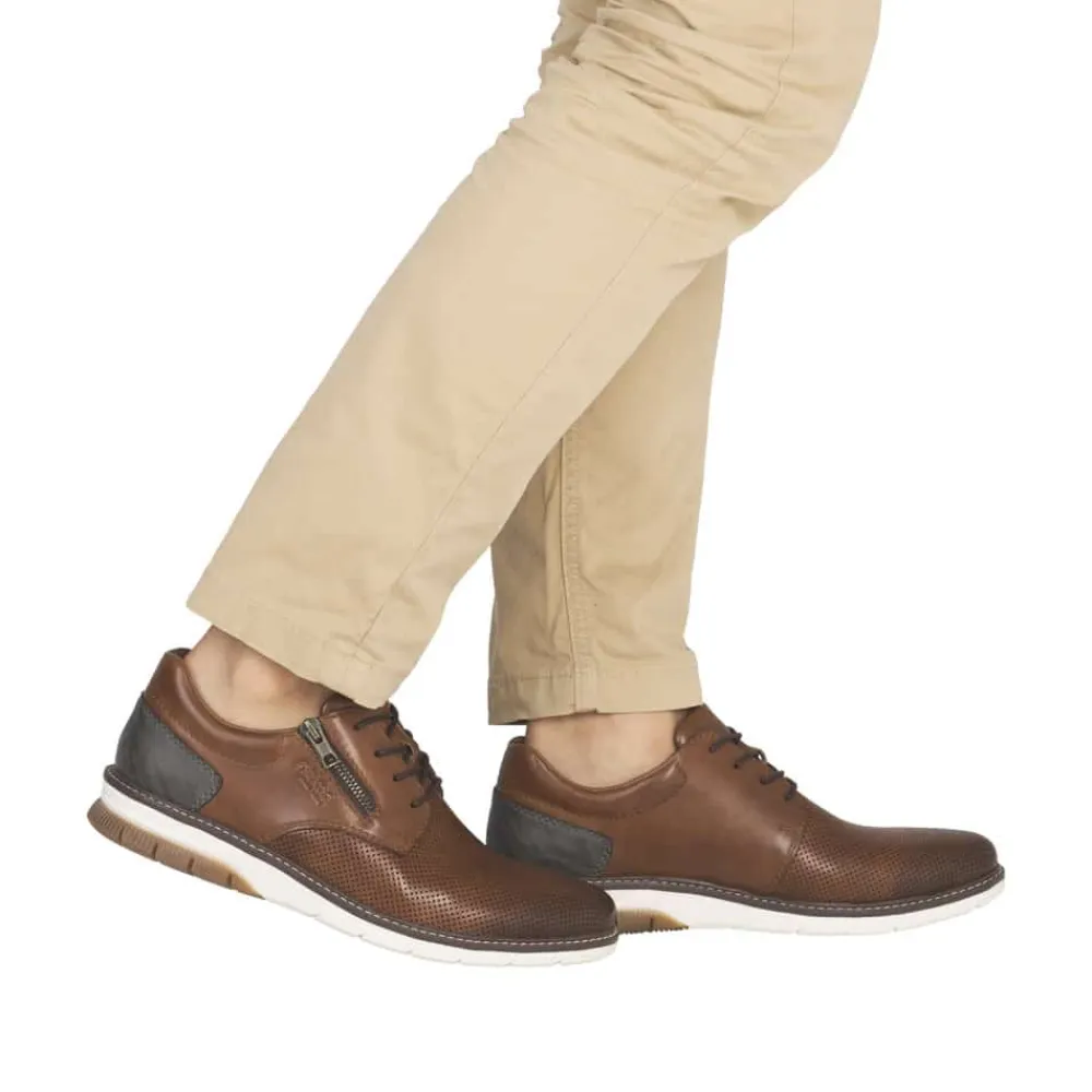 Rieker sko til herre i brun. Stilfulde brune sko i skind, der er designet med fokus på både funktion og komfort. Kombinationen af snørebånd og lynlås gør skoen nem at bruge i hverdagen og sikrer en god pasform. Indvendigt finder du en blød sål, som giver behagelig komfort dagen igennem. Med Rieker Antistress får du en let og fleksibel sko, og den mønstrede ydersål giver øget stødabsorbering og skridsikkerhed.