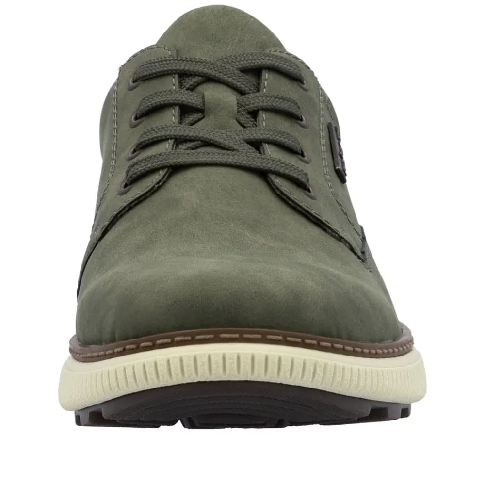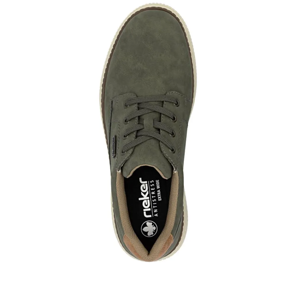 Rieker sneakers til herre i grøn. Disse grønne sneakers er et moderne valg med fokus på funktionalitet. De har snørebånd foran, som gør det nemt at tage skoen på og justere pasformen. Indvendigt finder du en blød, udtagelig indersål og ekstra bredde (H), der giver god plads til foden. Takket være Rieker Tex er skoen kraftigt vandafvisende, og ydersålen med stødabsorberende egenskaber giver ekstra støtte og komfort. Den mønstrede sål øger skridsikkerheden og giver stabilitet i hvert skridt.