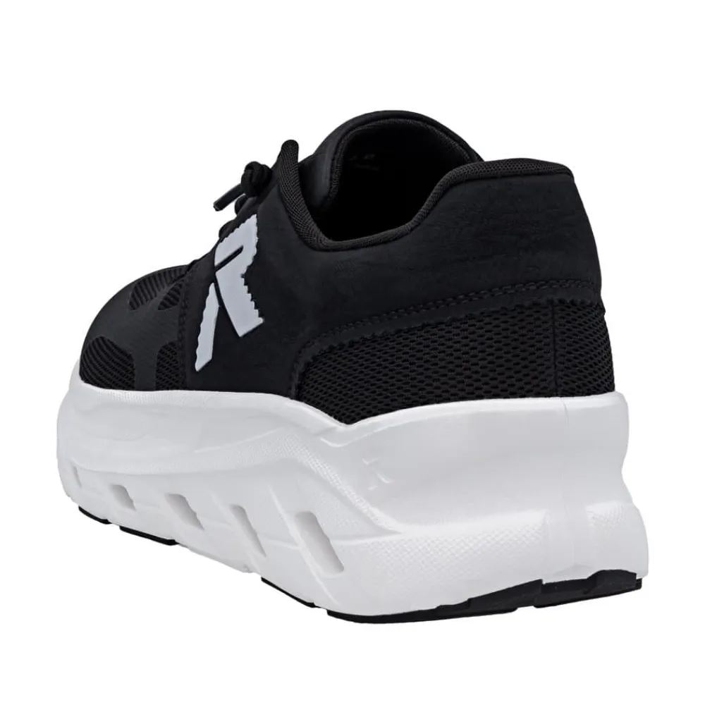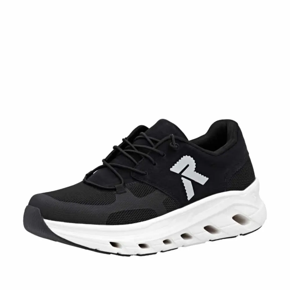 Rieker sneakers til herre i sort. Disse sorte sneakers kombinerer smart design med praktisk funktion. Skoen har elastik over vristen og leveres med snørebånd, så du selv kan vælge, hvad der passer bedst. Indvendigt finder du en blød og udtagelig Rieker-Soft indersål, der sikrer komfort hele dagen. Modellen har ekstra bredde (H), som giver god plads og fleksibilitet, mens den mønstrede ydersål bidrager med både øget stødabsorbering og skridsikkerhed.