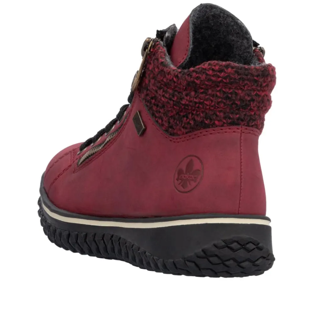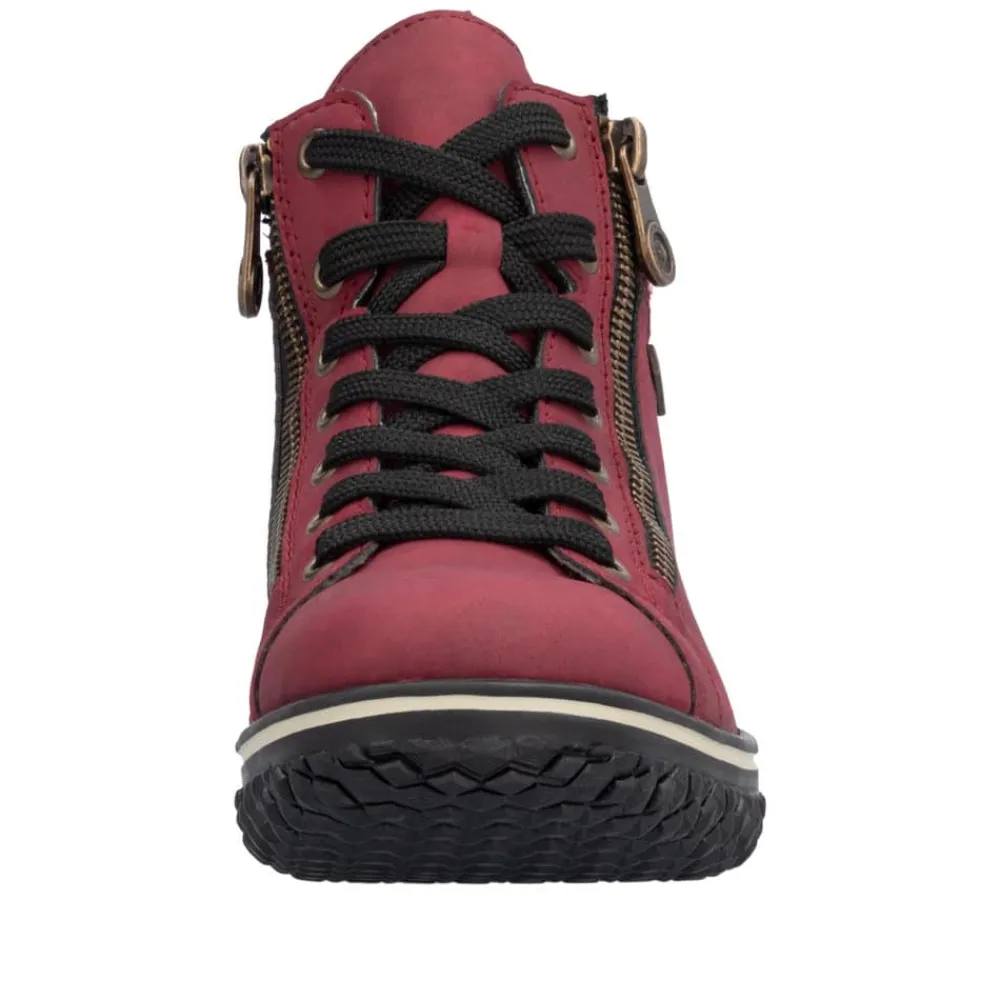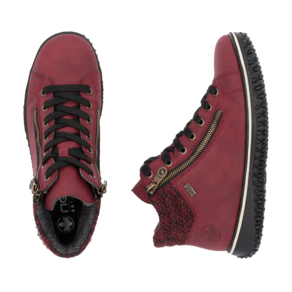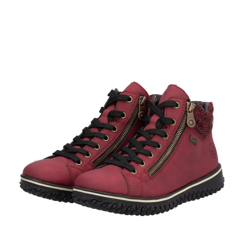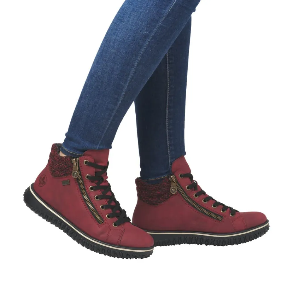 Rieker støvle til dame i rød. Denne lette og fleksible støvle i en moderne rød farve kombinerer stil og funktionalitet. Med både snørebånd og to lynlåse er det hurtigt og nemt at få støvlen af og på. Den lette foring gør den perfekt til brug hele året. Takket være Rieker-Tex er støvlen kraftig vandafvisende, så du kan bruge den i al slags vejr uden bekymring. Den ikoniske Rieker sål med stødabsorbering og et skridsikkert mønster sikrer både komfort og stabilitet.