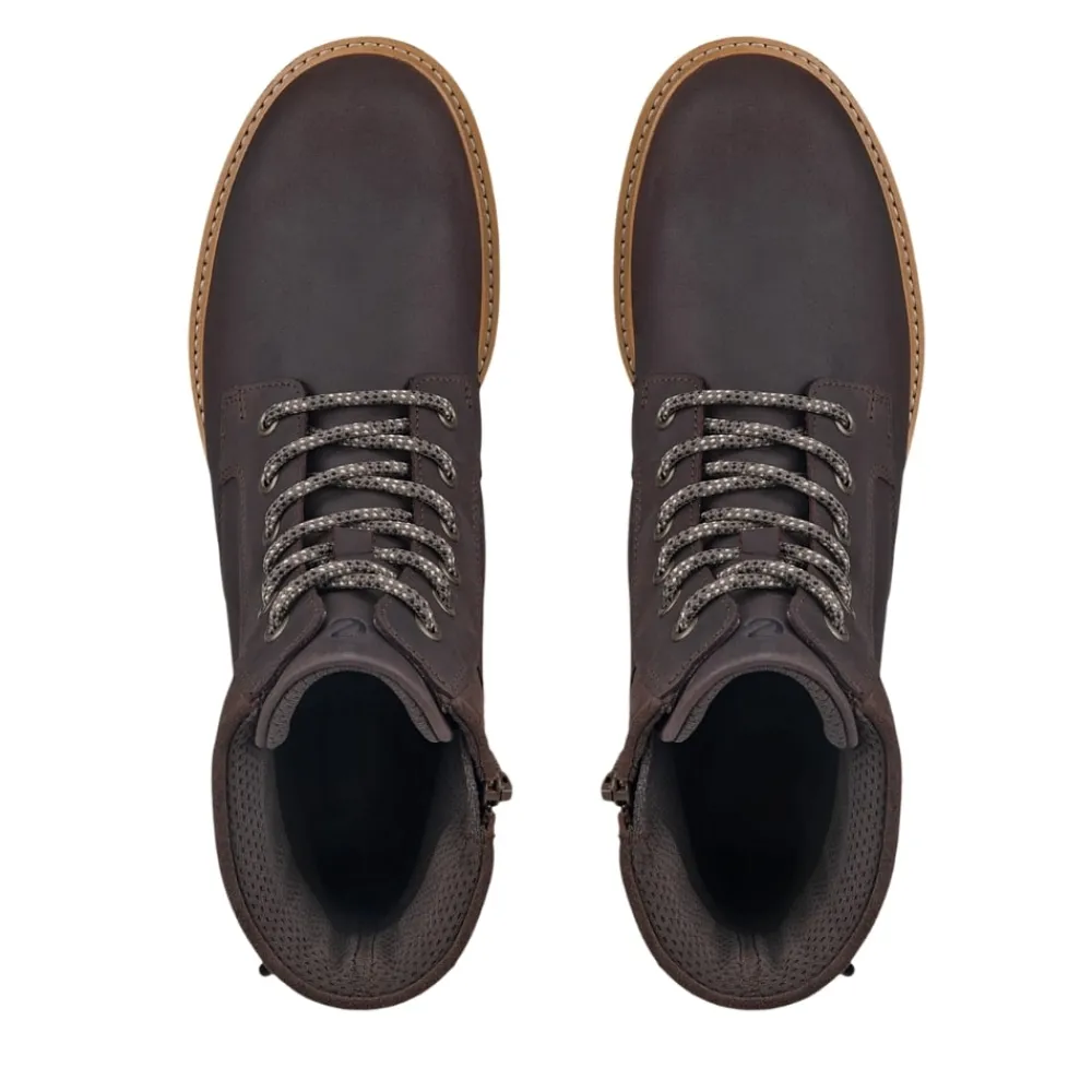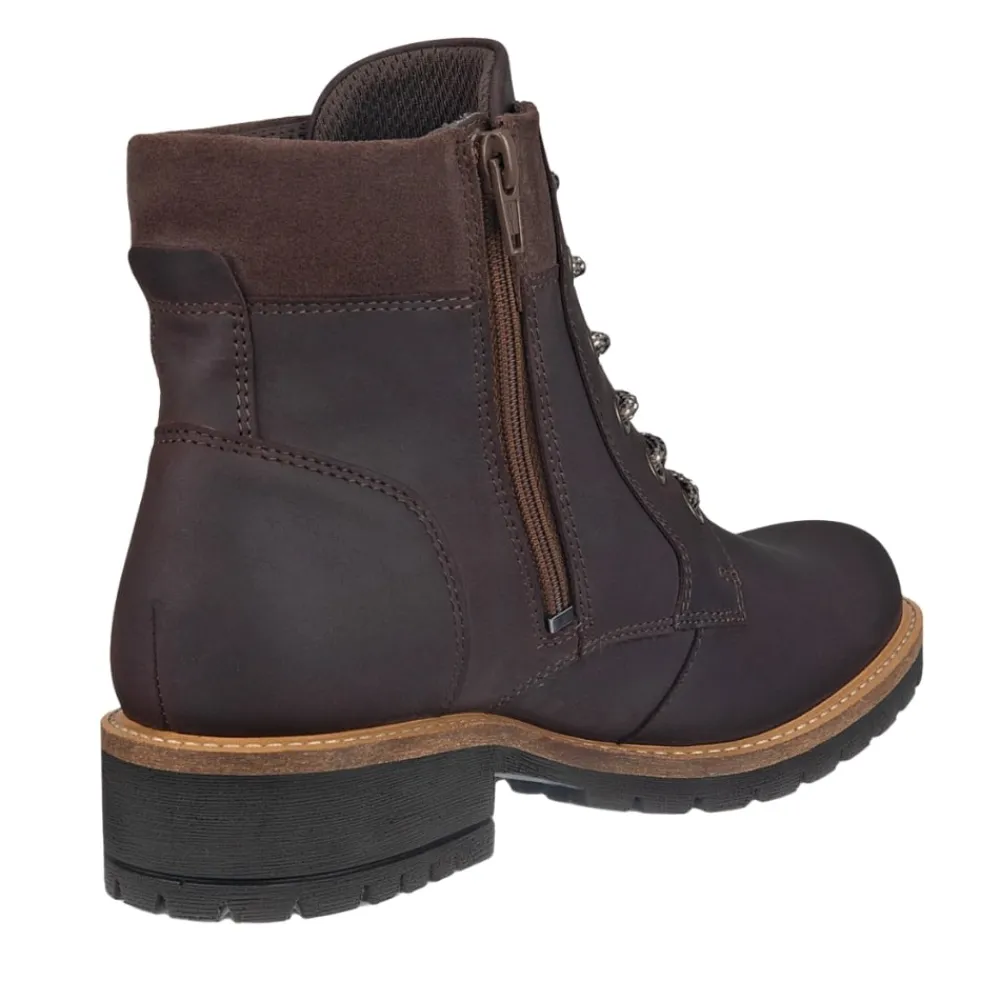 Ecco Elaina støvle til dame i brun. Smart ankelstøvle i nubucklæder, der kombinerer moderne design med høj komfort. Støvlen har snørebånd foran, så du kan justere pasformen, samt en funktionel lynlås på indersiden, der gør den nem at tage af og på. Indvendigt sikrer en blød, udtagelig indersål god støtte, mens Ecco Fluidform™ teknologien følger fodens naturlige bevægelser for ekstra komfort. Den stabile ydersål med blokhæl på ca. 4 cm og mønster giver solid støtte og øget skridsikkerhed hele dagen.