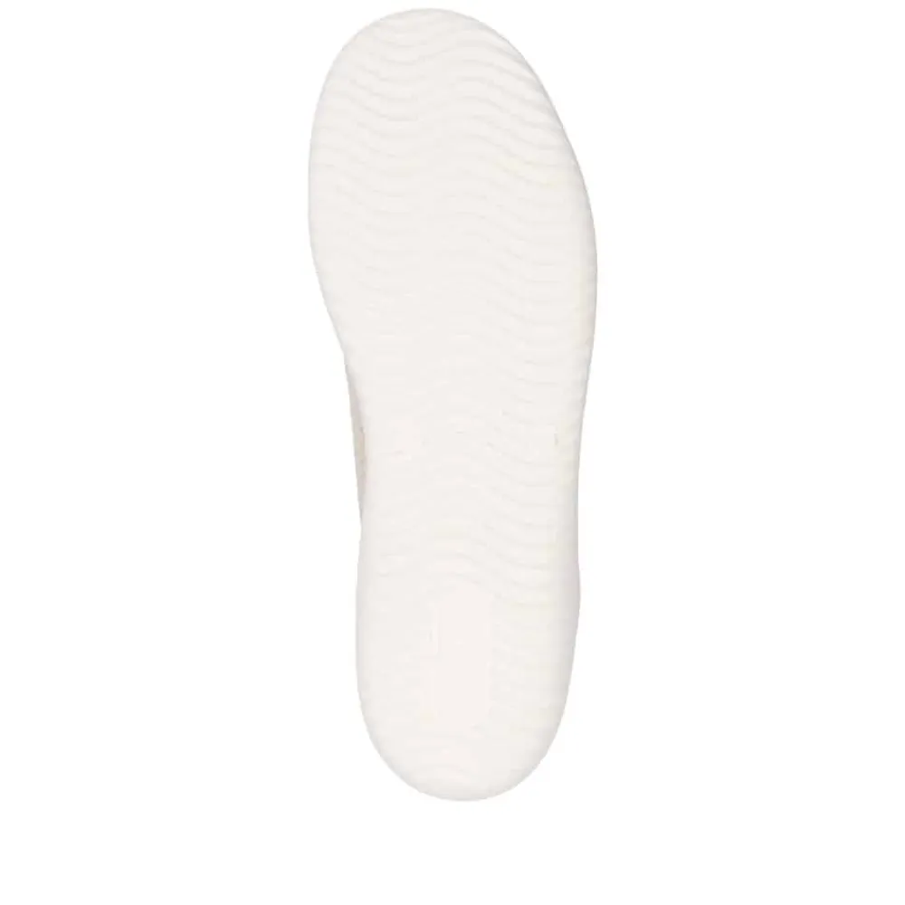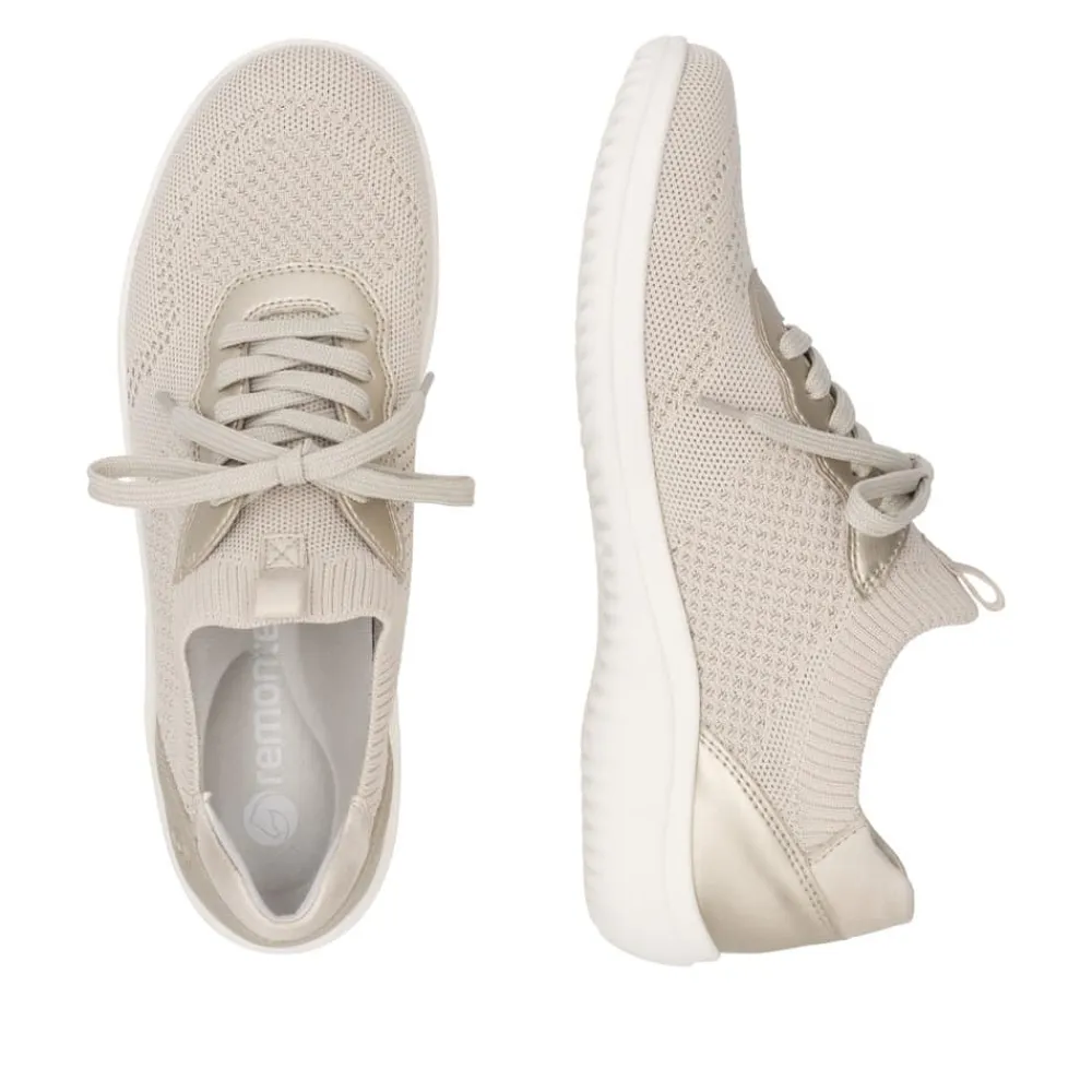 Remonte sneakers til dame i beige. Denne lette og fleksible sneakers i beige er designet med elegante gyldne og glitrende detaljer, der giver et stilfuldt touch. Snørebåndene foran sikrer en justerbar pasform og gør skoen nem at tage af og på. Overdelen er fremstillet i blødt og åndbart materiale, som giver en behagelig fornemmelse hele dagen. Indvendigt finder du en udtagelig Remonte Soft-indersål, der sikrer optimal komfort. Den rummelige pasform (G) giver ekstra plads til fødderne, mens den lette Lite n Soft-ydersål sørger for fleksibilitet og effektiv stødabsorbering.