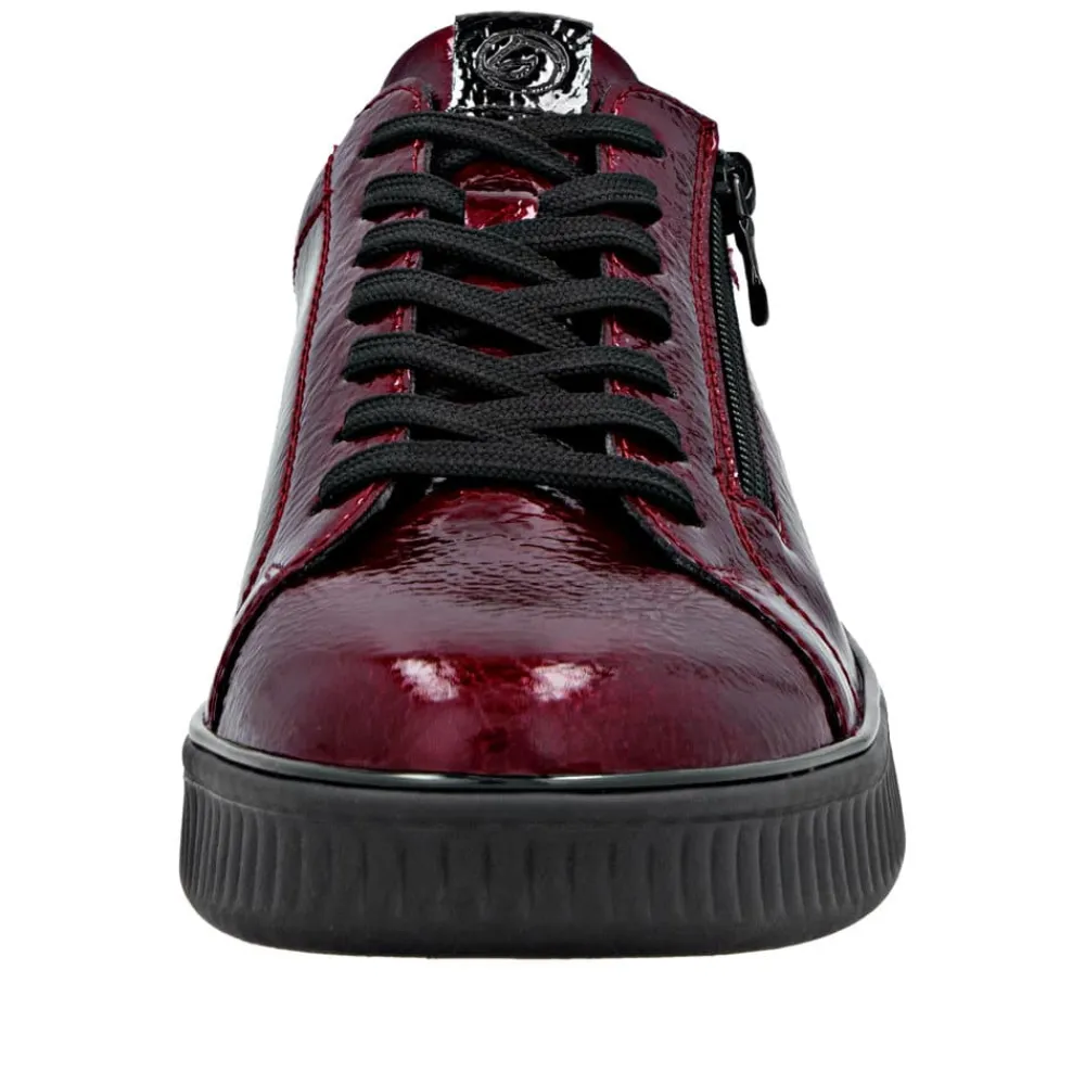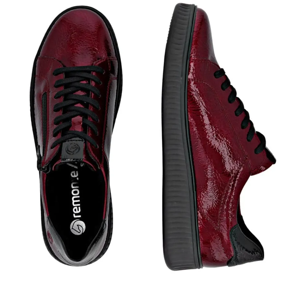 Remonte sneakers til dame i rød. Moderne sneakers til dame i en flot rød farve med fine detaljer. Skoen har både snørebånd og en funktionel lynlås, som gør den nem at tage på og tilpasse til foden. Indvendigt finder du en blød udtagelig Remonte-Soft indersål, der giver komfort hele dagen. Modellen har ekstra bredde (G), hvilket sikrer mere plads og en fleksibel pasform. Den lette og fleksible ydersål har et godt mønster, som øger både stødabsorbering og skridsikkerhed.