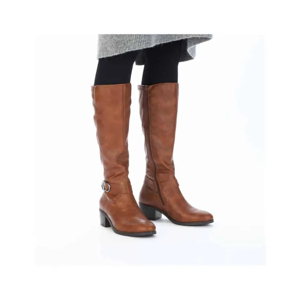 Rieker lang støvle til dame i brun. Smuk brun støvle med langt skaft og en flot detalje på siden, der giver et stilfuldt udtryk. Støvlen har en funktionel lynlås på indersiden, så den er nem at tage af og på. Indvendigt sørger en let foring for at holde fødderne lune, mens den bløde indersål giver ekstra komfort. Den elegante blokhæl på cirka 5,5 cm løfter looket, uden at det går ud over komforten. Ydersålen har stødabsorberende egenskaber, som giver god støtte hele dagen.