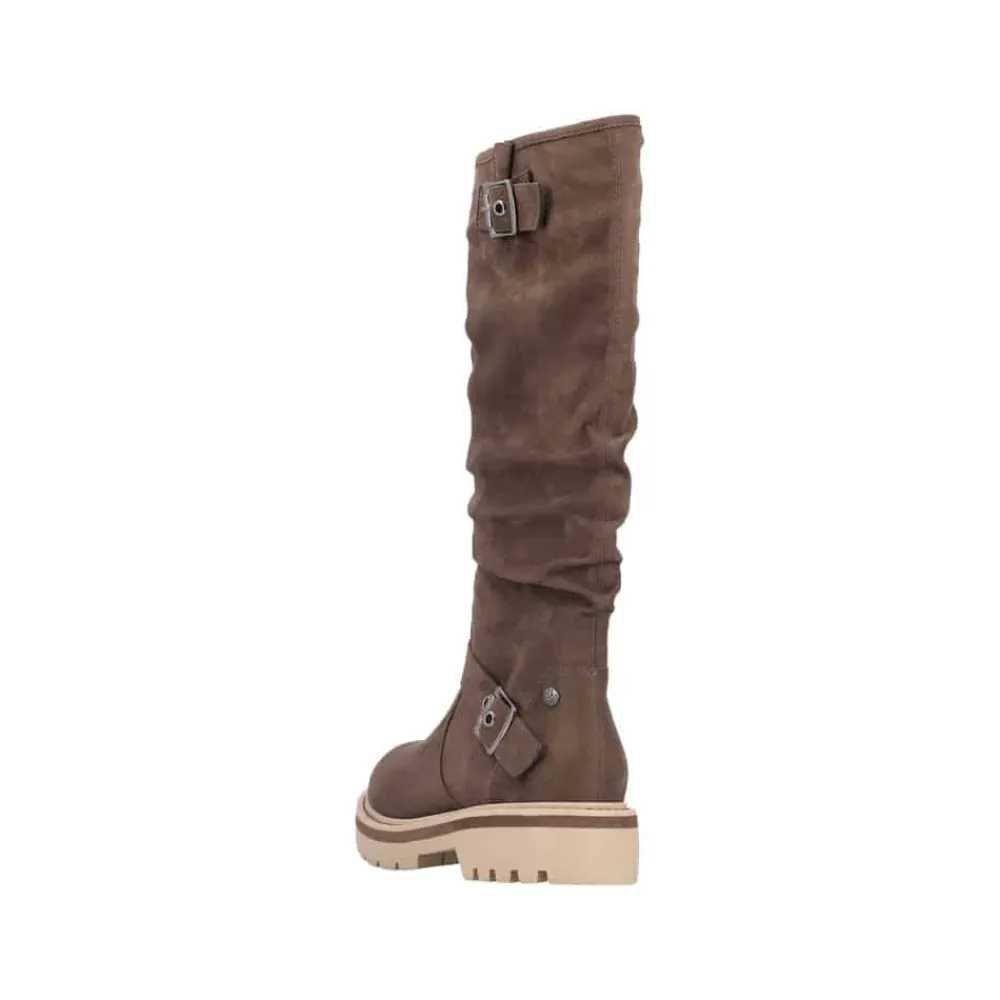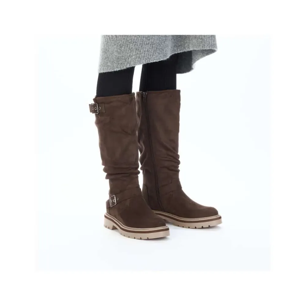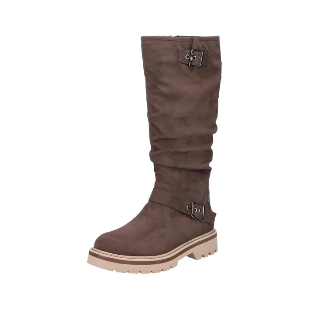 Rieker lang støvle til dame i brun. Stilfuld støvle i brun med flotte spænder og et langt skaft, der giver et moderne udtryk. Støvlen er udstyret med en funktionel lynlås på indersiden, som gør den nem at tage af og på. Indvendigt finder du en let foring og en blød sål, der sikrer høj komfort hele dagen. Den chunky ydersål med stødabsorberende egenskaber og et godt mønster giver øget støtte og skridsikkerhed.