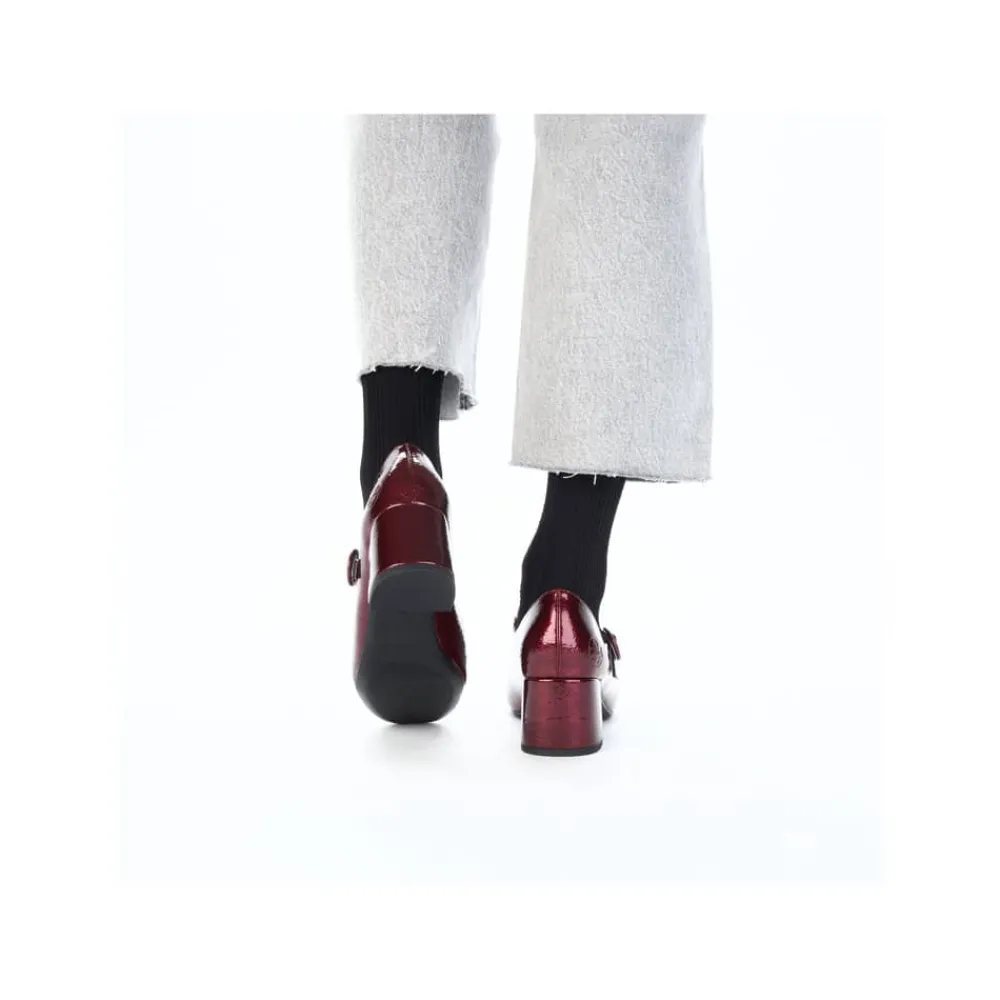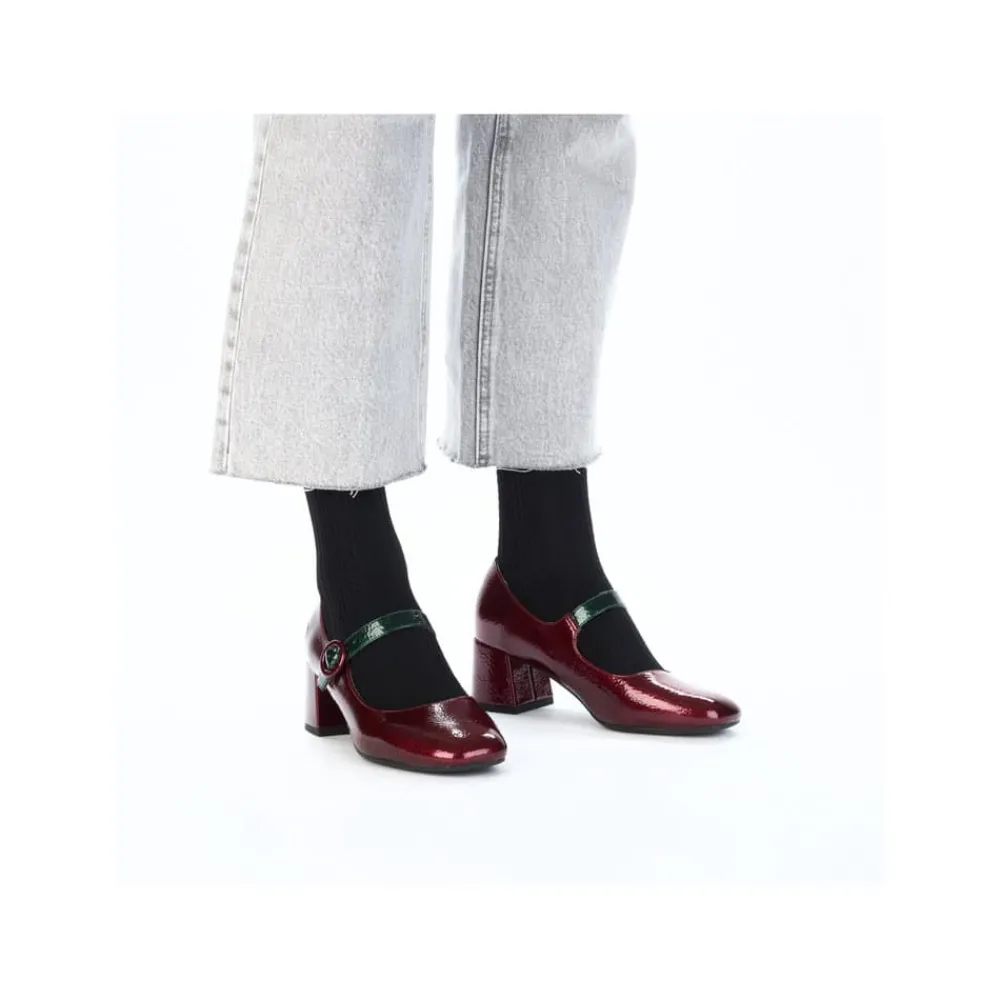 Rieker pumps til dame i bordeaux lak. Moderne pumps i en smuk bordeaux farve med en blank lakoverdel og en grøn rem over forfoden, som giver skoen et stilfuldt udtryk. Modellen er nem at tage af og på takket være den praktiske spændelukning. Indvendigt finder du en blød indersål i skind, der sikrer komfort hele dagen. Den solide blokhæl på cirka 6 cm giver et elegant løft, mens de stødabsorberende egenskaber sørger for en behagelig gang.
