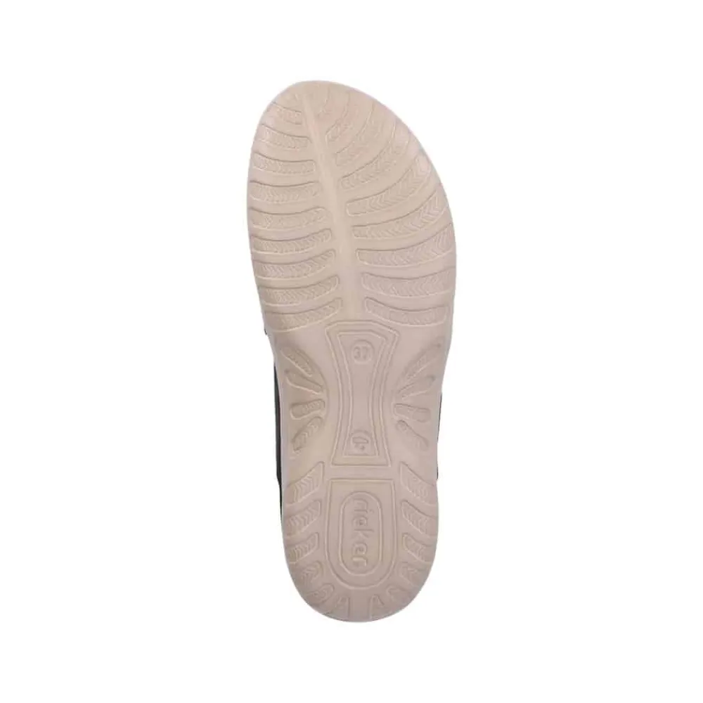 Rieker sandal til dame i sort. Denne lette sandal i sort kombinerer et klassisk udtryk med moderne detaljer. Tå-remmen giver et elegant og feminint look, mens slip-in funktionen gør det nemt at tage sandalen på. Indersålen er blød og sikrer komfort gennem hele dagen. Den solide ydersål med stødabsorbering og mønster giver både støtte og skridsikkerhed, hvilket gør sandalen perfekt til både hverdag og fritid.