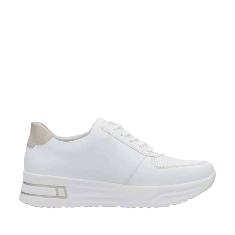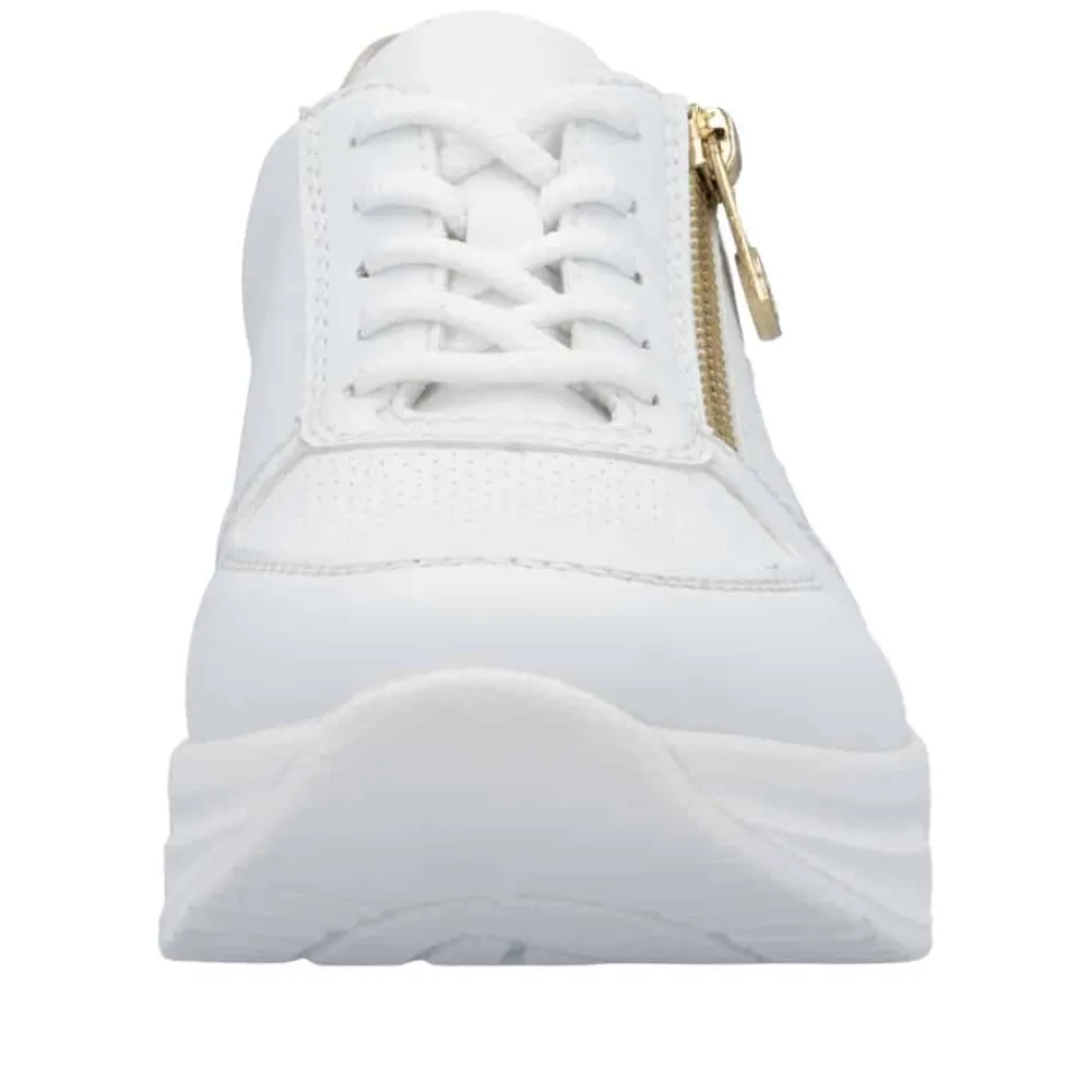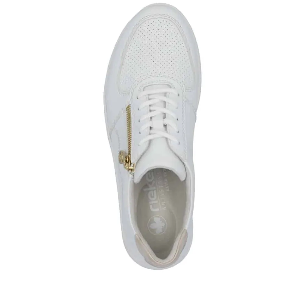 Rieker sneakers til dame i hvid. Træd ind i stil og komfort med denne elegante sneakers, der kombinerer en lav kilehæl for et subtilt løft og et flatterende udtryk – ideel til heldagsbrug. Kombinationen af snørebånd og lynlås sikrer en skræddersyet pasform og gør skoen nem at tage af og på. Den udtagelige Rieker Antistress-indlægssål former sig efter fodens kontur og giver fremragende stødabsorbering ved hvert skridt, mens den brede pasform i vidde H sikrer ekstra plads og komfort. Den moderne hvide overdel med smukke gulddetaljer tilføjer et stilfuldt præg til dit look. Skoen er fremstillet af slidstærkt syntetisk materiale med en åndbar tekstilforing, der holder fødderne friske hele dagen. Den lette og robuste syntetiske sål gør denne sneakers til det perfekte valg til både hverdagsbrug og aktive dage.