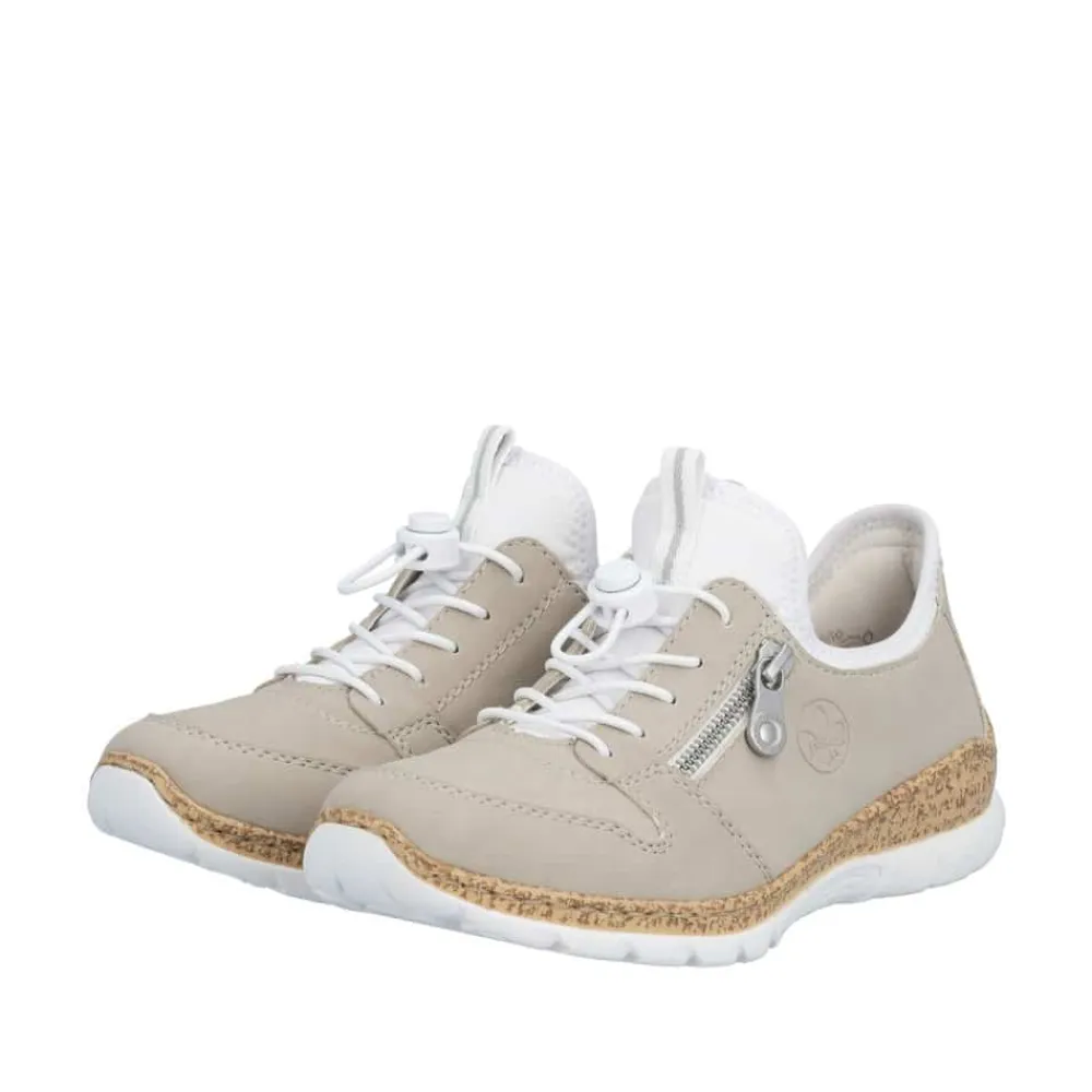 Rieker sneakers til dame i beige. Stilfuld beige sko med et klassisk udtryk og fokus på komfort til daglig brug. Den elastiske lukning gør det hurtigt og nemt at komme i og af skoen og fungerer godt i en travl hverdag. Skoen er udstyret med en blød Memosoft indersål som former sig efter foden og sikrer behagelig komfort. Ydersålen har et mønster som giver stabil støtte og øget skridsikkerhed hele dagen.