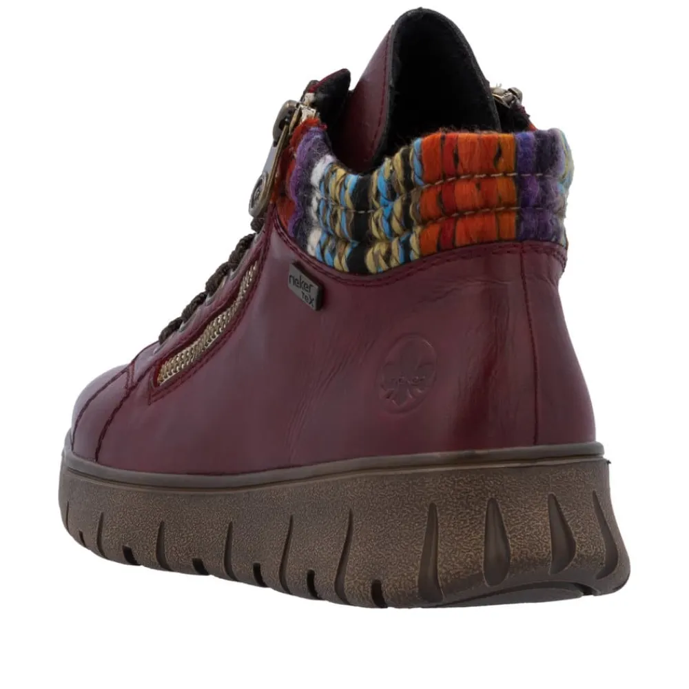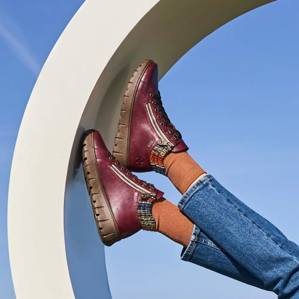 Rieker støvle til dame i bordeaux. Denne støvle kombinerer flot design med praktiske detaljer. Støvlen er udstyret med snørebånd og to funktionelle lynlåse, så du nemt kan tilpasse pasformen til din fod. Indvendigt sørger en varm foring og en blød udtagelig sål for høj komfort, mens ekstra bredde (H) giver mere plads og fleksibilitet til foden. Rieker-Tex gør støvlen kraftig vandafvisende, og den mønstrede ydersål giver både øget stødabsorbering og skridsikkerhed.