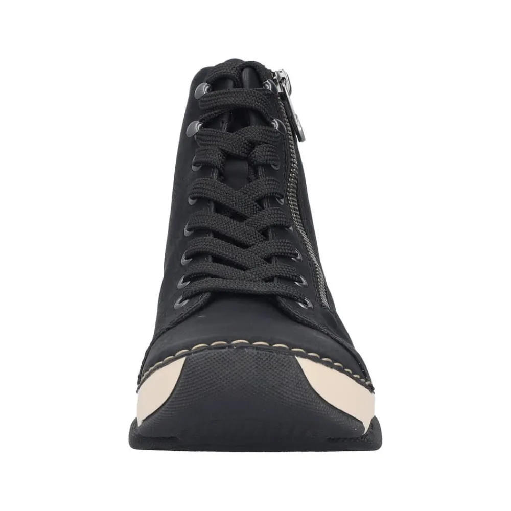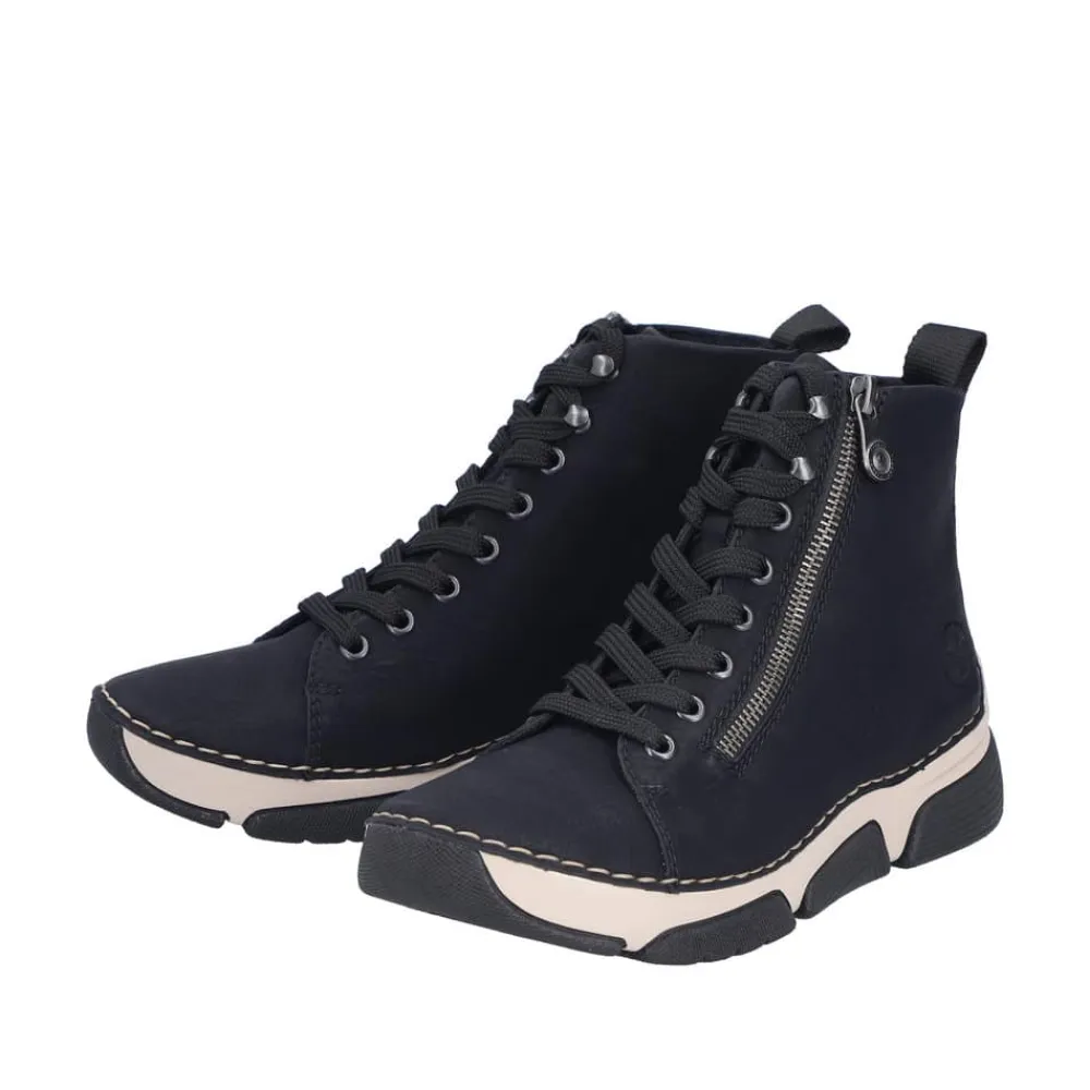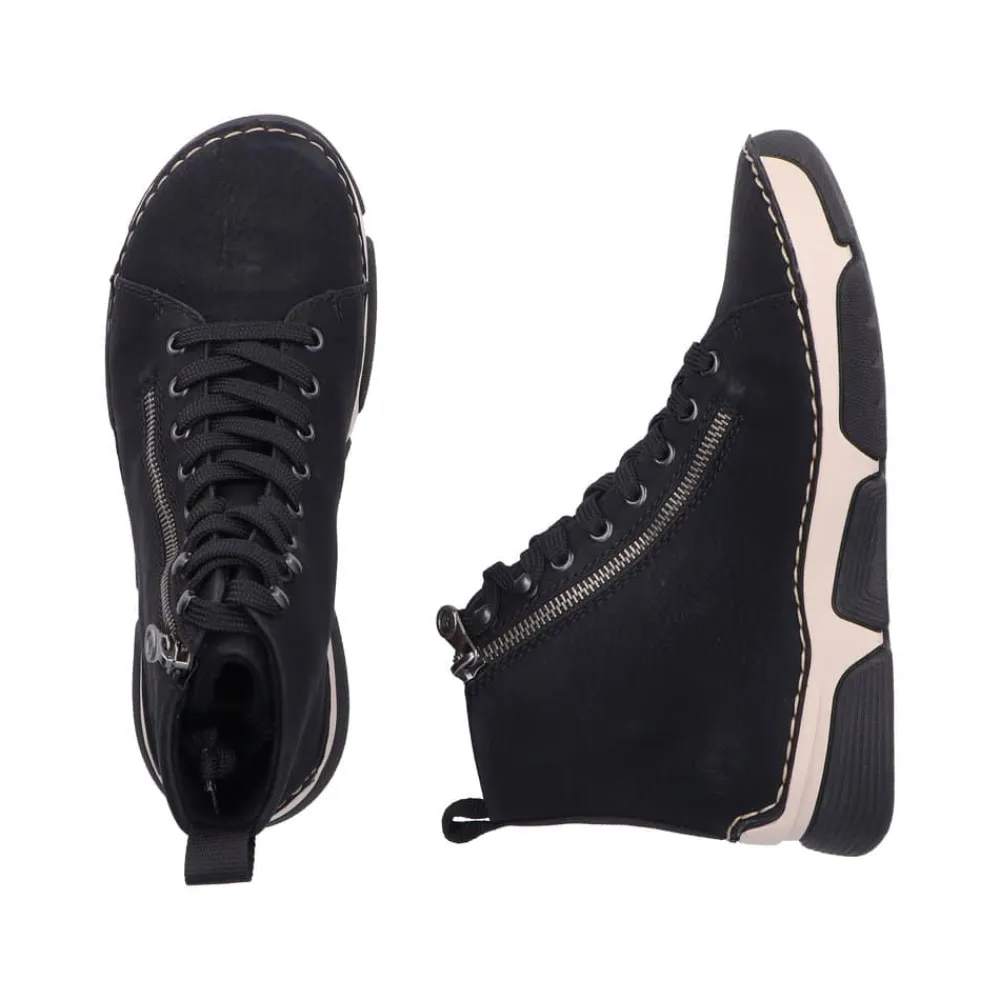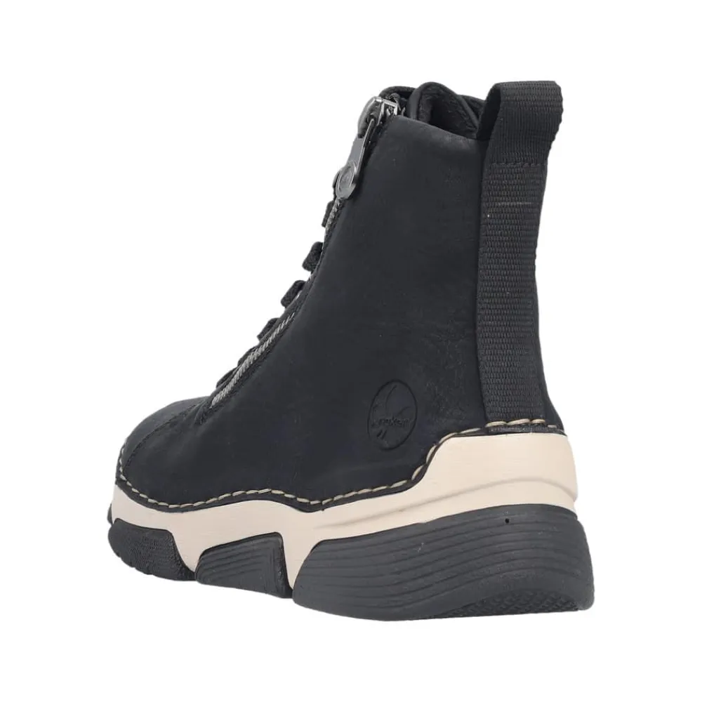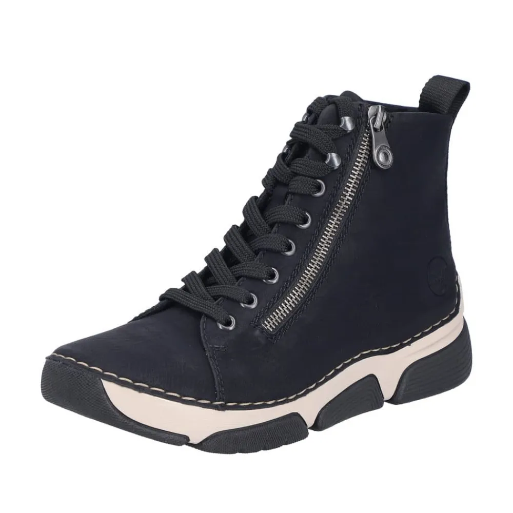 Rieker støvle til dame i sort. Denne støvle er ideel til hverdagen. Den er udstyret med både snørebånd og en funktionel lynlås, som gør det nemt at tage den af og på. Indvendigt finder du en let foring og en blød sål, der giver god komfort hele dagen. Med Rieker Antistress føles støvlen let og fleksibel, mens den mønstrede ydersål giver øget stødabsorbering og skridsikkerhed.