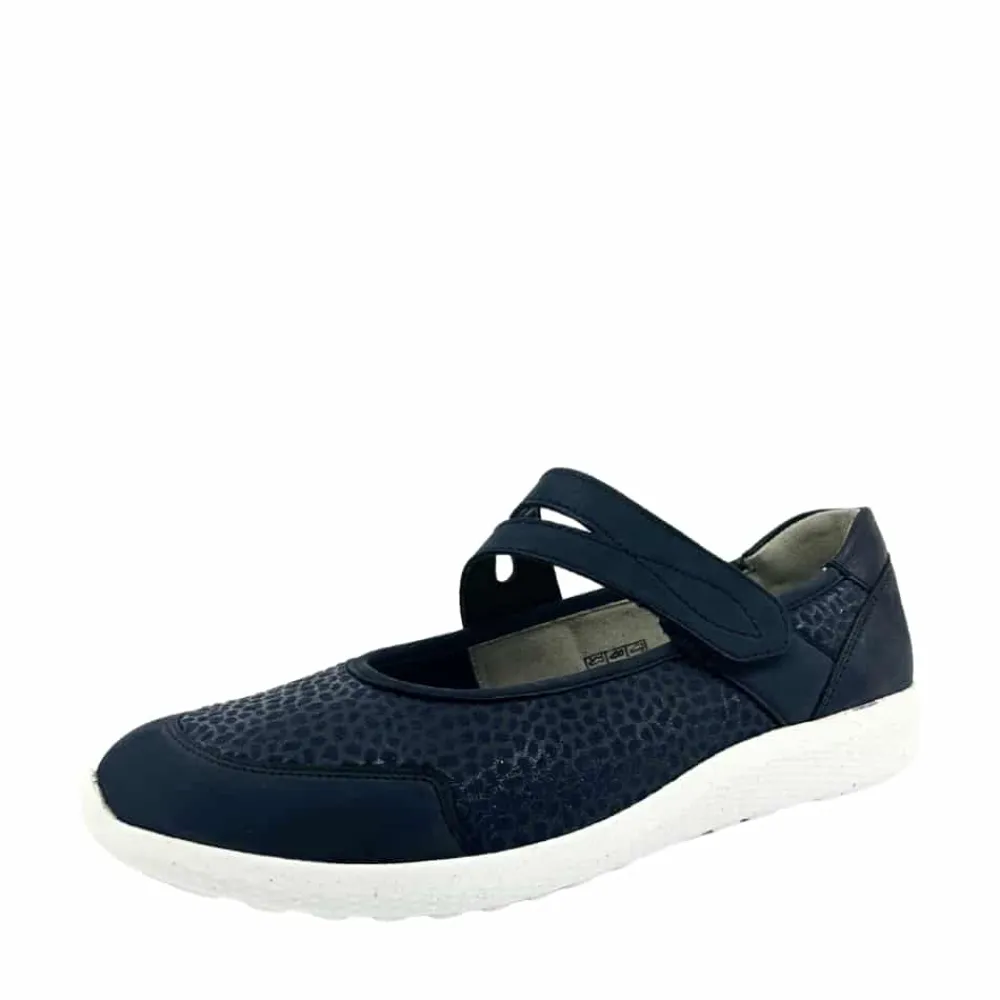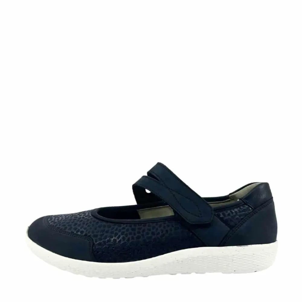Waldläufer sko til dame i mørkeblå. Let og fleksibel sko i en flot mørkeblå farve med fine detaljer, der giver et moderne udtryk. Modellen har skinddetaljer og en praktisk velcrorem over forfoden, som gør den nem at tage af og på. Indvendigt sikrer en blød og udtagelig indersål maksimal komfort hele dagen. Skoen er designet med ekstra bredde K, hvilket giver en rummelig pasform. Den solide ydersål har et godt mønster, der bidrager til stabilitet og skridsikkerhed.