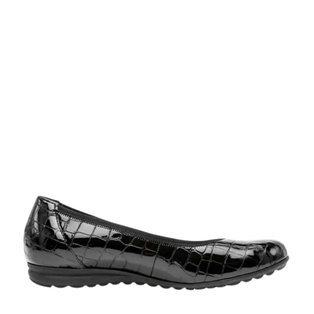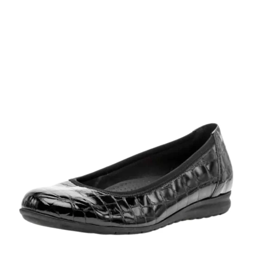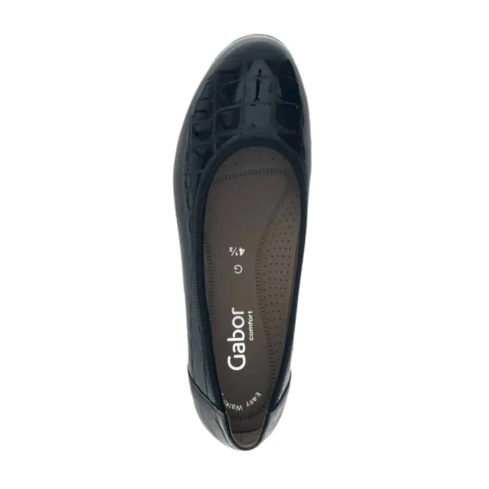Gabor ballerinasko til dame i sort. Elegant ballerina i klassisk sort med en stilfuld lakoverflade og krokodillemønster, der tilføjer et moderne touch. Indvendigt sørger en blød skindsål for høj komfort, mens den ekstra bredde (G) sikrer en rummelig og behagelig pasform. Skoen har en lille kilehæl på 2,5 cm, der giver et let løft, og den skridsikre ydersål bidrager til stabilitet hele dagen