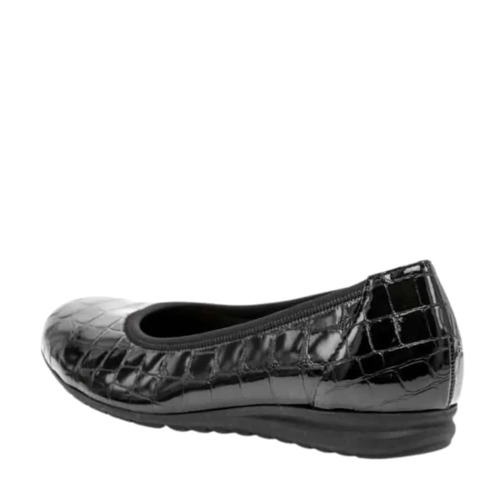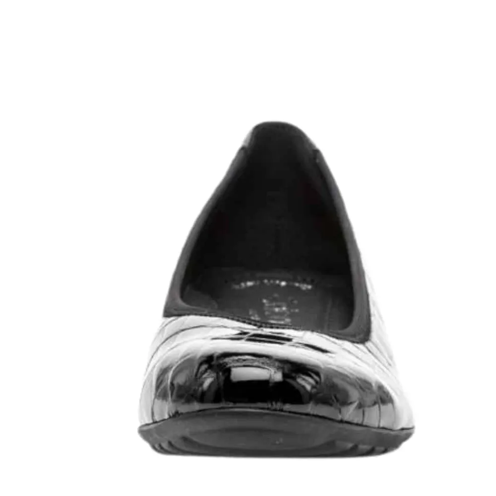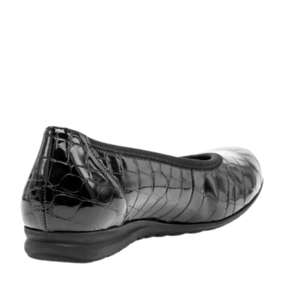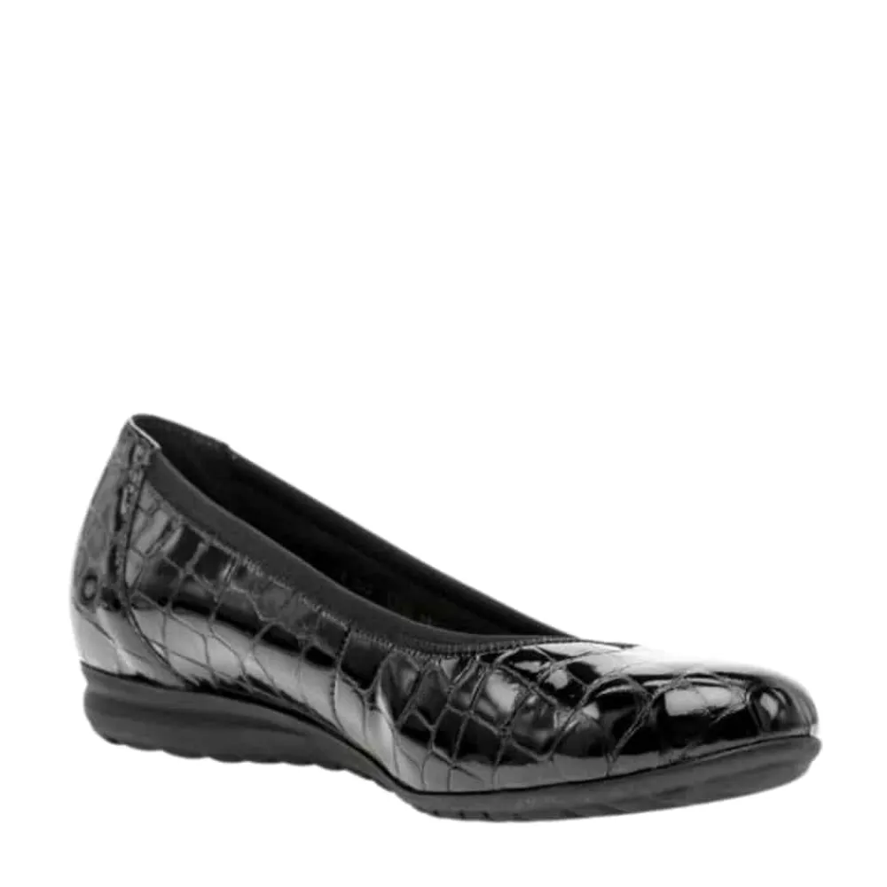 Gabor ballerinasko til dame i sort. Elegant ballerina i klassisk sort med en stilfuld lakoverflade og krokodillemønster, der tilføjer et moderne touch. Indvendigt sørger en blød skindsål for høj komfort, mens den ekstra bredde (G) sikrer en rummelig og behagelig pasform. Skoen har en lille kilehæl på 2,5 cm, der giver et let løft, og den skridsikre ydersål bidrager til stabilitet hele dagen