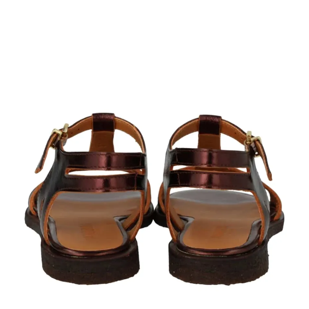 Angulus sandal til dame i metallisk brun. Denne elegante damesandal med smalle stropper og justerbar ankelrem er et stilfuldt valg til enhver garderobe. Det enkle og moderne design gør den nem at kombinere med forskellige outfits. Overdelen er lavet af blødt, førsteklasses læder, som giver en behagelig pasform. De justerbare remme sikrer optimal støtte, så du kan gå komfortabelt hele dagen. Med sin tidløse stil, robuste rågummisål og en flad hæl på 1,5 cm er sandalen ideel til både hverdag og festlige lejligheder.