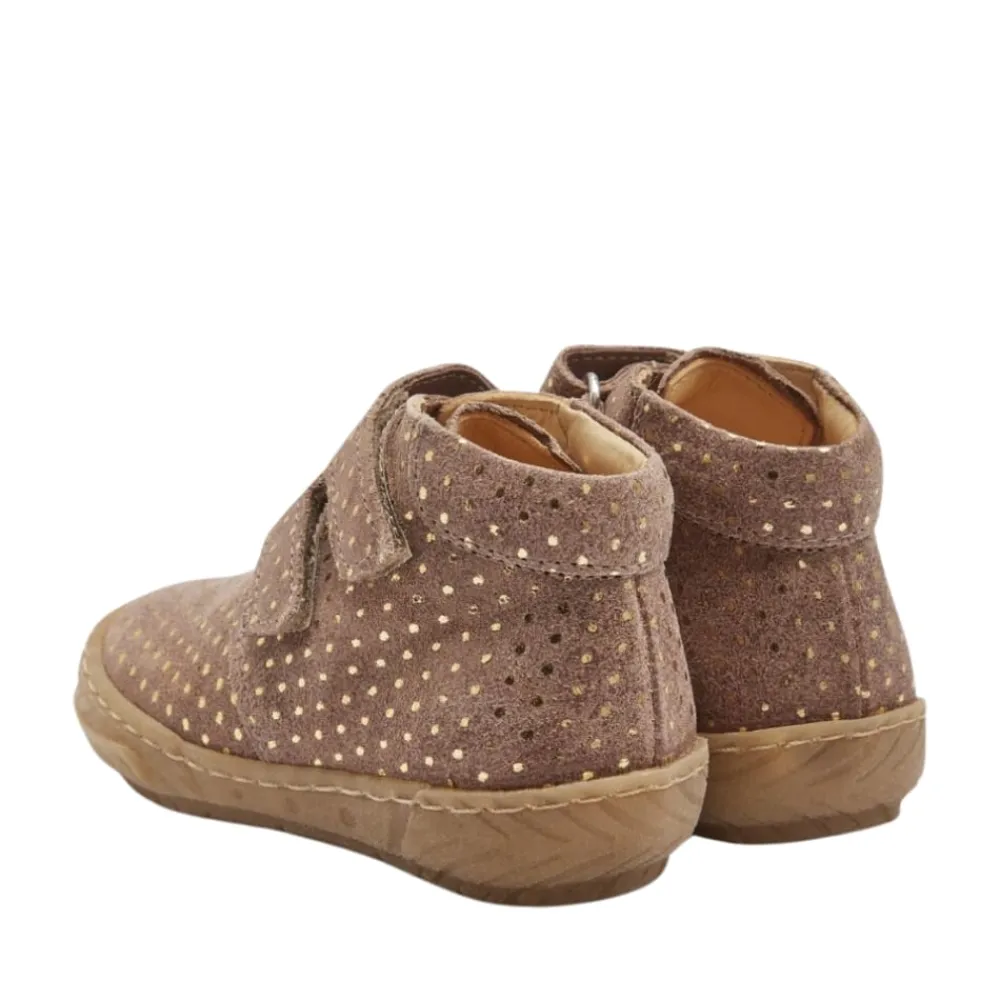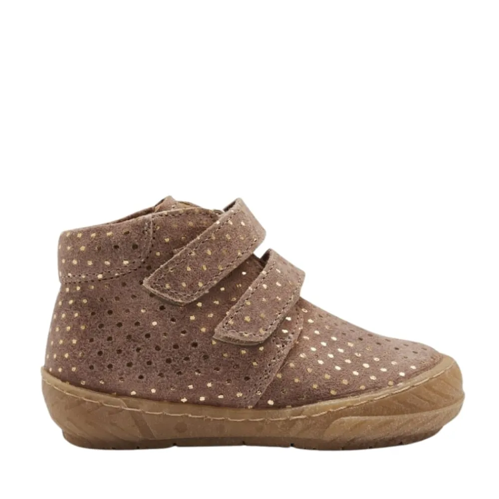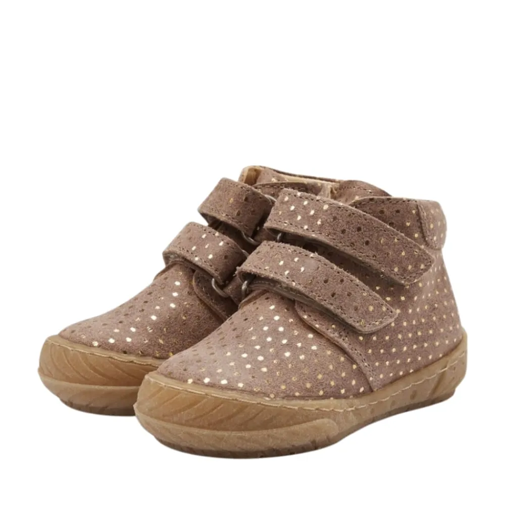 Angulus prewalker støvle til børn i brun med guld prikker til børn. Blød og fleksibel prewalker lædersko med velcro. Skoen har en rund snude, justerbare velcroremme, vatteret indersål, kromfrit læderfoer, præget logo ved hælen, fast hælkappe med polstret tone-i-tone krave i ruskind for ekstra komfort og støtte og en let, blød og fleksibel gummisål. Udformet i naturligt og åndbart skind. Designet i Danmark og håndlavet med kærlighed i Portugal. Mål altid barnets fod inden du køber, så du får købt den rigtige størrelse. Vi anbefaler et voksetillæg på 1 cm.