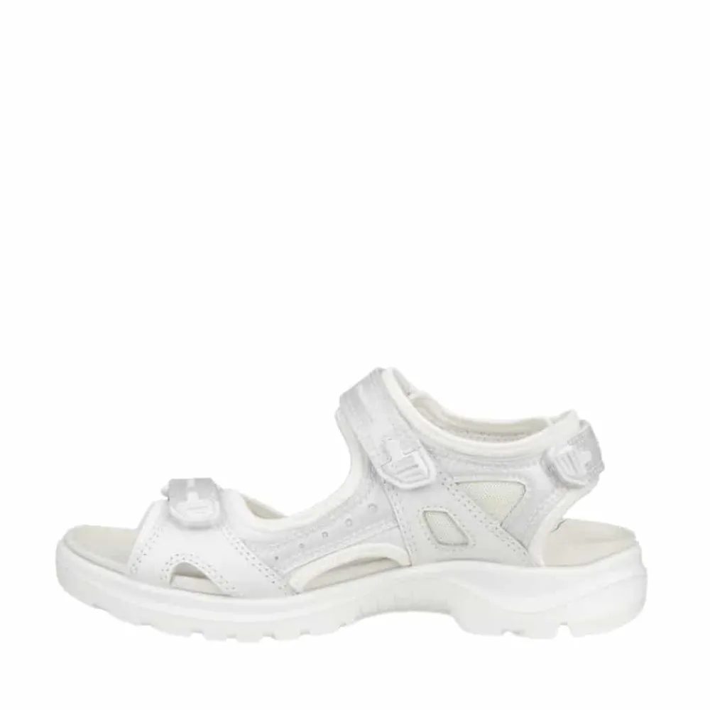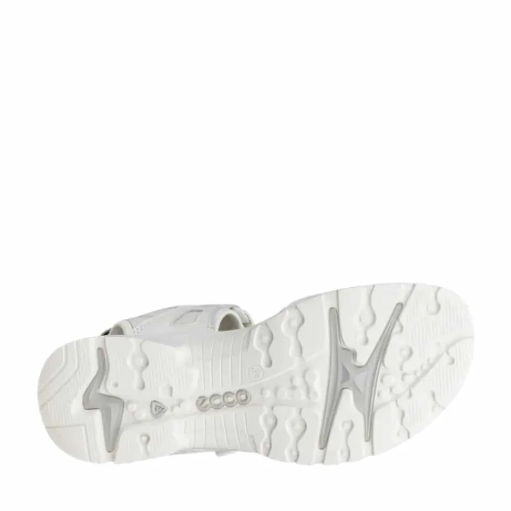 Ecco Offroad sandal til dame i hvid. Tag komforten med dig på lange gåture med denne lette og fleksible sandal. Designet til at give optimal støtte til dine fødder og har en imponerende støddæmpende effekt. Justér pasformen efter dine præferencer med de 3 praktiske velcroremme, der sikrer en perfekt indstilling. Sålen er ikke kun let og fleksibel, men den er også stødabsorberende takket være Ecco Recepter Teknologi. Den innovative DIP mellem sål tilbyder fremragende affjedring hele dagen, hvilket reducerer risikoen for ubehag i fødderne. Uanset terræn bevæger du dig i, vil den fleksible gummiydersål på vores Ecco Offroad Sandal sikre, at du står stabilt.