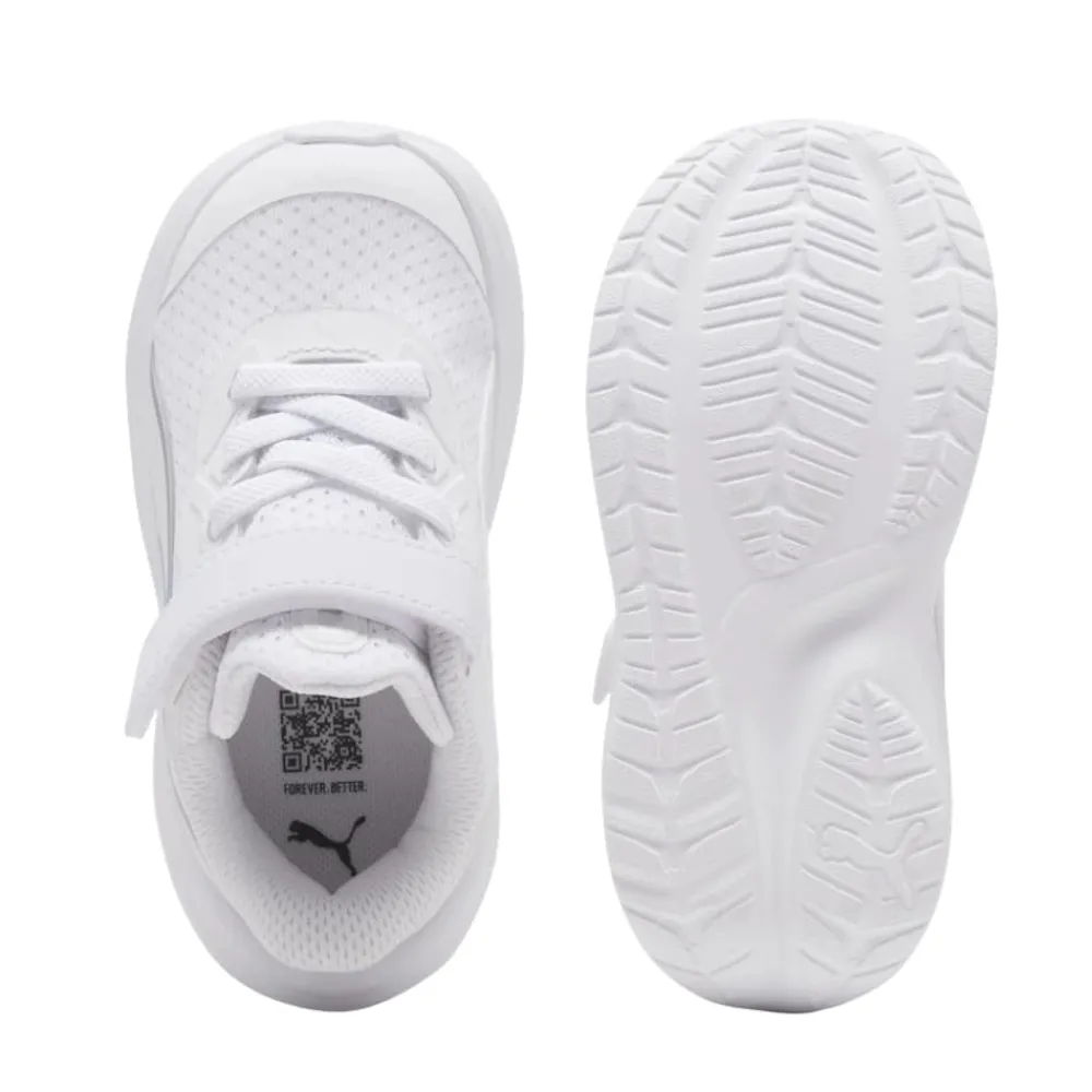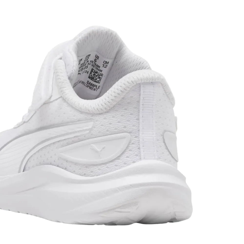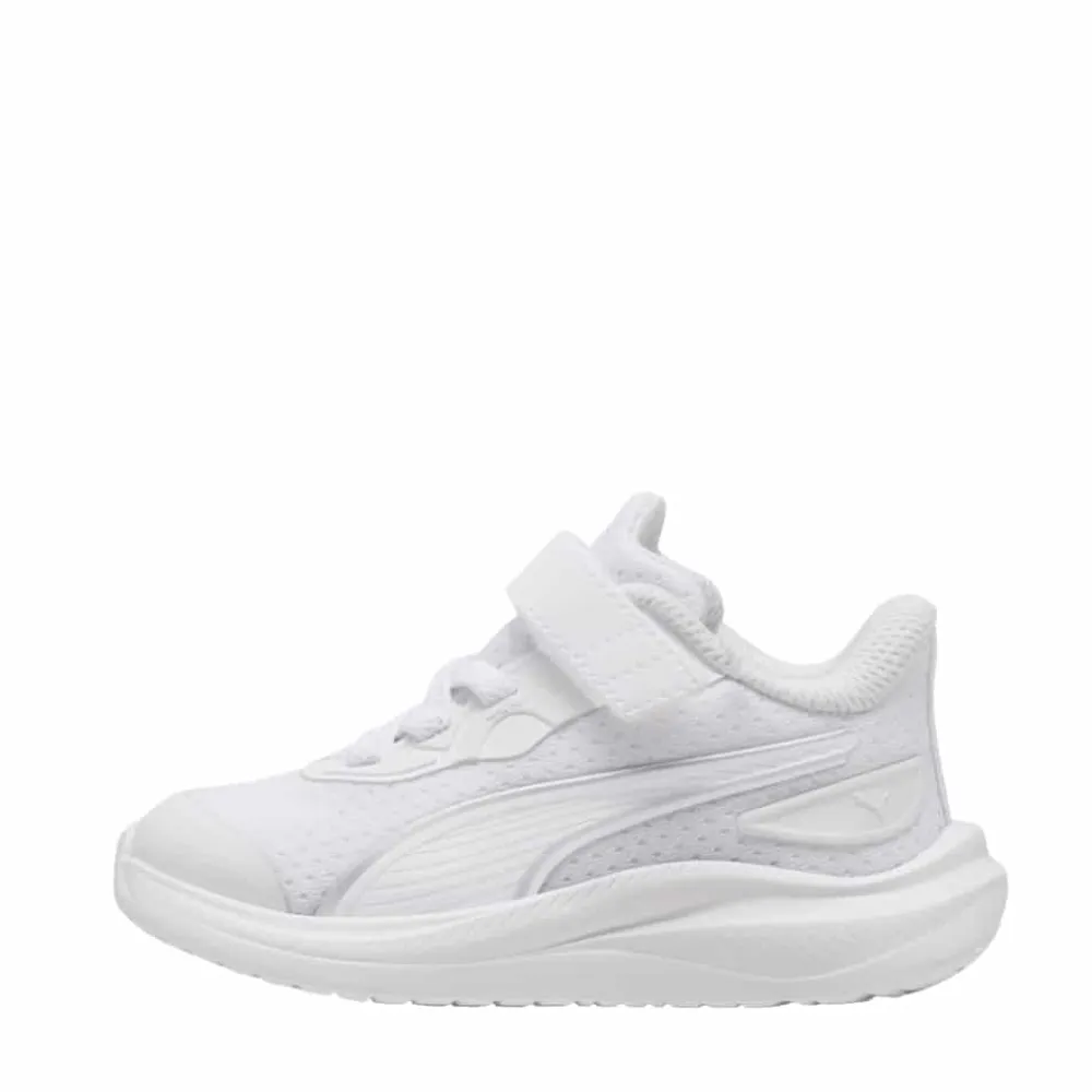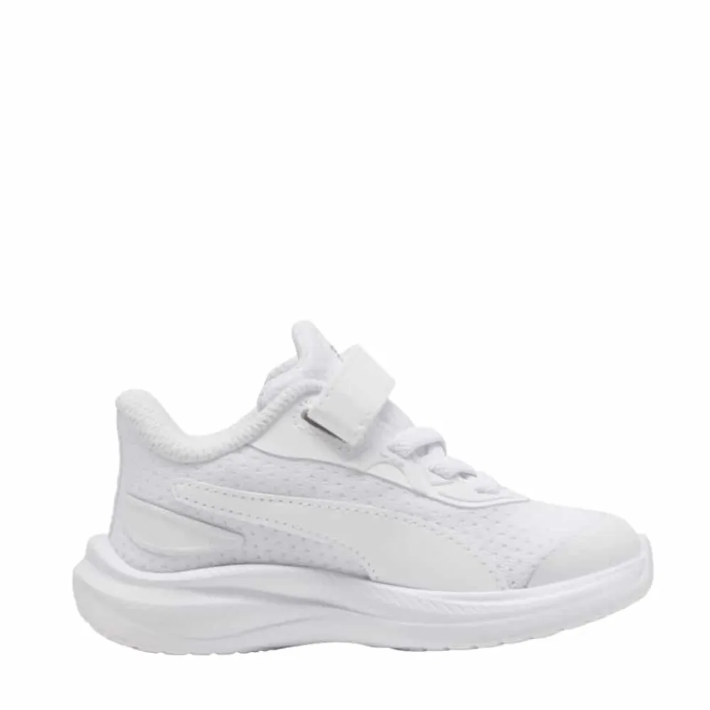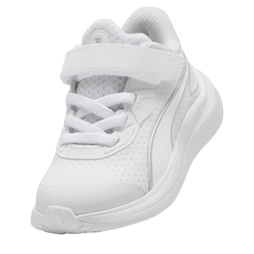 Puma Skyrocket 2 AC Sneakers til små børn i hvid. Smart sneakers i en flot hvid farve med Puma detaljer, som giver et pænt og sporty udtryk. Skoen har en velcrorem foran, der gør det nemt at tage skoen af og på, mens elastikken hjælper med at give en god pasform. Indvendigt er skoen udstyret med en blød og udtagelig SoftFoam+ indersål, som giver god komfort til små fødder hele dagen. Ydersålen i gummi er let og har et mønster, der giver øget skridsikkerhed ved leg og bevægelse.