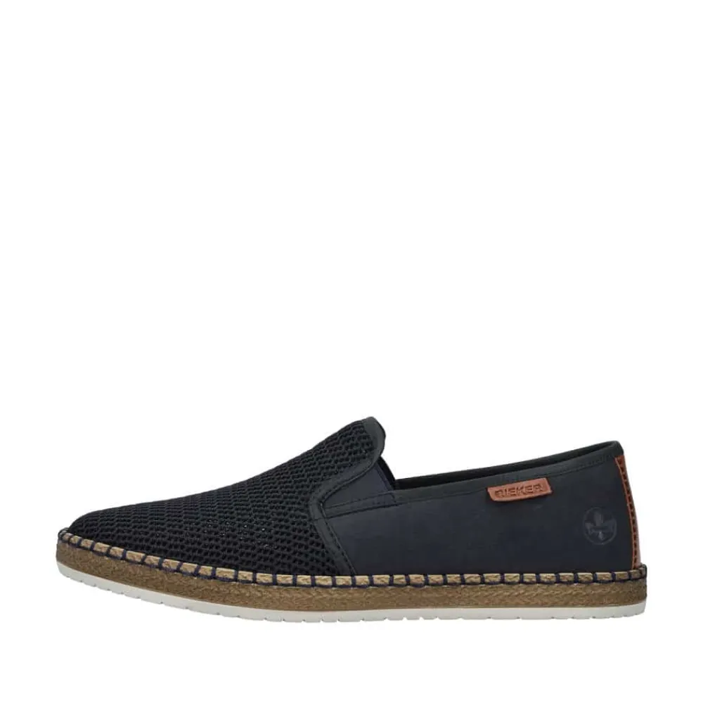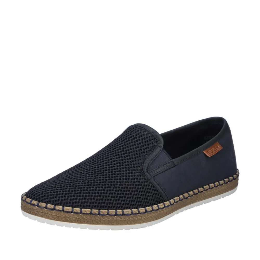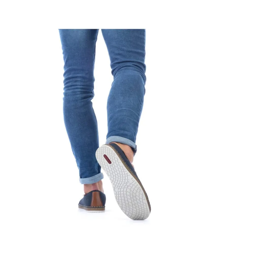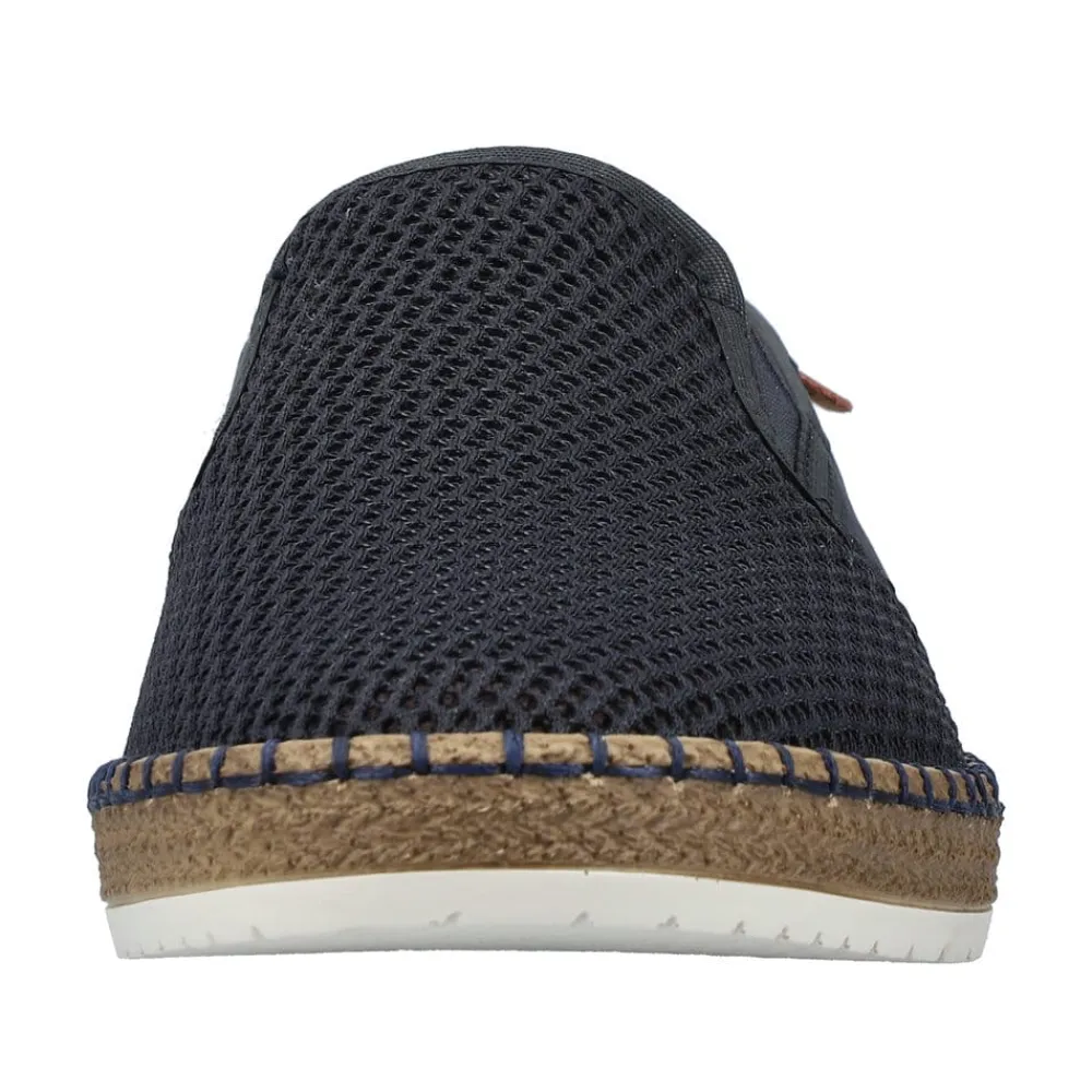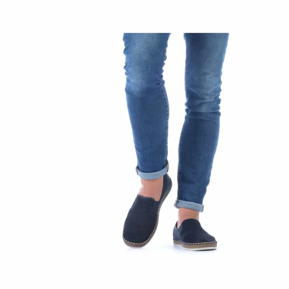 Rieker hyttesko til herre i blå. Glid ubesværet ind i denne hyttesko fra Rieker, udstyret med en indlægssål i ægte læder for øget komfort. Denne hyttesko har elastik på siderne, hvilket gør det lettere at tage dem af og på. De flotte blå syninger hele vejen rundt på skoen kombineret med en gummisål med stødabsorberende funktion forstærker komforten ved hvert skridt. De elegante netdetaljer på forsiden af skoen tilføjer et tidløst udseende.