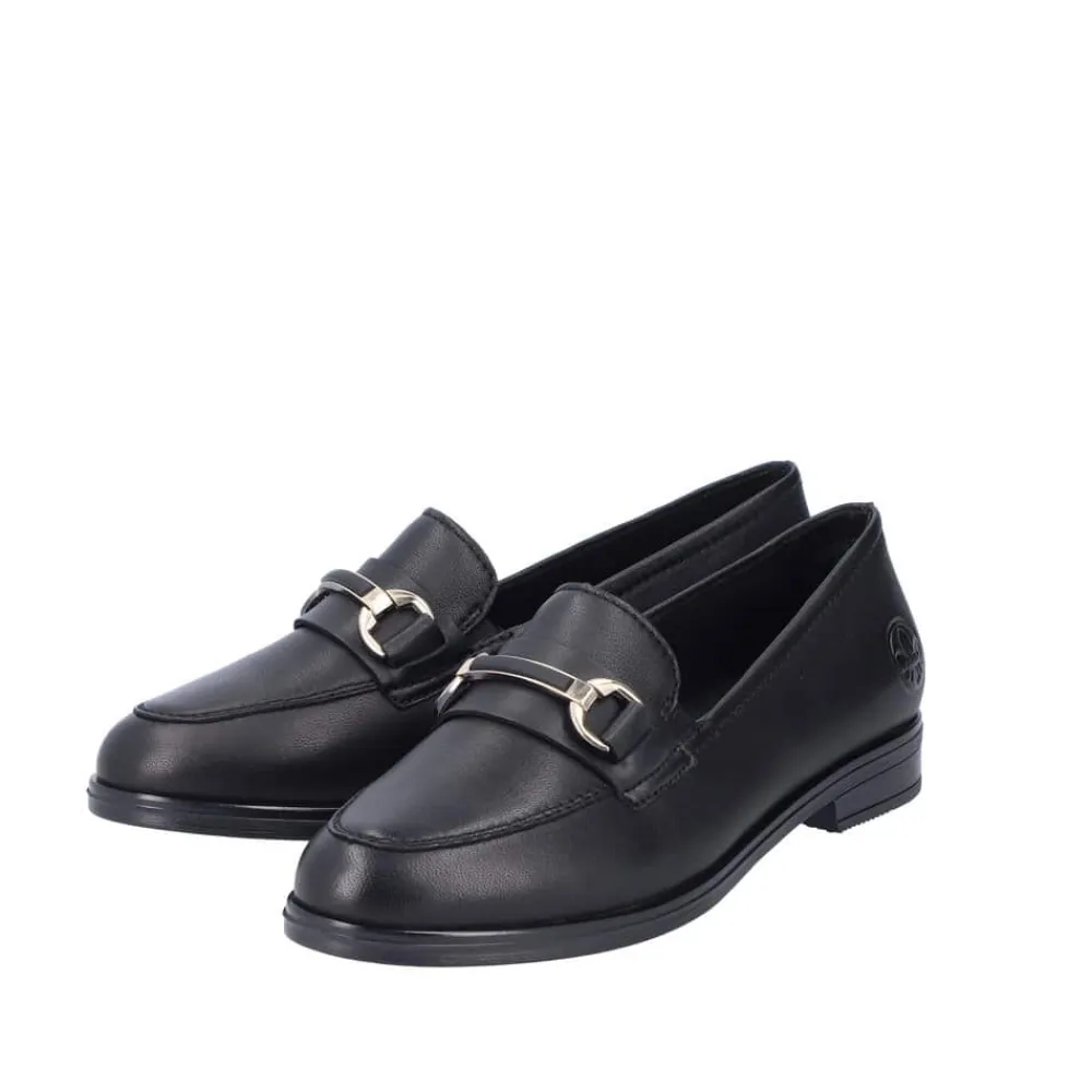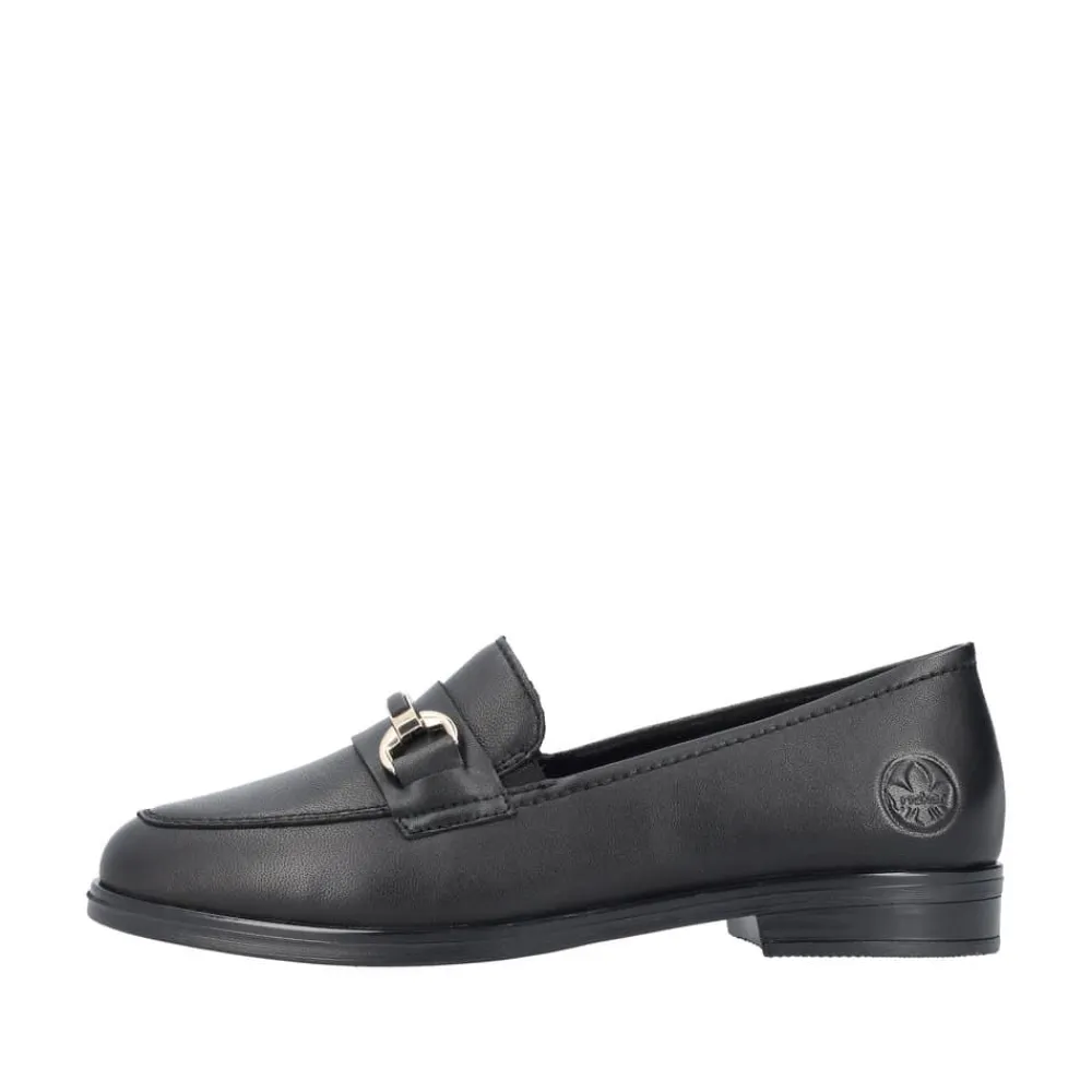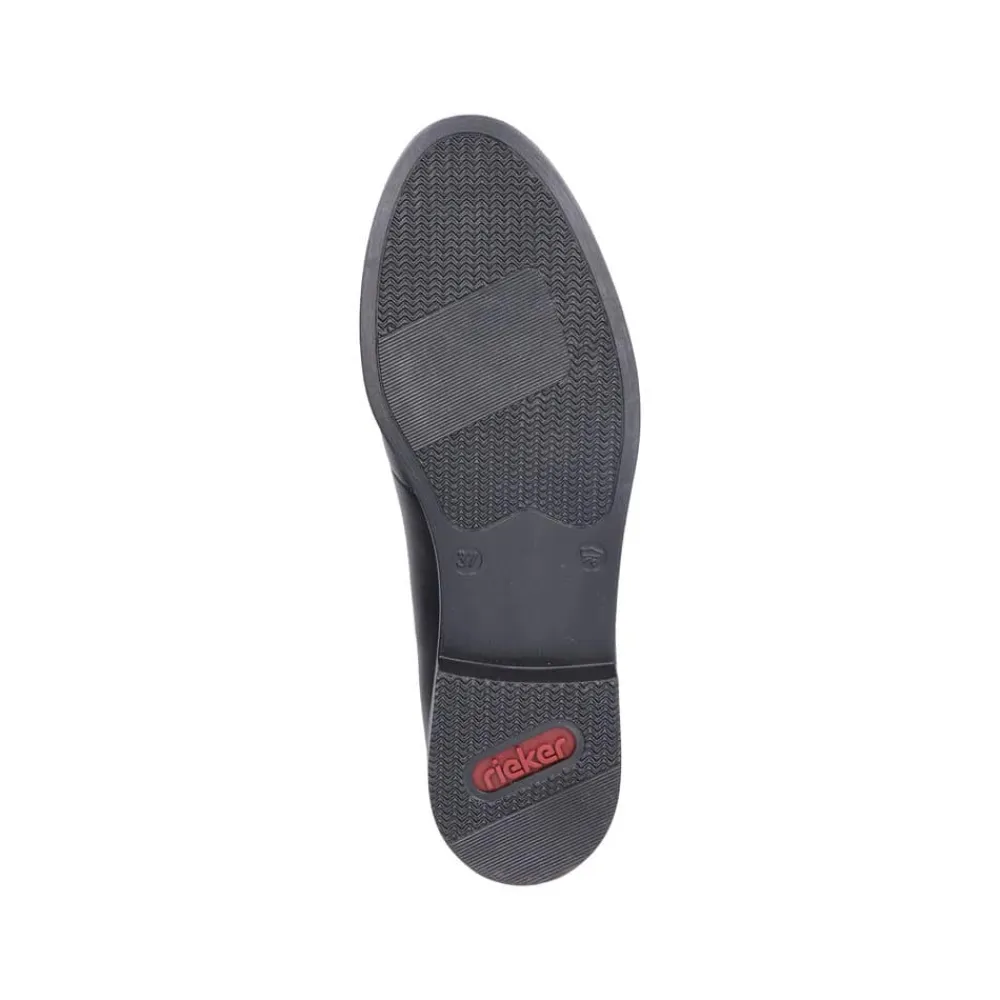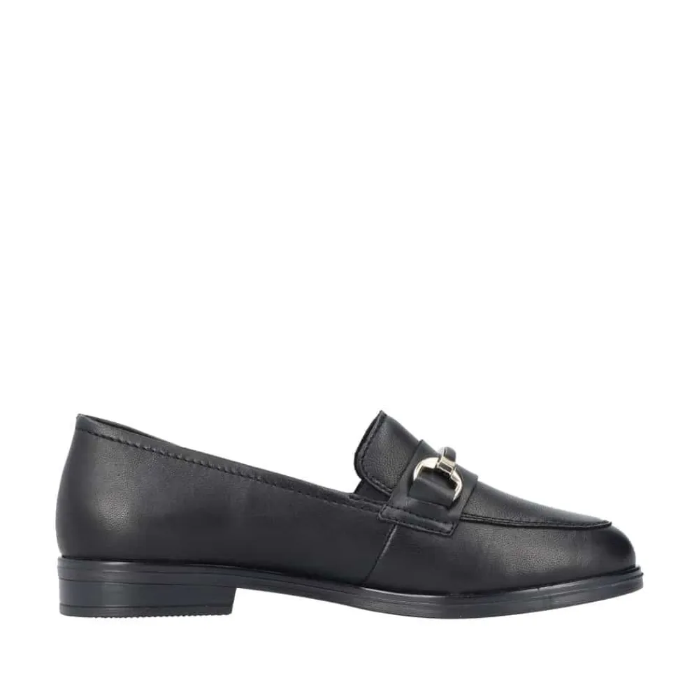 Rieker loafers til dame i sort. Denne elegante loafers kommer i en klassisk sort farve med fine detaljer. Skoen er lavet af 100% skind udvendigt og har en blød skind indersål. Modellen er let at tage på og har elastik for en god pasform. Den flotte guldkæde over forfoden tilføjer et ekstra strejf af stil. Med stødabsorberende såler sikres optimal komfort hele dagen. Skoen har også en lille hæl, som giver den et elegant udtryk. Den sorte ydersål har et godt mønster for øget skridsikkerhed.