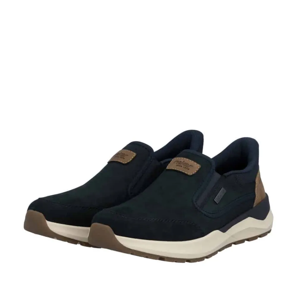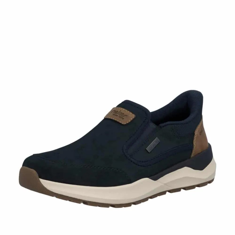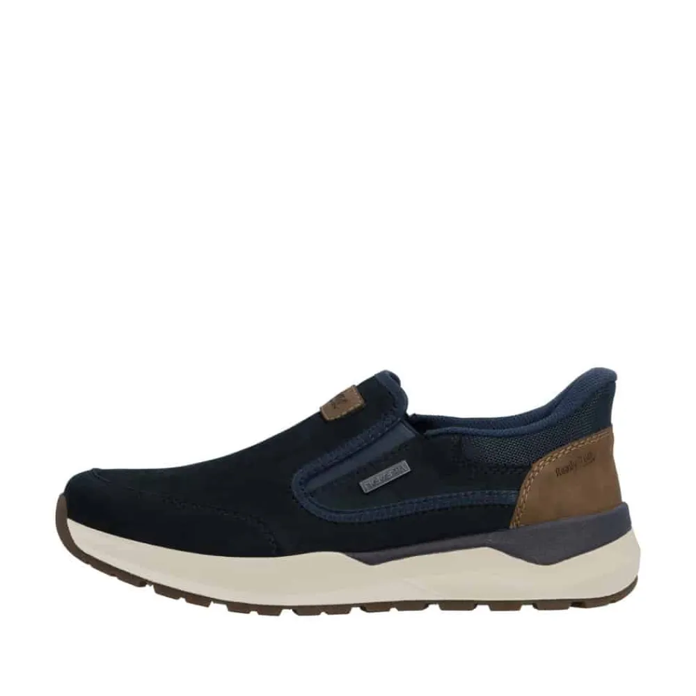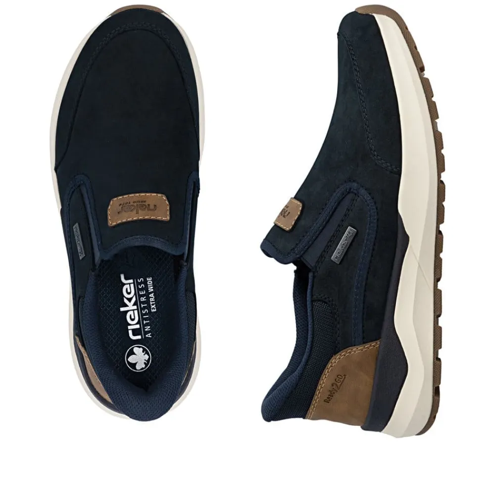Rieker Ready 2 Go hyttesko til herre i blå. Disse smarte hyttesko med en flot skindoverdel og funktionelle detaljer gør skoen praktisk til hverdagen. Skoen er udstyret med Ready 2 Go og en fast hælkappe, så du nemt kan tage skoen på uden brug af hænder. Med Rieker-Tex er skoen kraftigt vandafvisende og velegnet til skiftende vejr. Indvendigt finder du en blød og udtagelig sål samt ekstra bredde (H), som giver god komfort og rummelighed til foden. Ydersålen har mønster, der giver øget stødabsorbering og skridsikkerhed.
