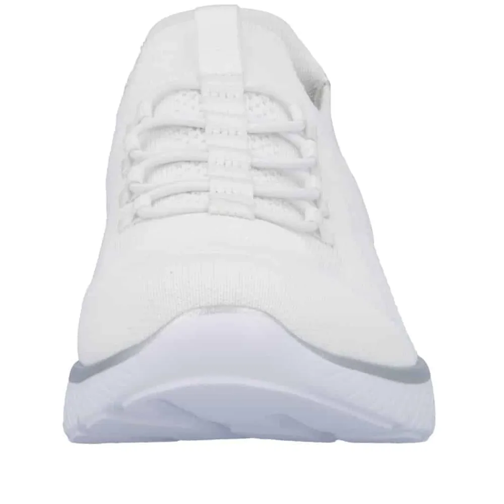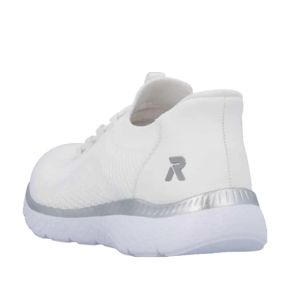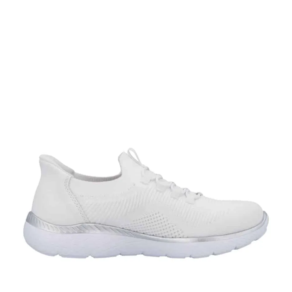 Rieker Ready 2 Go sneakers til dame i hvid. Stilfuld sneakers i hvid med fine detaljer og elastik foran, der tilpasser sig foden og giver en god pasform. Med Hands Free Ready 2 Go teknologi og fast hælkappe kan du nemt komme i skoen uden at bruge hænder. Den bløde Memosoft sål indvendigt sikrer maksimal komfort, mens den stødabsorberende ydersål med mønster giver øget stabilitet og skridsikkerhed i hvert skridt.