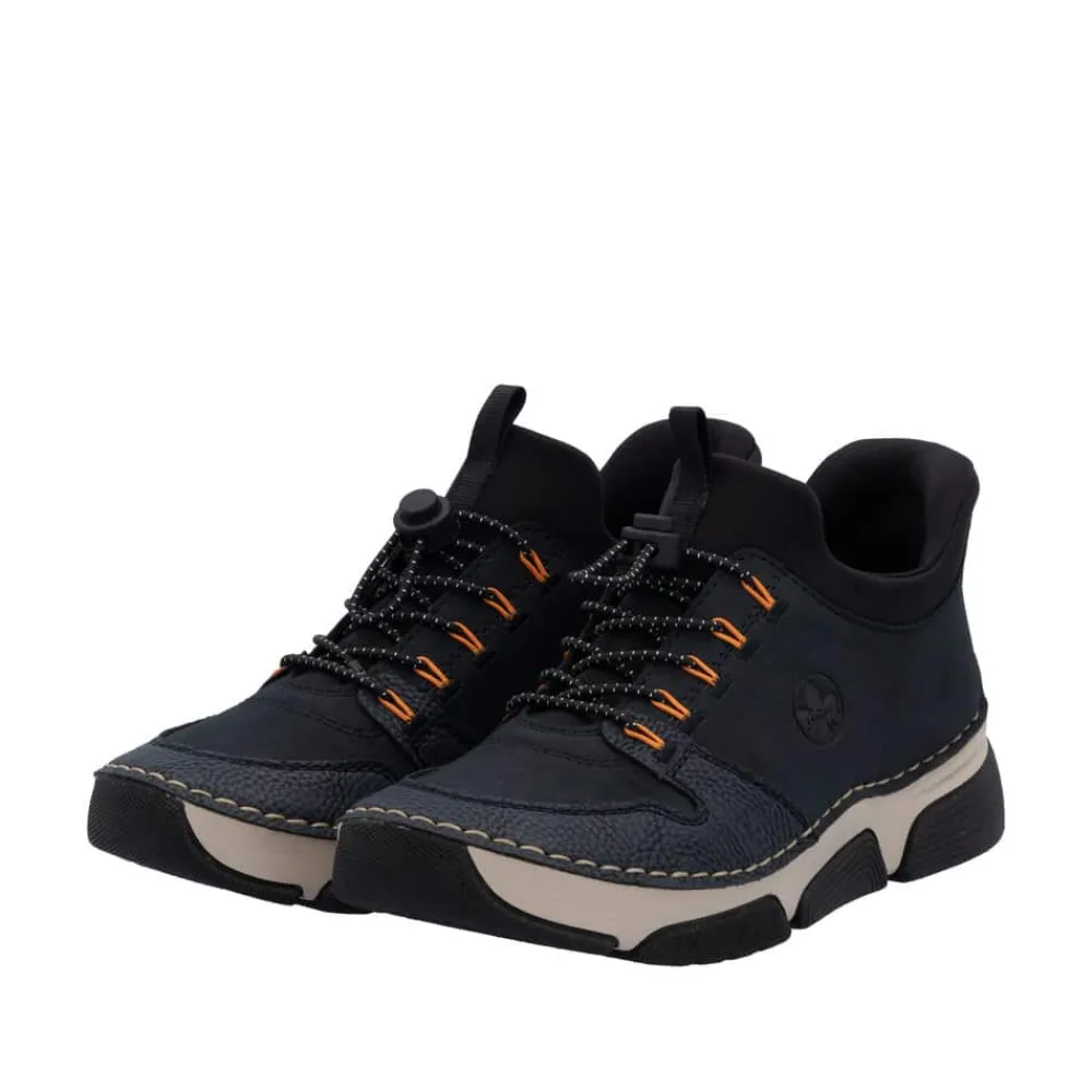 Rieker Ready 2 Go sneakers til dame i blå. Smarte sneakers med Ready 2 Go-teknologi og en fast hælkappe, der gør det nemt at tage skoen af og på uden brug af hænder. Foran har skoen en justerbar elastik, som sikrer en god pasform. Indvendigt bliver du mødt af en udtagelig blød skindsål, der giver komfort hele dagen. Med Rieker Antistress får du øget stødabsorbering og fleksibilitet.