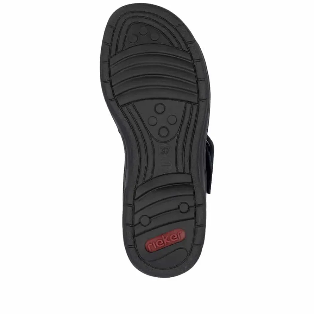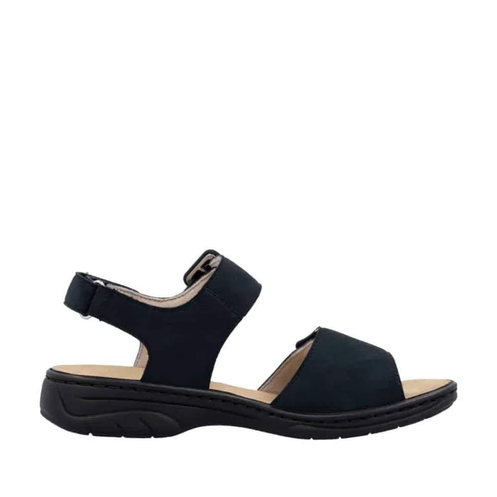Rieker sandal til dame i mørkeblå. Denne elegante sandal i en dyb mørkeblå farve kombinerer et klassisk design med en stilfuld overdel i ruskind. De tre velcroremme gør det nemt at justere pasformen og sikrer, at sandalen er let at tage af og på. Indvendigt sørger en blød og udtagelig sål for komfort hele dagen. Ydersålen er solid og designet med stødabsorbering samt et mønstret greb, der giver øget stabilitet og sikkerhed.