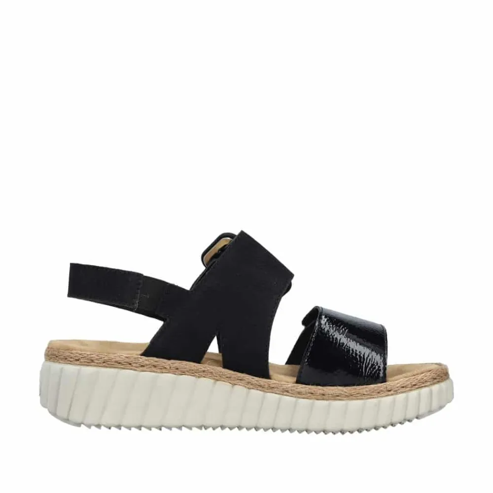 Rieker sandal til dame i sort. En sandalfavorit, der kombinerer stil og funktion. Rieker’s sandaler med en stor spænde i sort med velcro og elastik på siden sørger for, at sandalen sidder godt og komfortabelt på foden. Den lette plateausål og kilehælen på 4 cm gør sandalen ideel til lange dage, hvor du stadig ønsker at se godt ud. Den bløde indersål gør den til et perfekt valg for både afslappet brug og mere formelle begivenheder. Det sofistikerede design og den funktionelle pasform gør denne sandal til et must-have i din sommergarderobe.