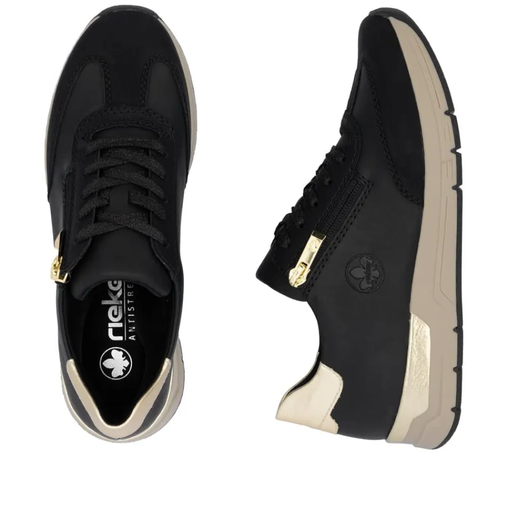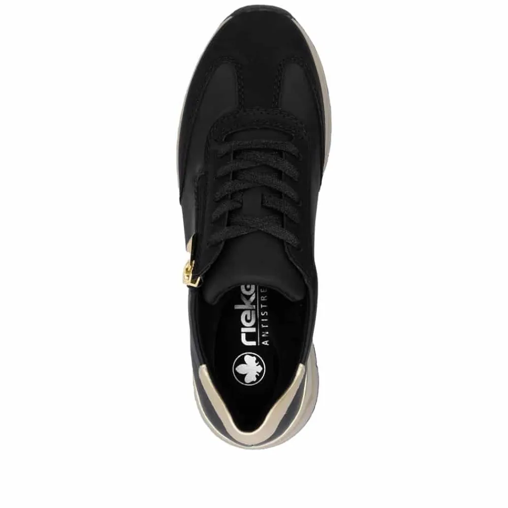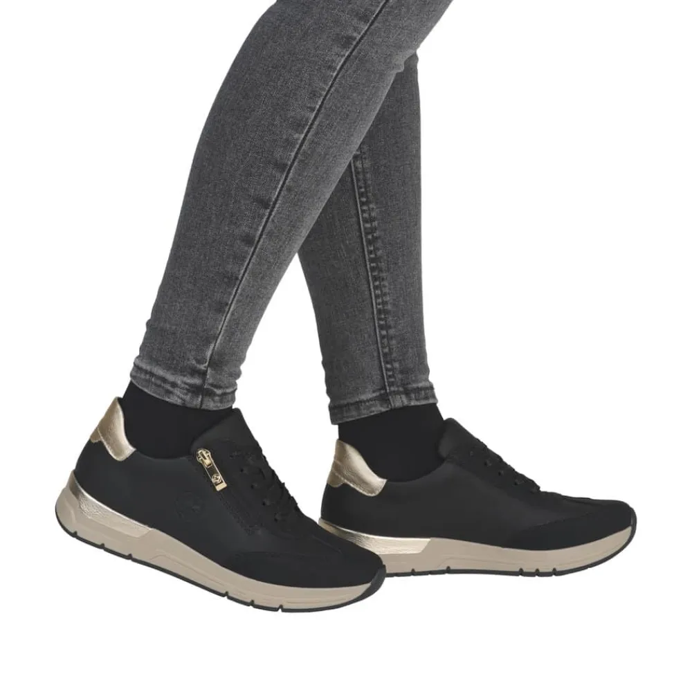 Rieker sneakers til dame i sort. Moderne sneakers i sort med flotte gulddetaljer og snørebånd med glimmer, der giver et feminint og stilfuldt udtryk. Skoen har både snørebånd og en praktisk lynlås i siden, så den er nem at tage af og på. Indvendigt bliver du mødt af en blød og udtagelig Rieker-soft sål, som giver god komfort dagen lang. Den lette og fleksible ydersål med stødabsorbering sikrer støtte og behagelig gang.