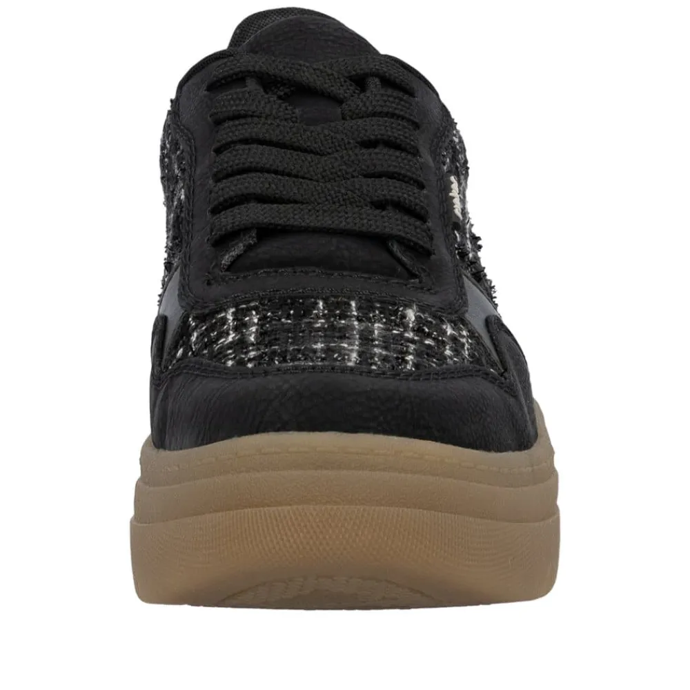 Rieker sneakers til dame i sort. Denne sneakers har en flot sort farve med fine detaljer, der giver den et smart og moderne look. Skoen er nem at tage af og på takket være snørebåndene foran, som også giver mulighed for at tilpasse pasformen. Indvendigt bliver du mødt af en blød og udtagelig indersål, som bidrager til god komfort dagen igennem. Den solide brune ydersål på 5 cm. har et godt mønster og stødabsorberende egenskaber, der sikrer støtte og skridsikkerhed.