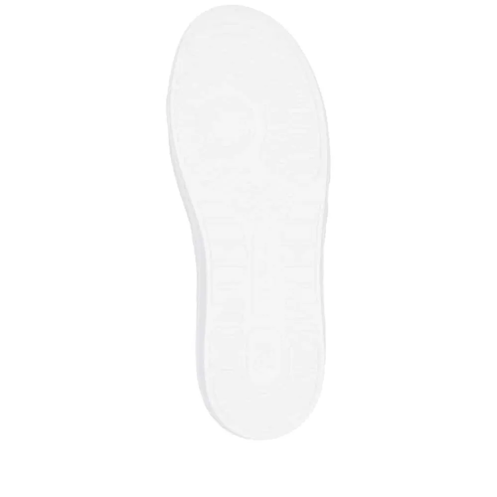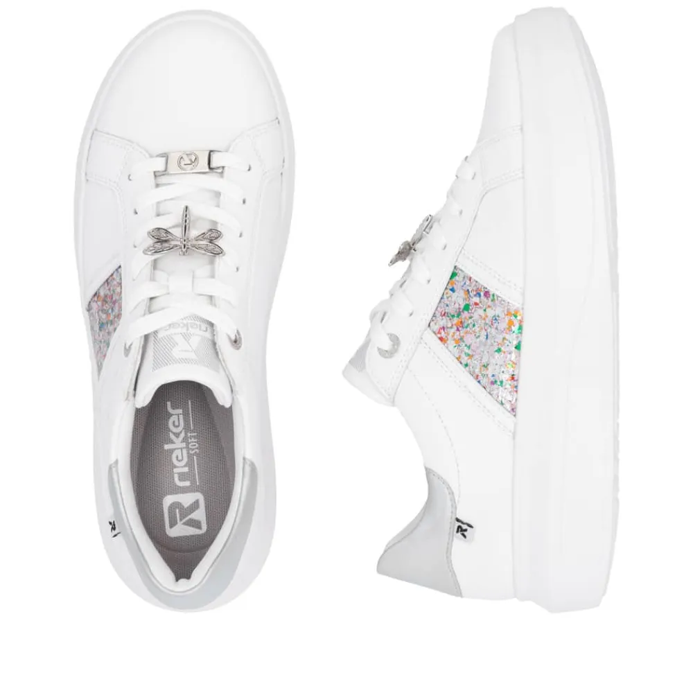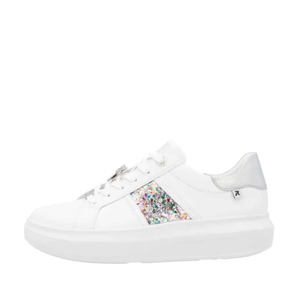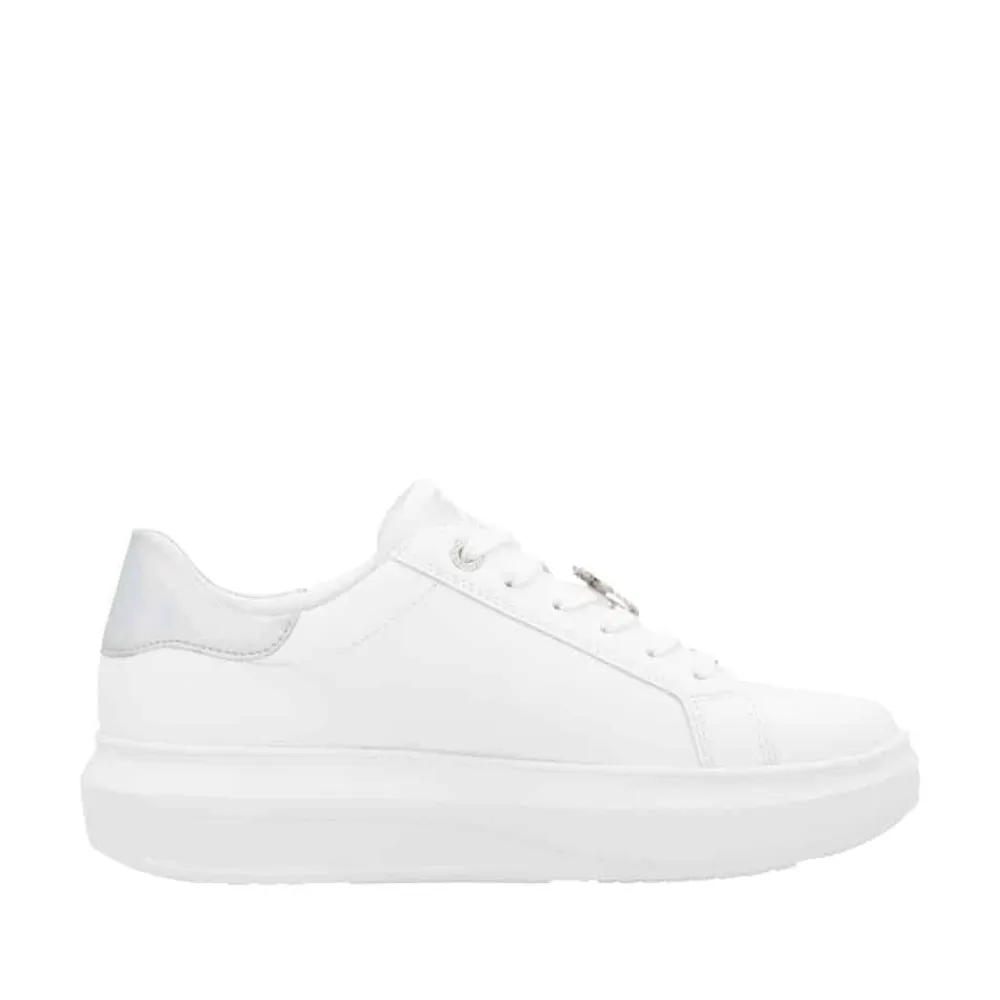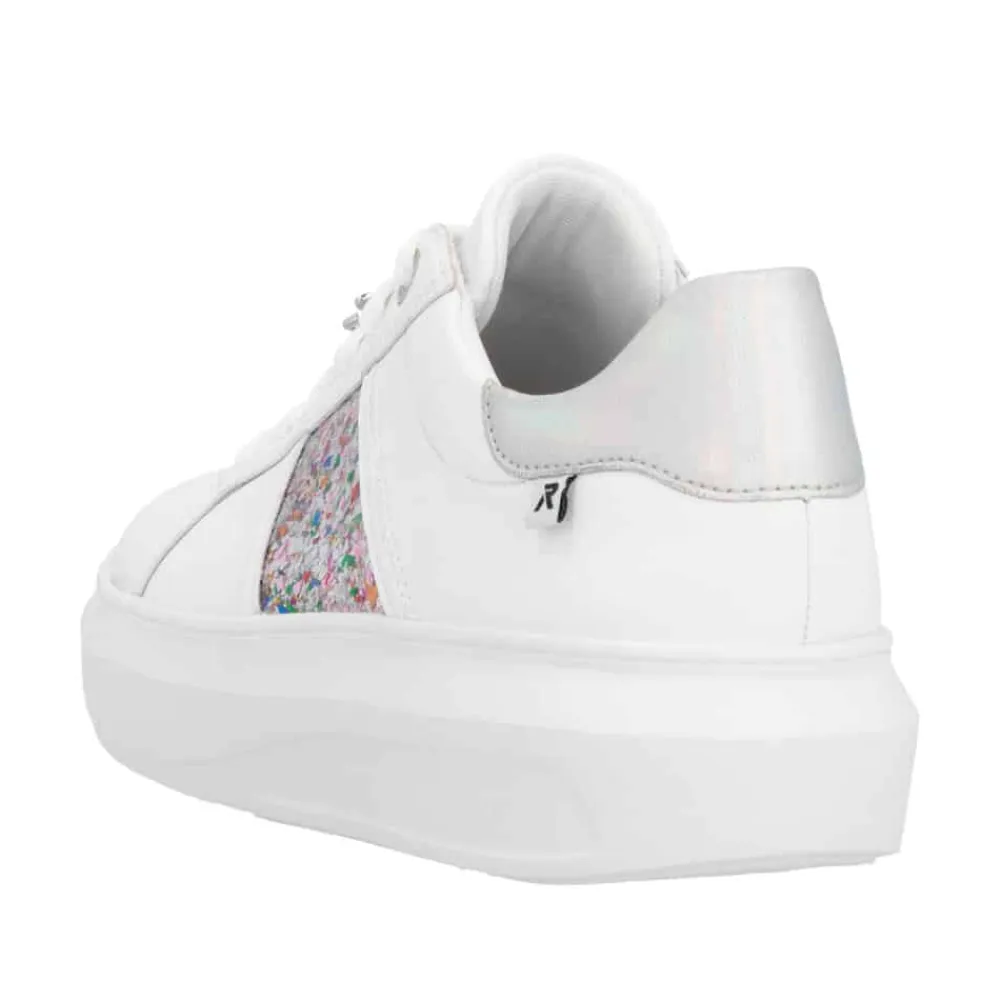 Rieker sneakers til dame i hvid. Disse elegante sneakers kombinerer stil og komfort med en eksklusiv skindoverdel og fine farvedetaljer på siden. Den lette og stødabsorberende sål giver en behagelig gangoplevelse hele dagen, mens den fleksible konstruktion gør dem perfekte til hverdagsbrug. Detaljer som en sølvfarvet stribe langs ydersiden og en raffineret guldsmeddetalje tilføjer et luksuriøst touch. De udtagelige indersåler med Rieker Soft-teknologi tilpasser sig foden for maksimal komfort, og den skridsikre TR-gummisål sikrer stabilitet og sikkerhed på alle underlag. Ideelle til både dagligdag og særlige lejligheder.