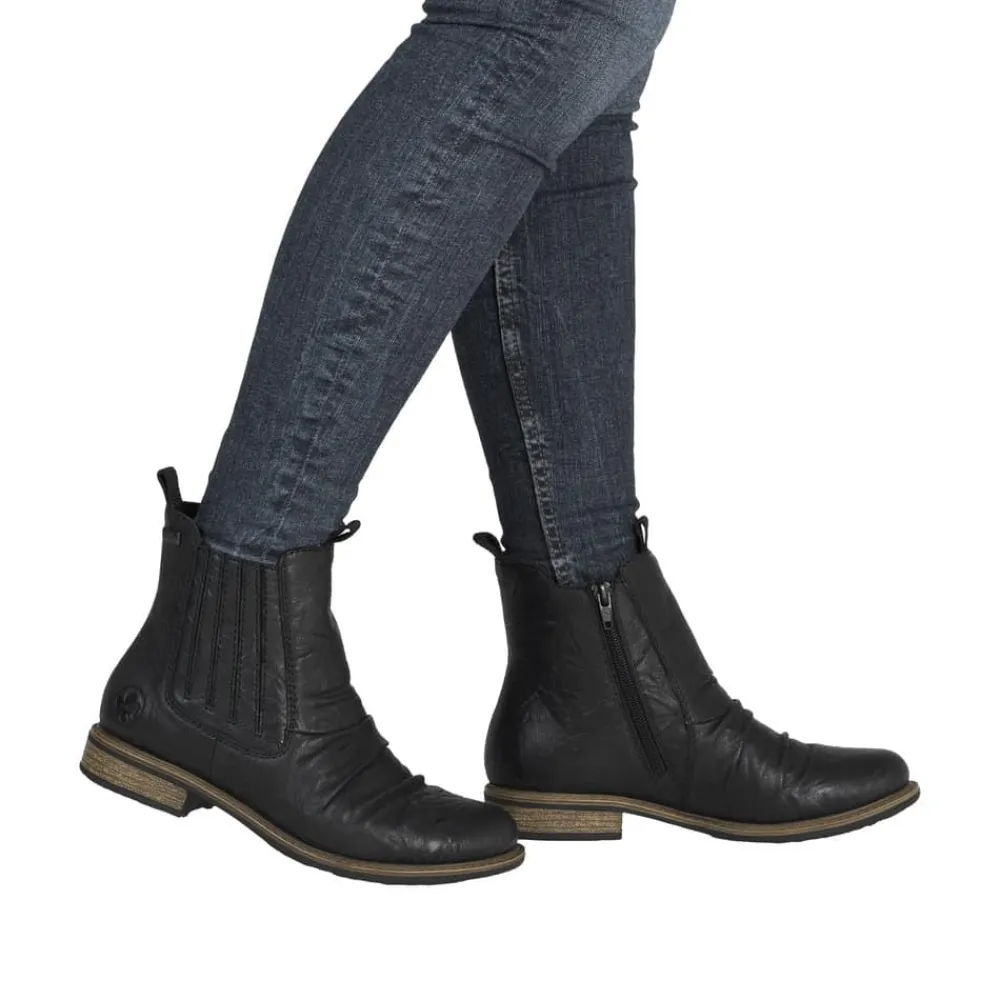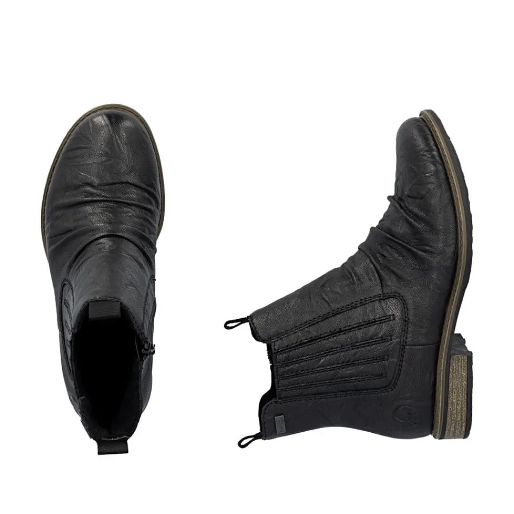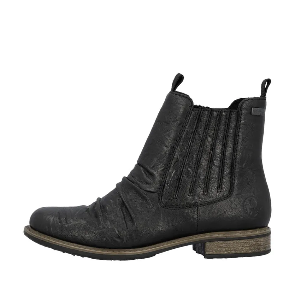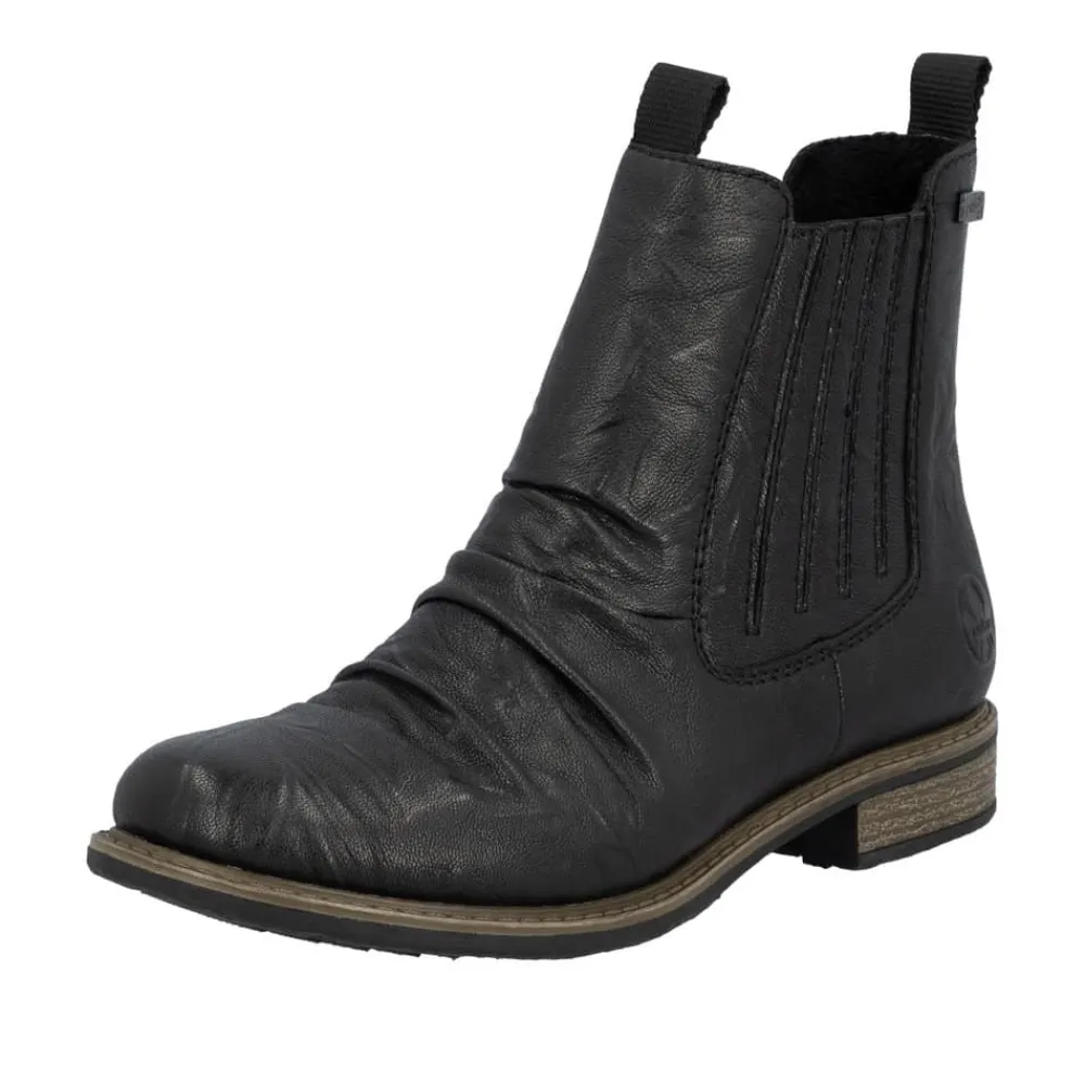 Rieker støvle til dame i sort. En stilfuld støvle i sort med rynkede detaljer, der giver et tidløst og feminint look. Overdelen er i skind, og støvlen har elastik på ydersiden og lynlås på indersiden, som gør den let at tage på og giver en god pasform. Indvendigt er der en let foring og en blød, udtagelig indersål med ekstra bredde H, som giver maksimal komfort og ekstra plads. Rieker Tex gør støvlen kraftigt vandafvisende, mens hælen på 2,5 cm tilfører et elegant løft. Den stødabsorberende ydersål med mønster giver øget støtte og skridsikkerhed.