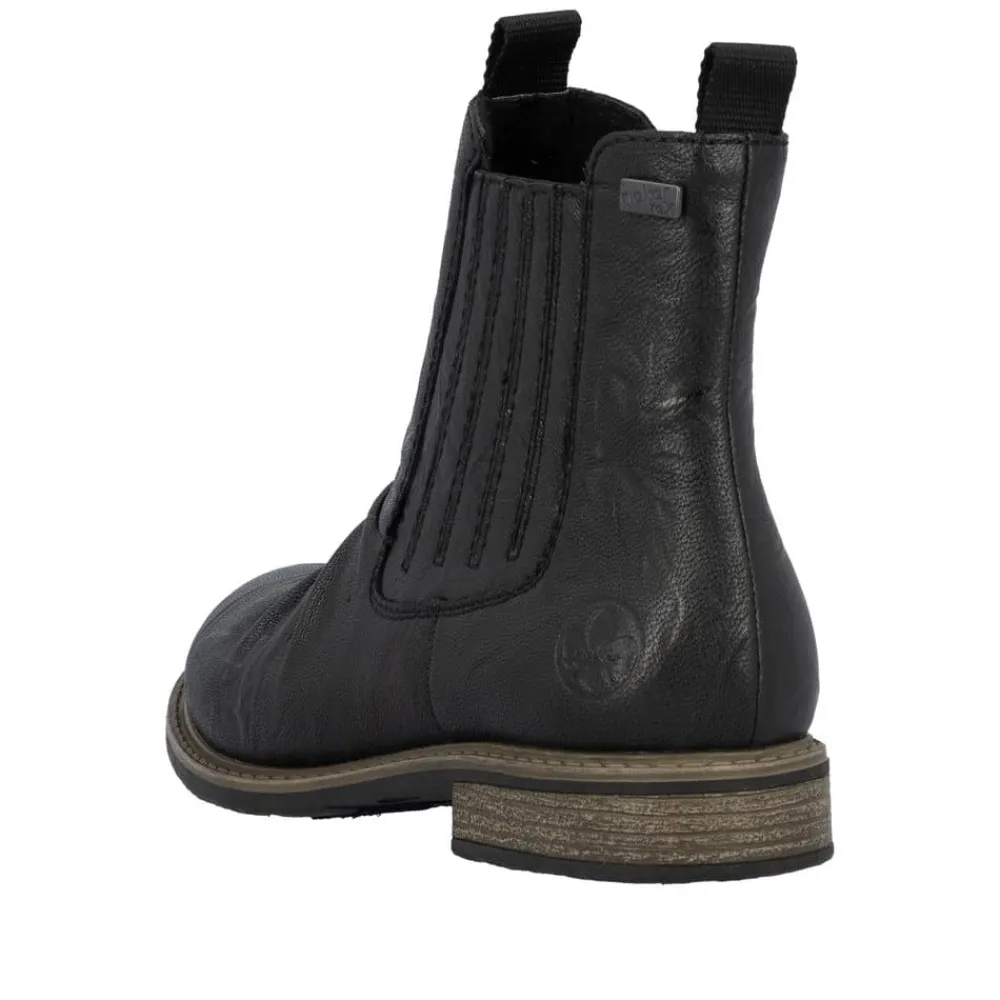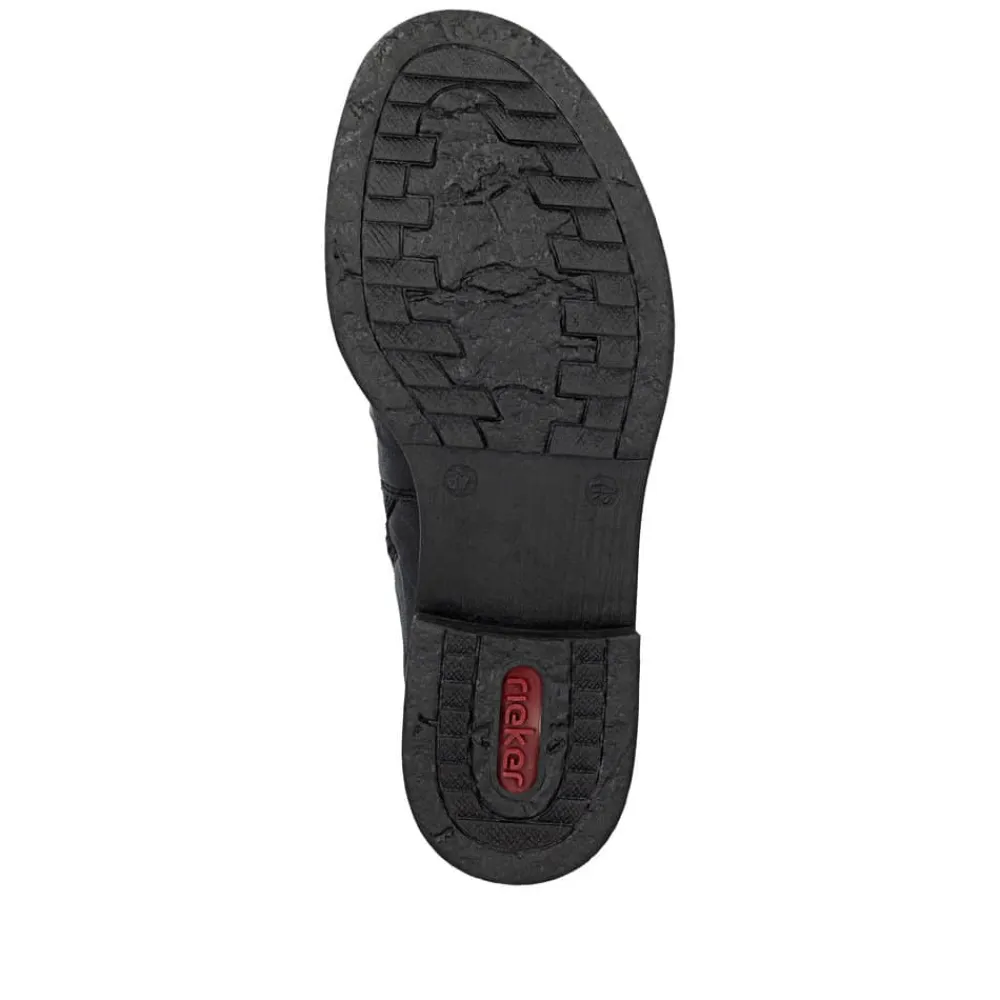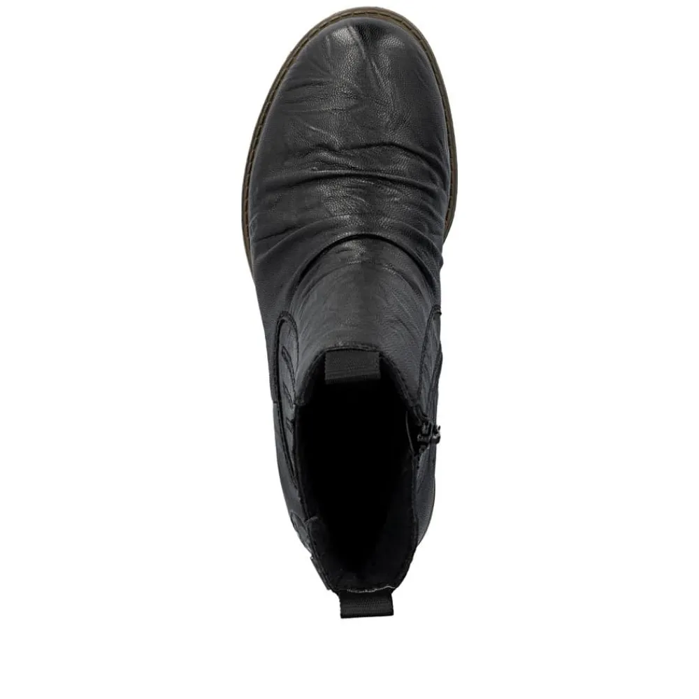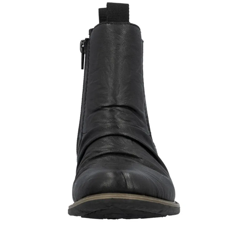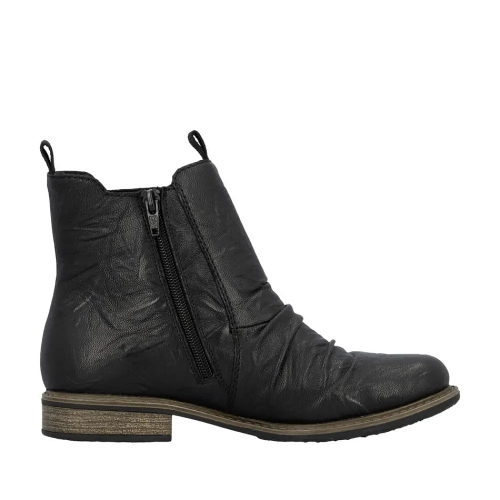 Rieker støvle til dame i sort. En stilfuld støvle i sort med rynkede detaljer, der giver et tidløst og feminint look. Overdelen er i skind, og støvlen har elastik på ydersiden og lynlås på indersiden, som gør den let at tage på og giver en god pasform. Indvendigt er der en let foring og en blød, udtagelig indersål med ekstra bredde H, som giver maksimal komfort og ekstra plads. Rieker Tex gør støvlen kraftigt vandafvisende, mens hælen på 2,5 cm tilfører et elegant løft. Den stødabsorberende ydersål med mønster giver øget støtte og skridsikkerhed.