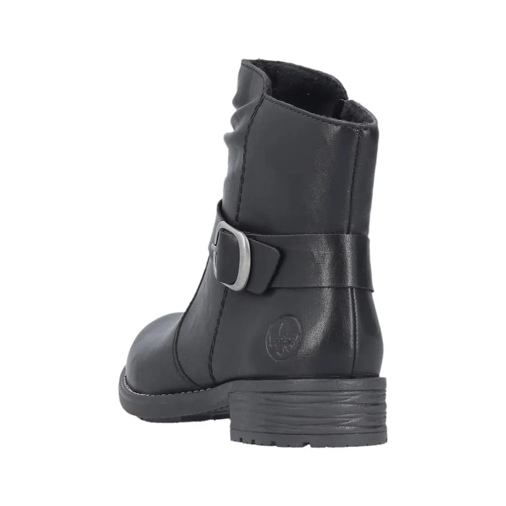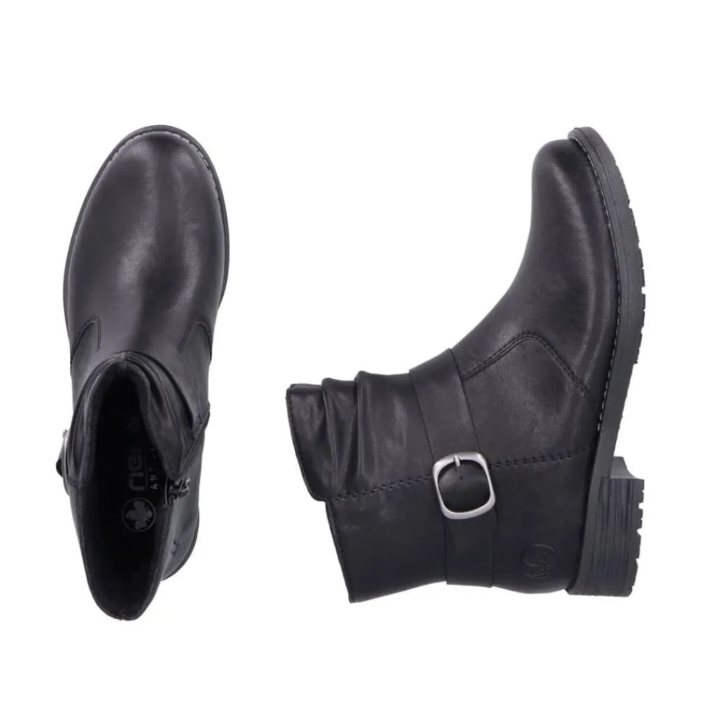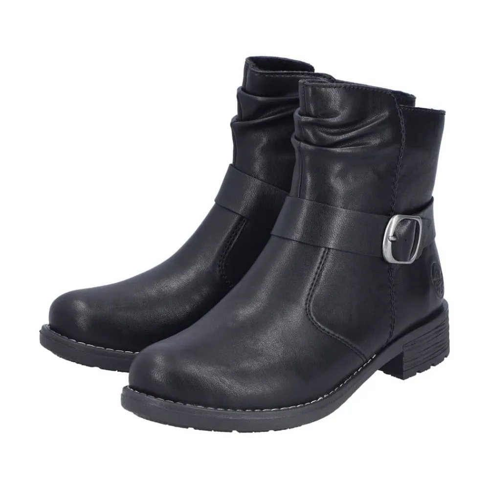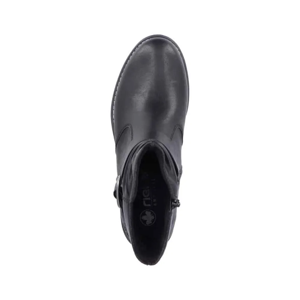 Rieker støvle til dame i sort. Denne sorte støvle kombinerer et klassisk design med moderne detaljer. Den smukke spænde på siden giver et stilfuldt udtryk, og lynlåsen på indersiden gør det enkelt at tage støvlen af og på. Indvendigt er den udstyret med en let foring og en blød, udtagelig indersål, som sikrer behagelig komfort dagen igennem. Med en blokhæl på ca. 3,5 cm får du et flot løft, mens ydersålen med stødabsorbering og mønster giver stabilitet og øget skridsikkerhed.