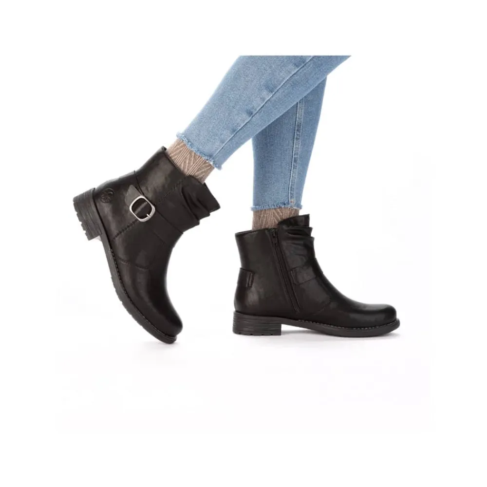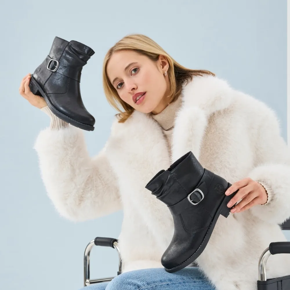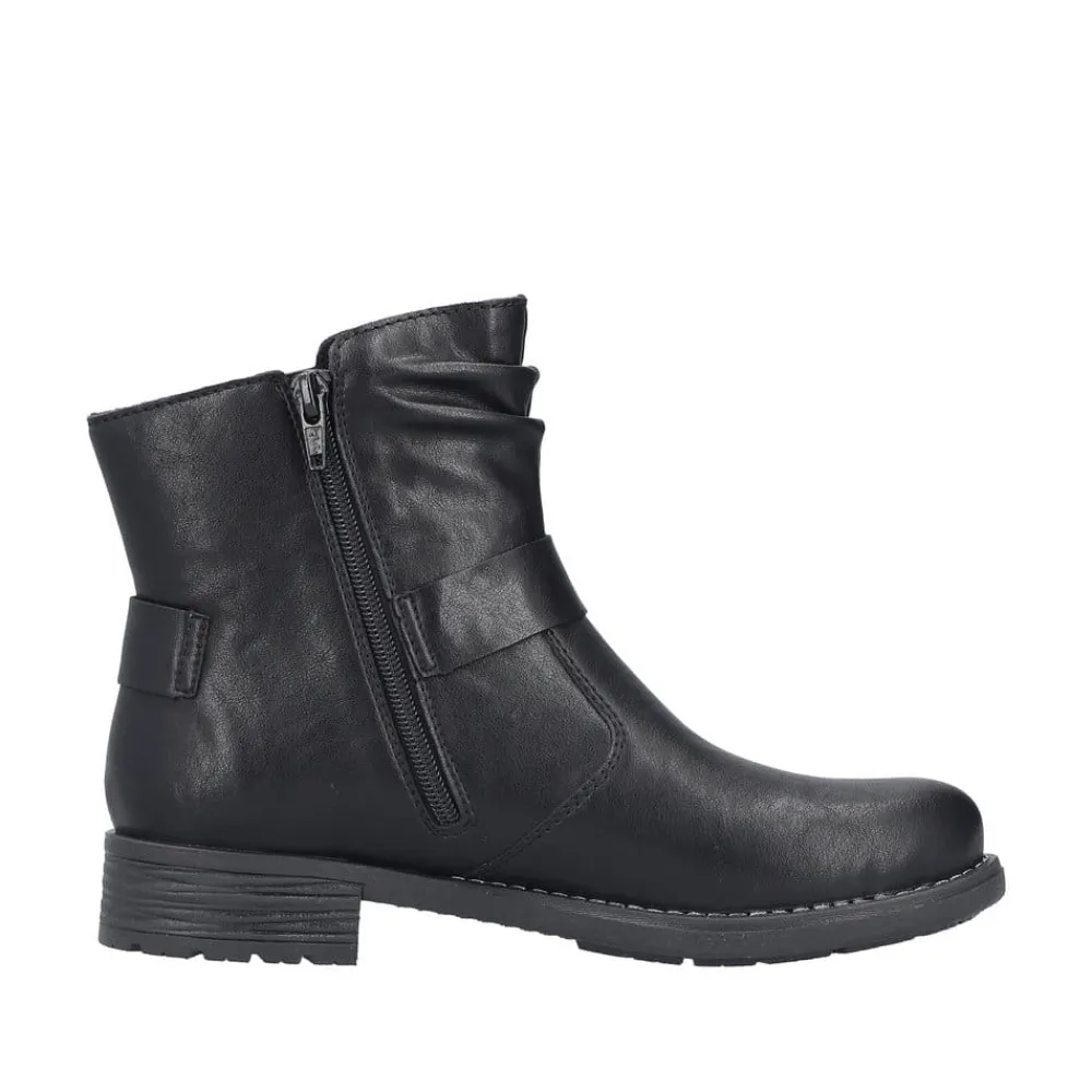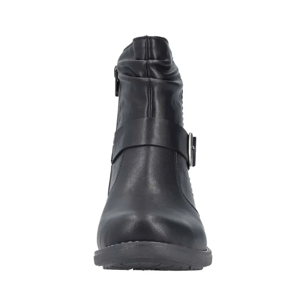Rieker støvle til dame i sort. Denne sorte støvle kombinerer et klassisk design med moderne detaljer. Den smukke spænde på siden giver et stilfuldt udtryk, og lynlåsen på indersiden gør det enkelt at tage støvlen af og på. Indvendigt er den udstyret med en let foring og en blød, udtagelig indersål, som sikrer behagelig komfort dagen igennem. Med en blokhæl på ca. 3,5 cm får du et flot løft, mens ydersålen med stødabsorbering og mønster giver stabilitet og øget skridsikkerhed.