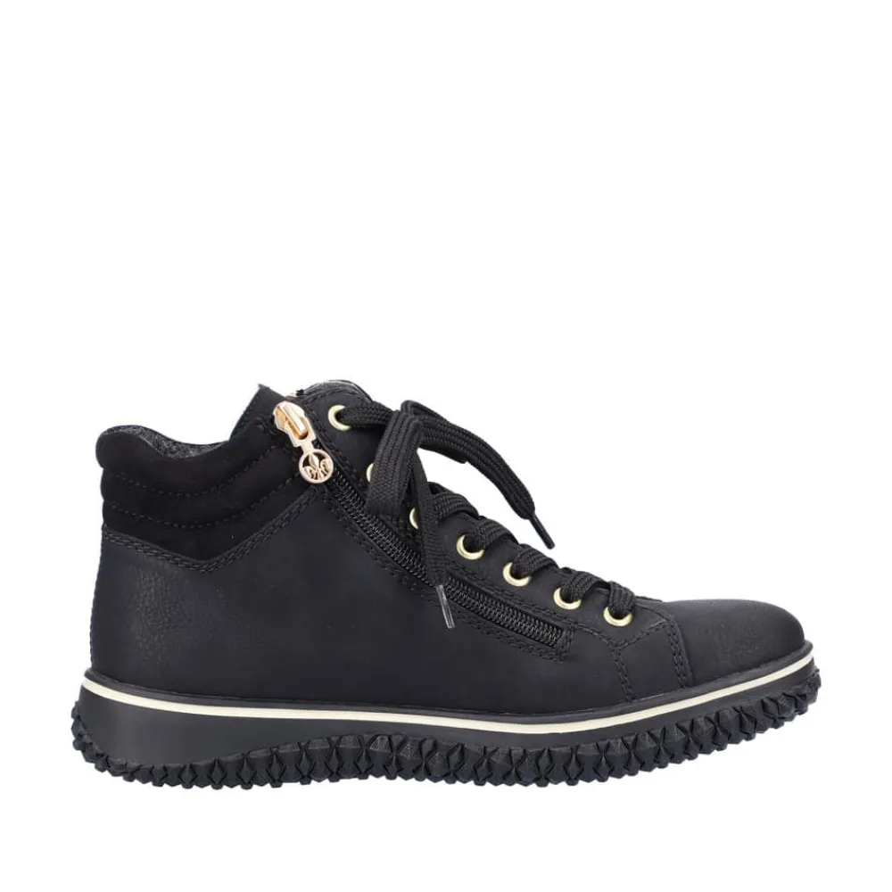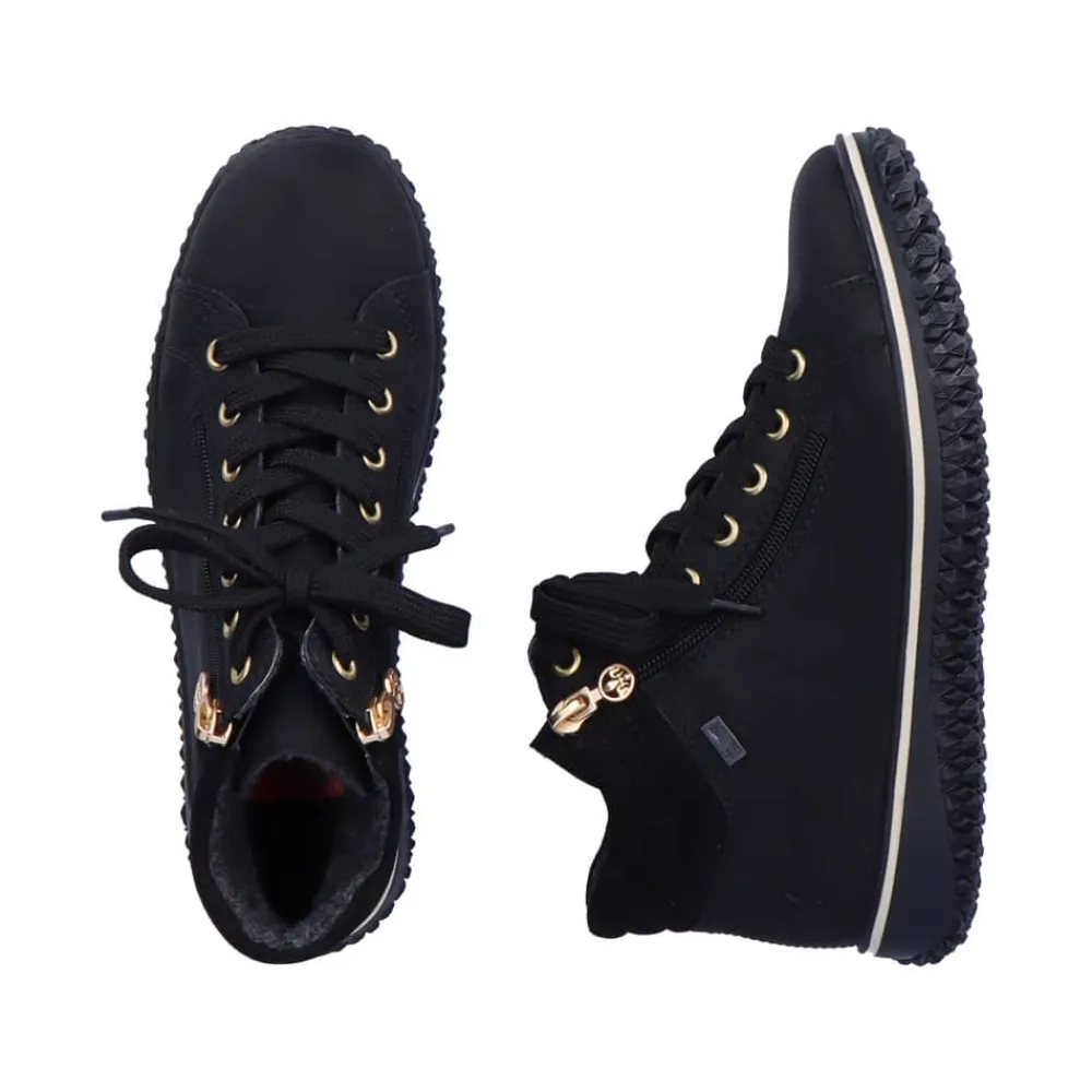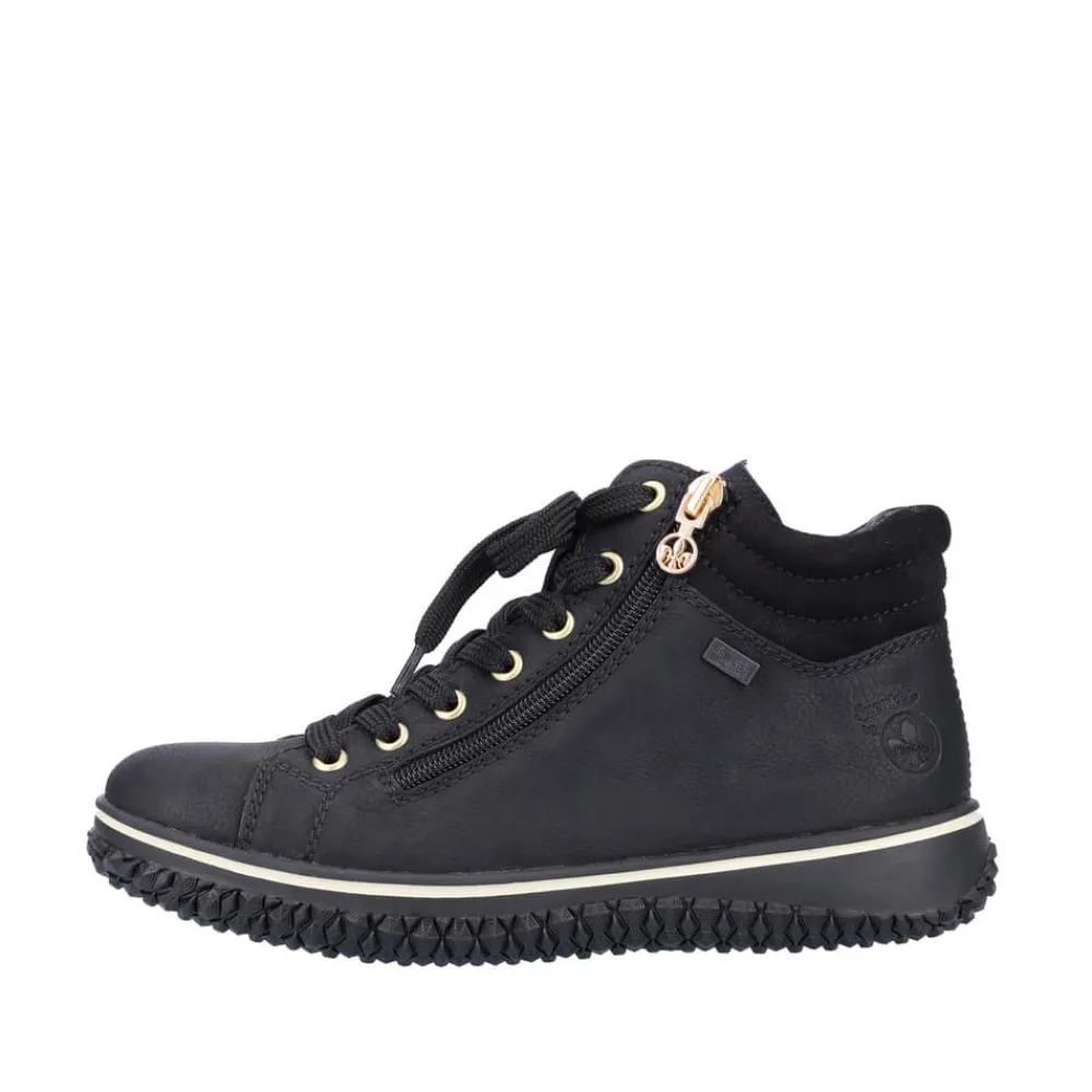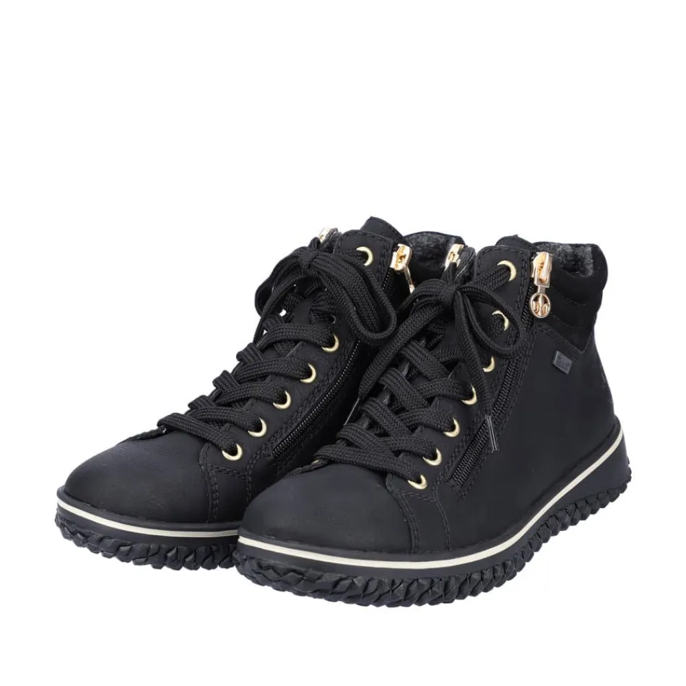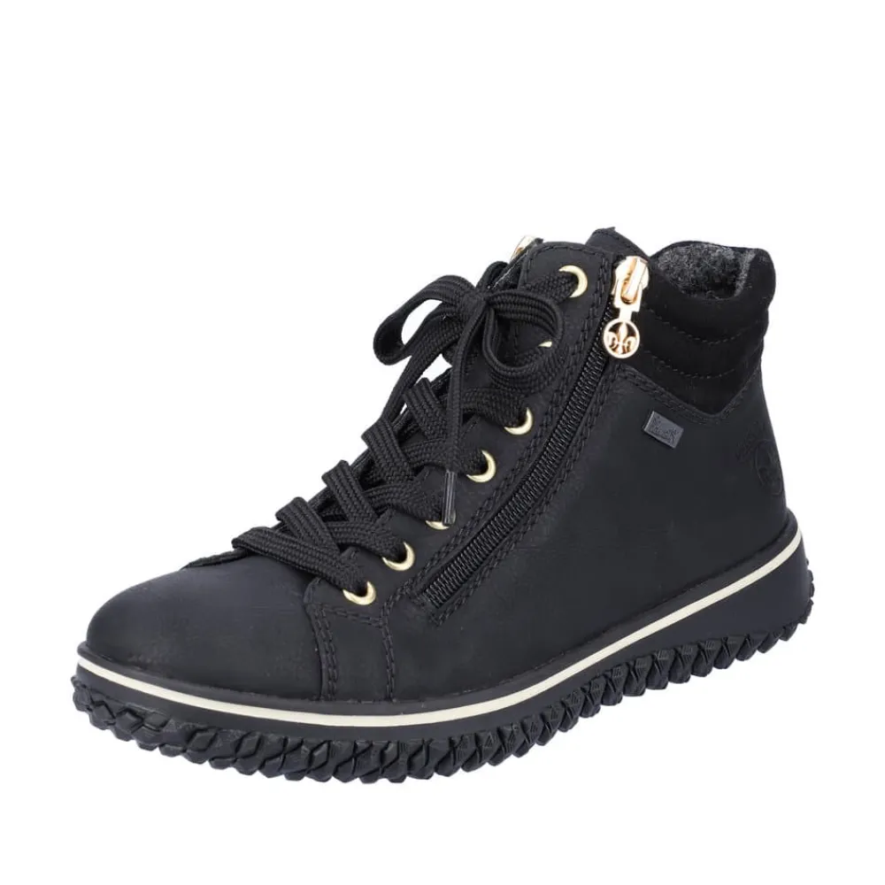 Rieker støvle til dame i sort. Denne sorte støvle med elegante gulddetaljer kombinerer lethed og fleksibilitet, hvilket gør den ideel til hverdagsbrug. Med både snørebånd og to lynlåse er støvlen nem at få af og på, og den lette foring indvendigt gør den komfortabel året rundt. Rieker-Tex-teknologien beskytter mod regn og fugt, så dine fødder forbliver tørre, selv i vådt vejr. Den ikoniske Rieker-sål giver effektiv stødabsorbering og har et skridsikkert mønster, der sikrer stabilitet på glatte overflader.