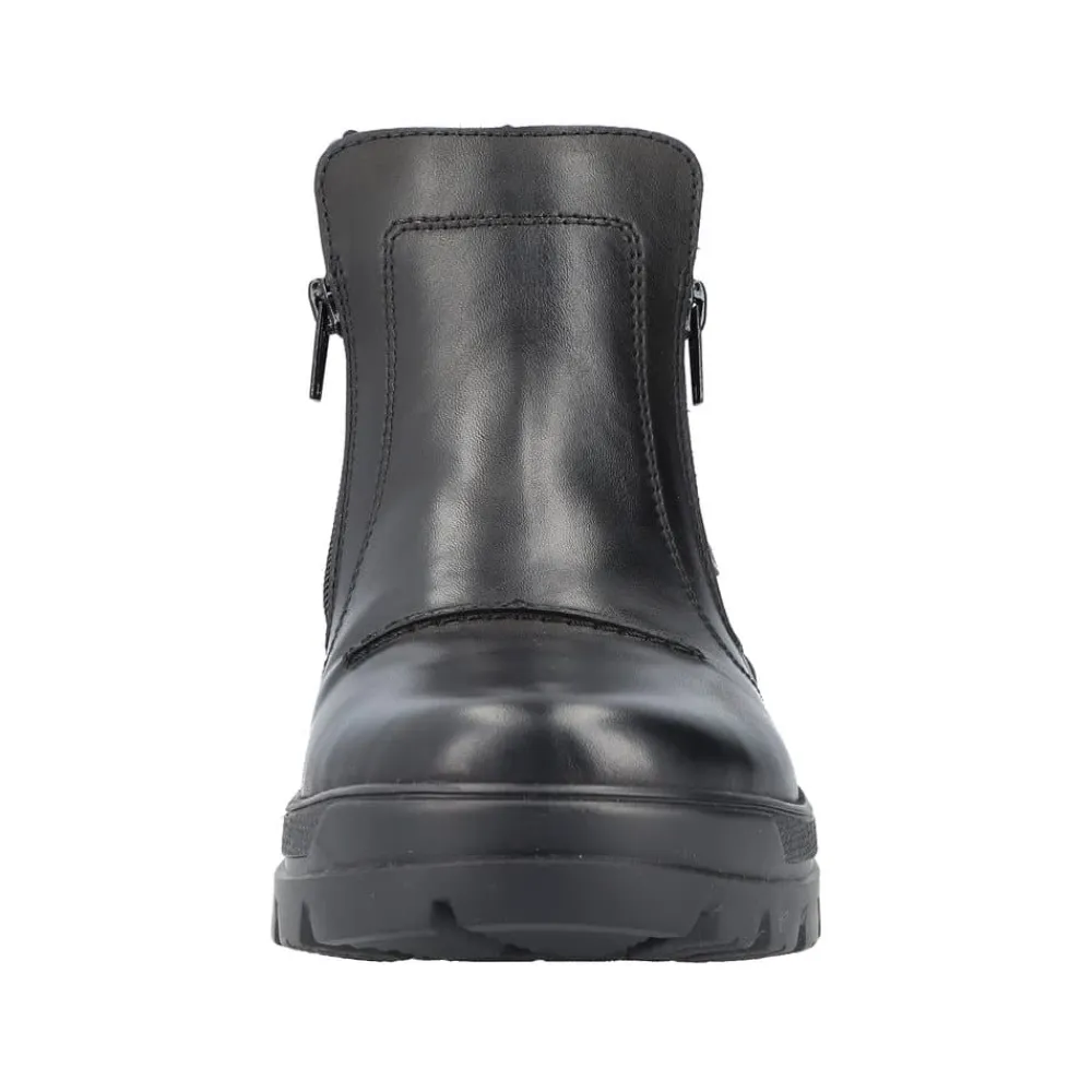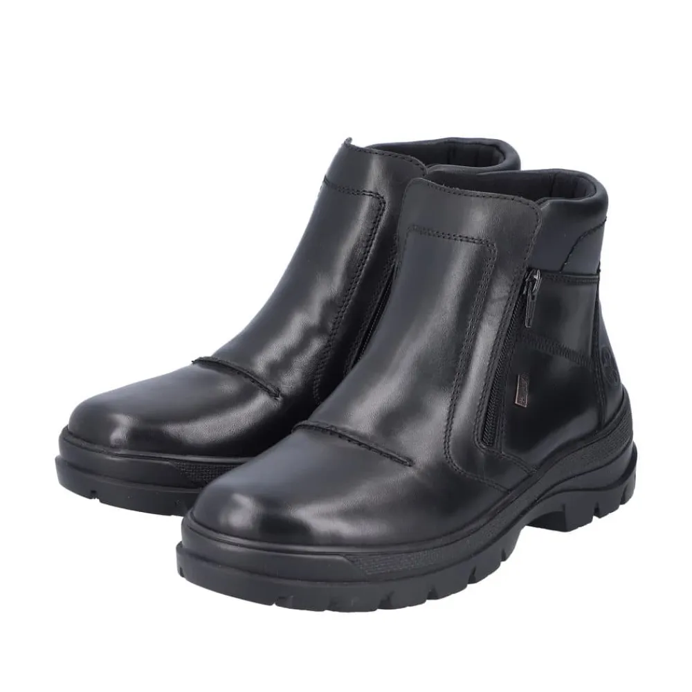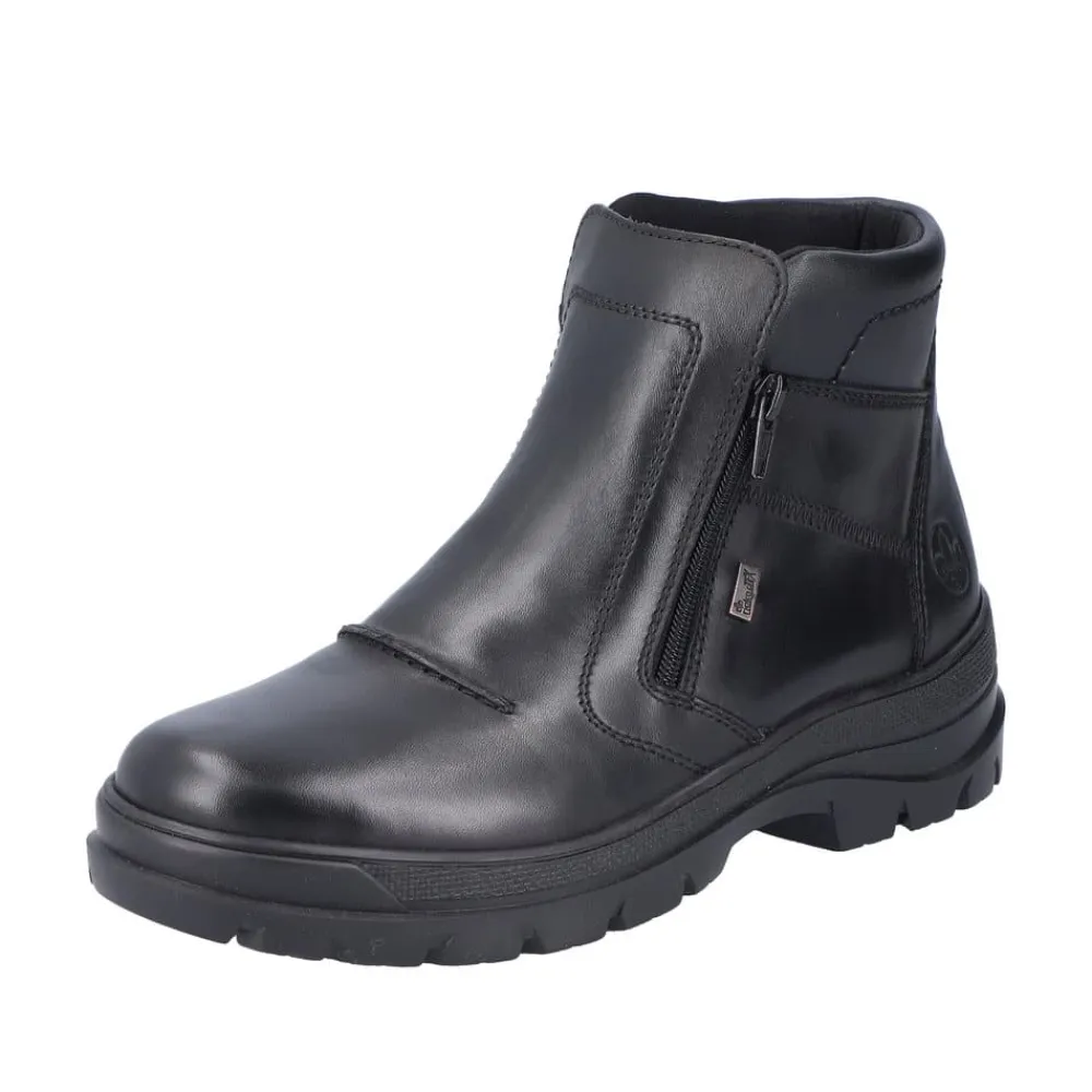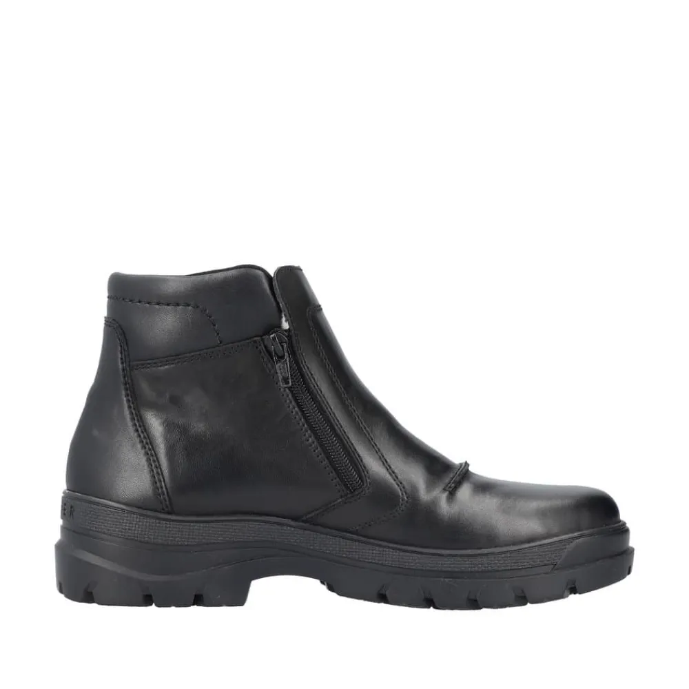 Rieker støvle til herre i sort. Smart herrestøvle i sort med moderne detaljer, der giver et stilfuldt udtryk. Støvlen er fremstillet med en skindoverdel og har to funktionelle lynlåse, som gør den nem at tage af og på. Indvendigt finder du en blød og udtagelig termosål, der sikrer god komfort, mens den varme foring holder fødderne lune. Støvlen er rummelig med ekstra bredde G og udstyret med Rieker-Tex, som gør den kraftigt vandafvisende. Den chunky ydersål har stødabsorbering og foldbare pigge, som giver øget skridsikkerhed og støtte.