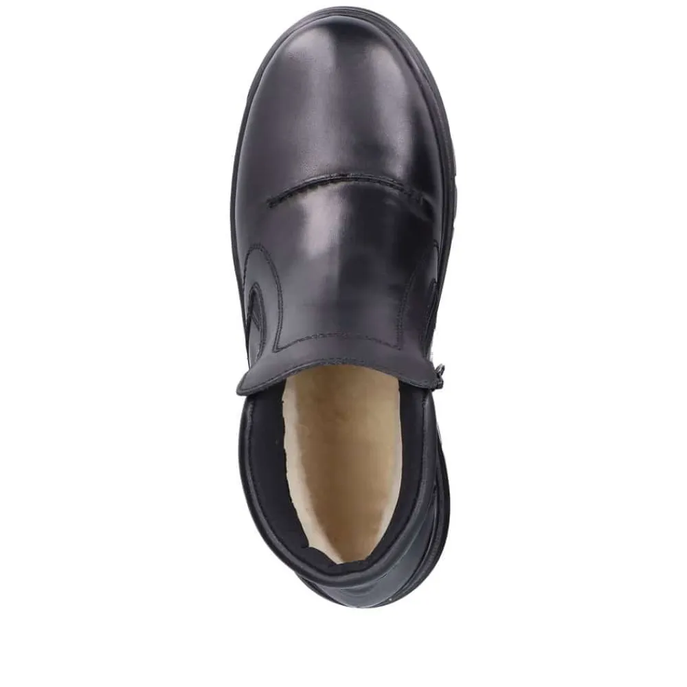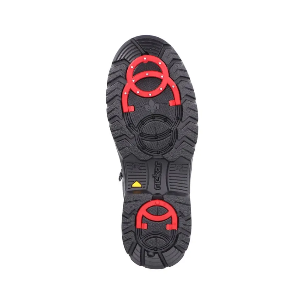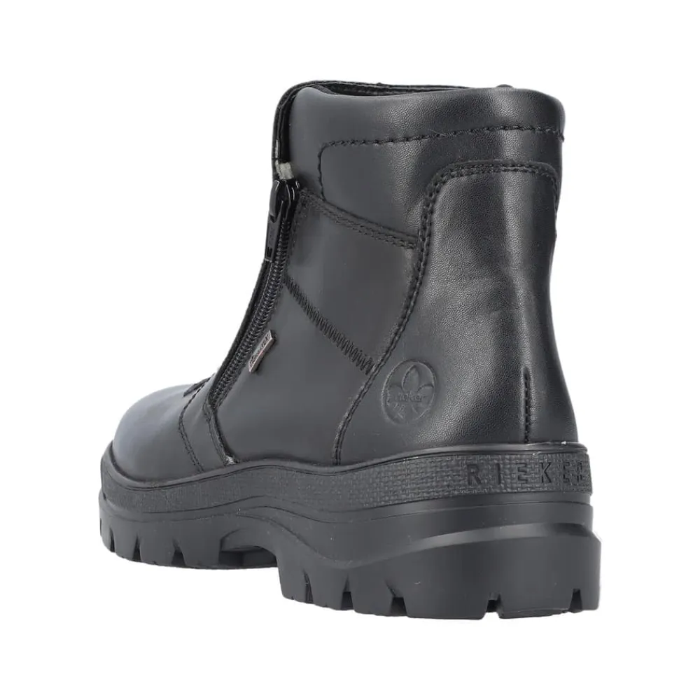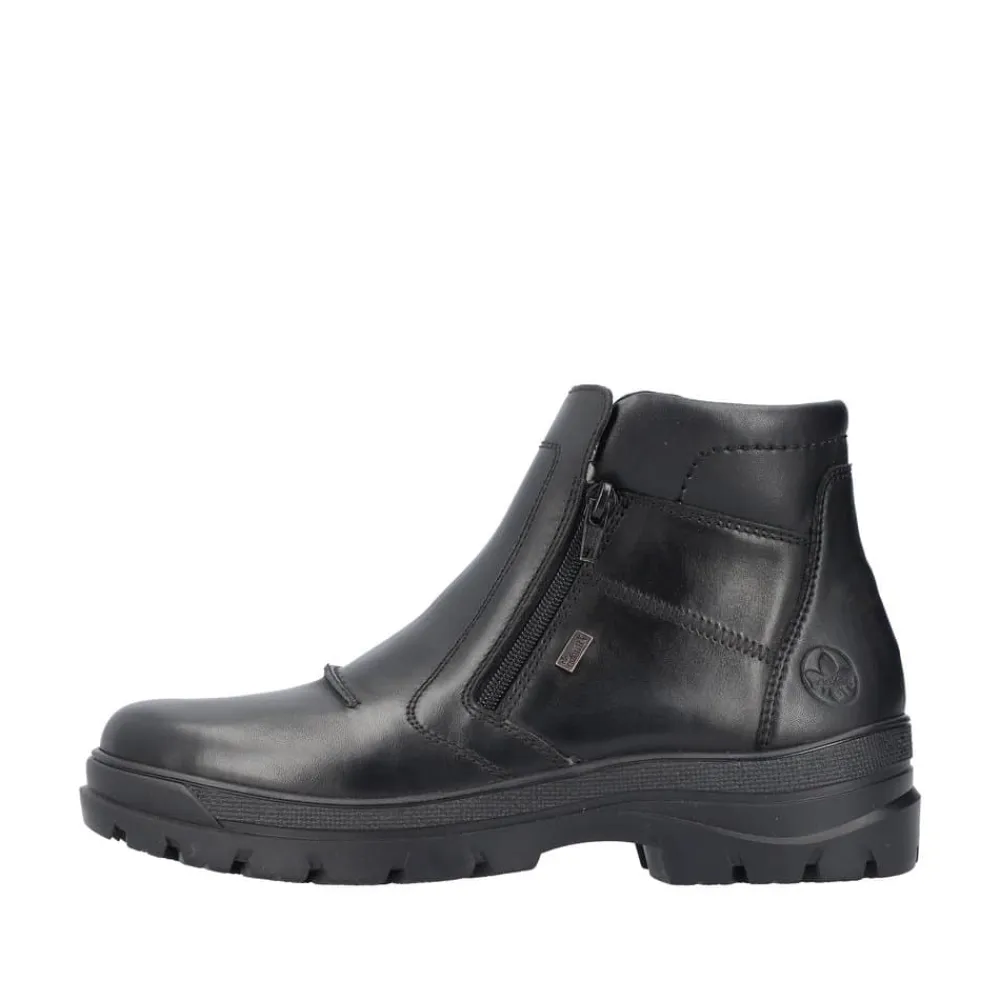Rieker støvle til herre i sort. Smart herrestøvle i sort med moderne detaljer, der giver et stilfuldt udtryk. Støvlen er fremstillet med en skindoverdel og har to funktionelle lynlåse, som gør den nem at tage af og på. Indvendigt finder du en blød og udtagelig termosål, der sikrer god komfort, mens den varme foring holder fødderne lune. Støvlen er rummelig med ekstra bredde G og udstyret med Rieker-Tex, som gør den kraftigt vandafvisende. Den chunky ydersål har stødabsorbering og foldbare pigge, som giver øget skridsikkerhed og støtte.