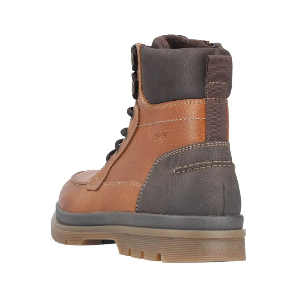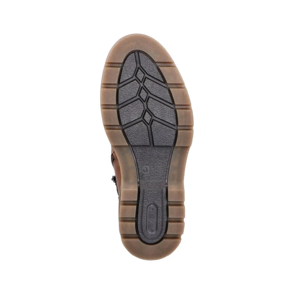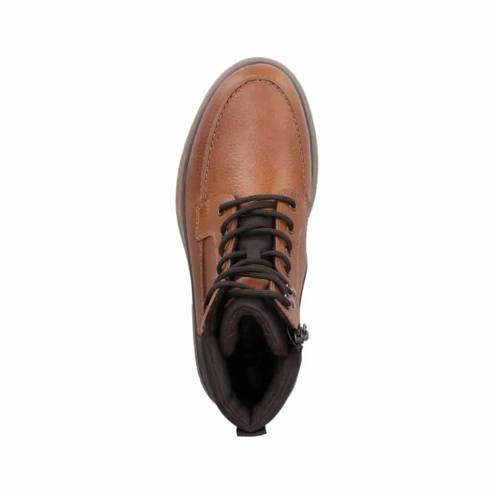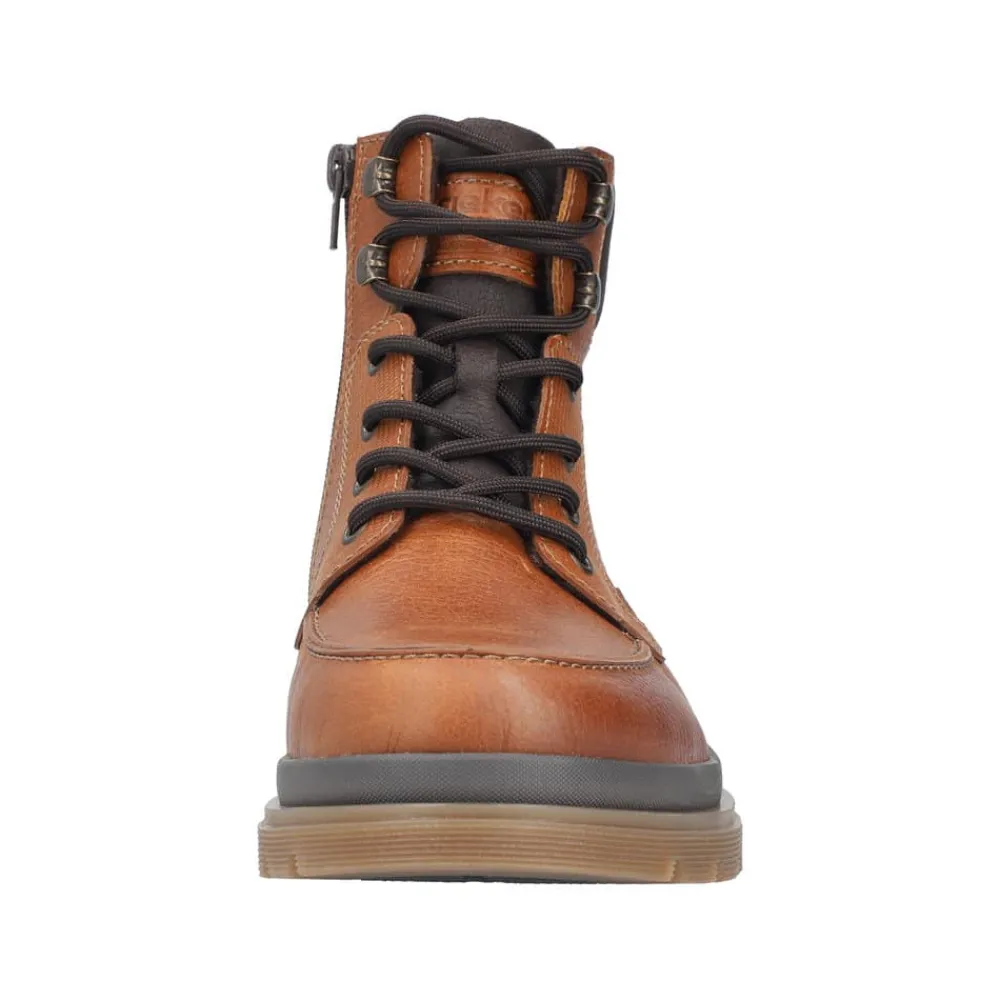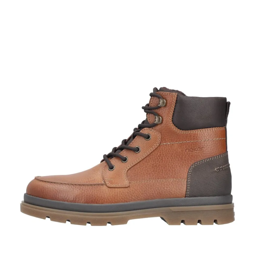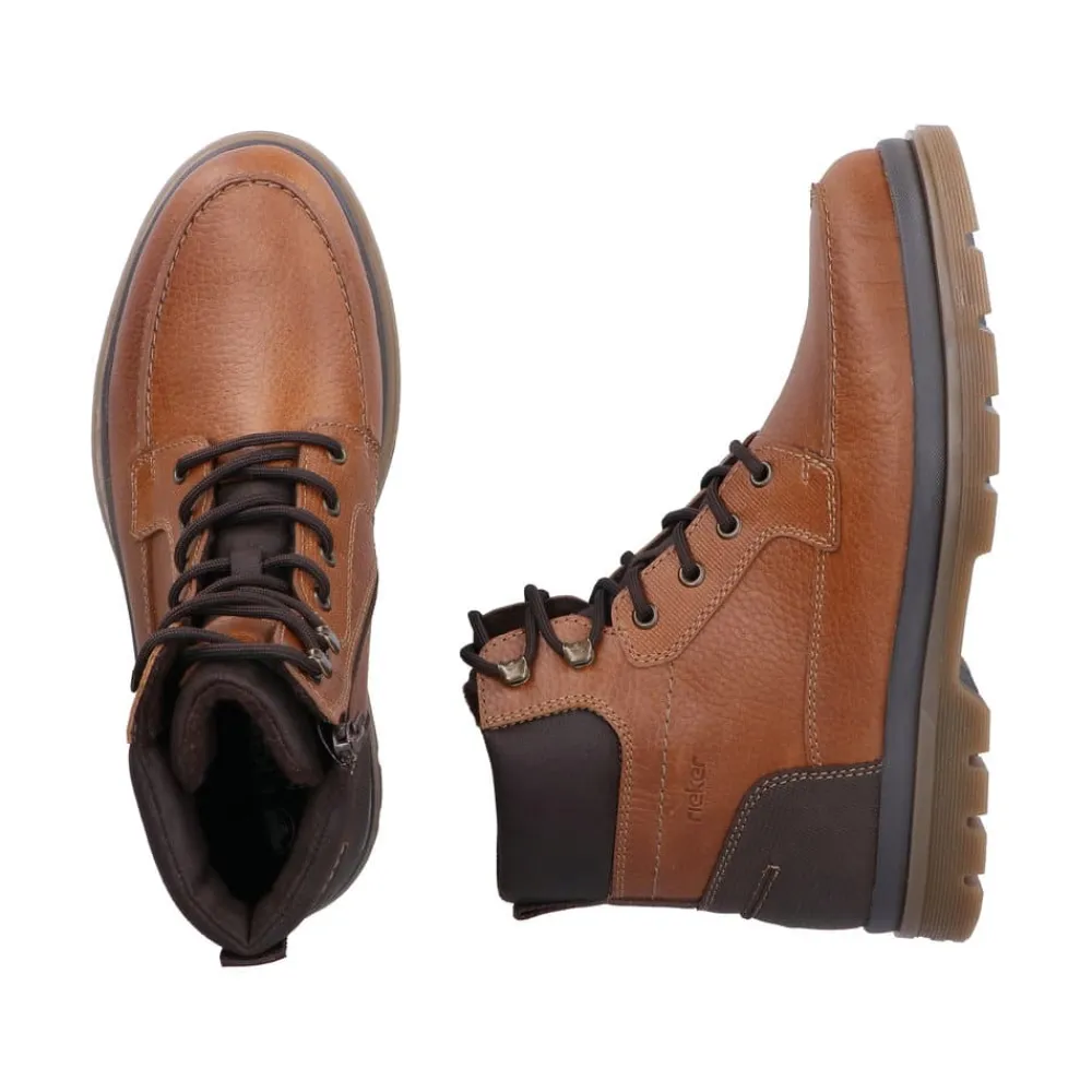 Rieker støvle til herre i brun. Denne brune støvle i skind forener moderne stil med praktiske detaljer. Snørebåndet foran gør det let at justere pasformen, og lynlåsen på siden gør modellen hurtig at tage af og på. Indvendigt mødes du af en blød udtagelig sål og en let foring, mens den ekstra bredde (H) giver mere plads og fleksibilitet til foden. Ydersålen med mønster giver både øget stødabsorbering og skridsikkerhed, så støvlen er behagelig at bruge hele dagen.