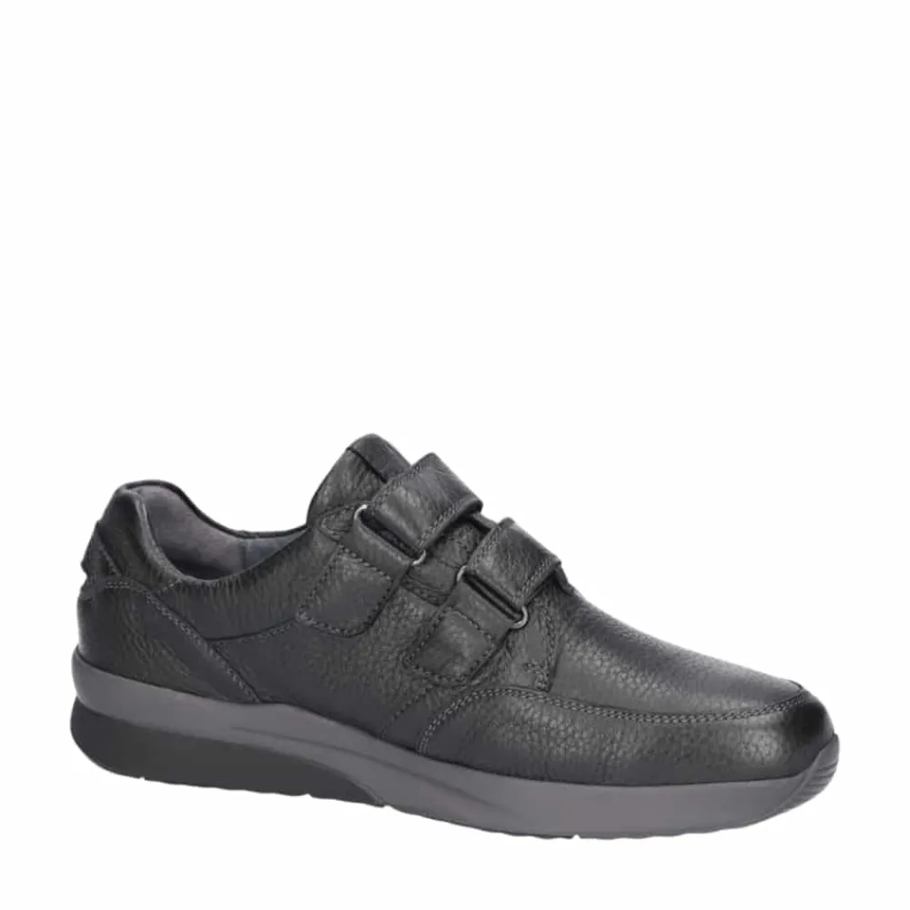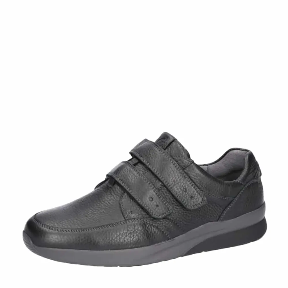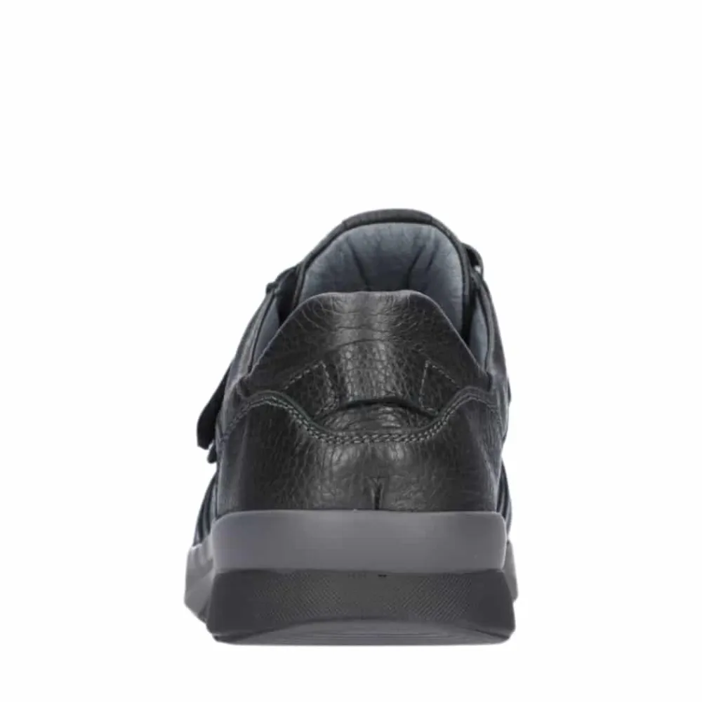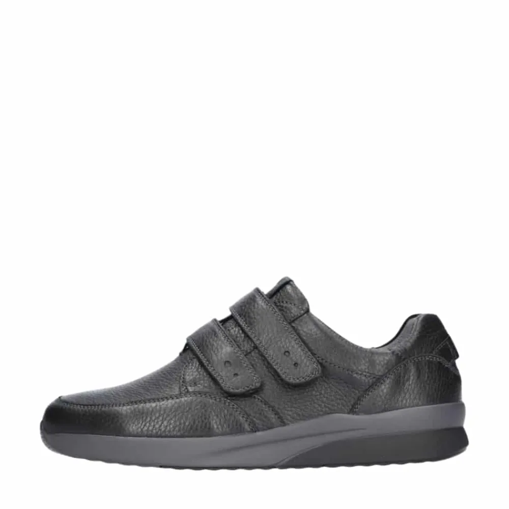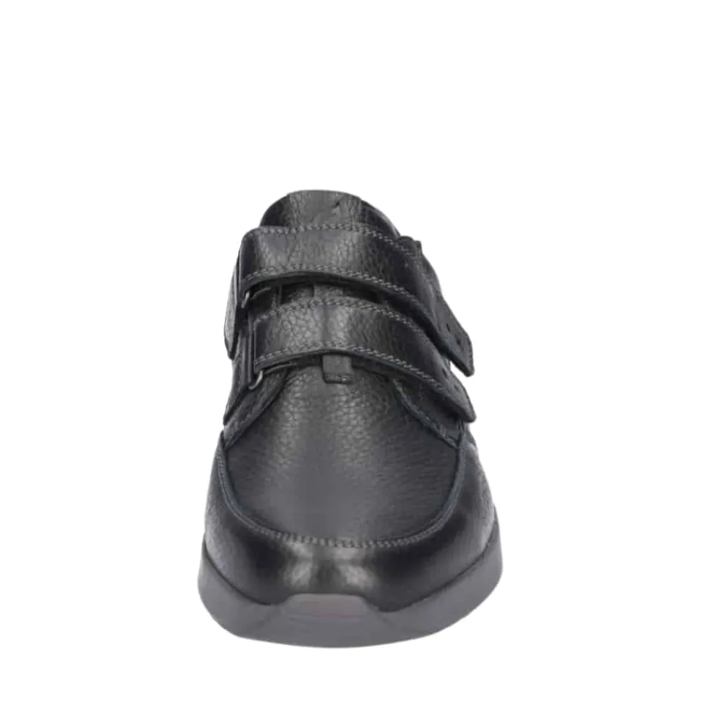 Waldläufer sko til herre i sort. Smart sko i en klassisk sort farve med markerede syninger der givet stilfuldt udtryk. Skoen har en overdel 100% skind samt to velcroremme der gør det let at komme i og af skoen. Skoen er designet med ekstra bredde K, der giver en rummelig og behagelig pasform. Indvendigt bliver du mødt af en blød og udtagelig indersål af skind, mens den solide ydersål med et godt mønster giver øget støtte og skridsikkerhed.